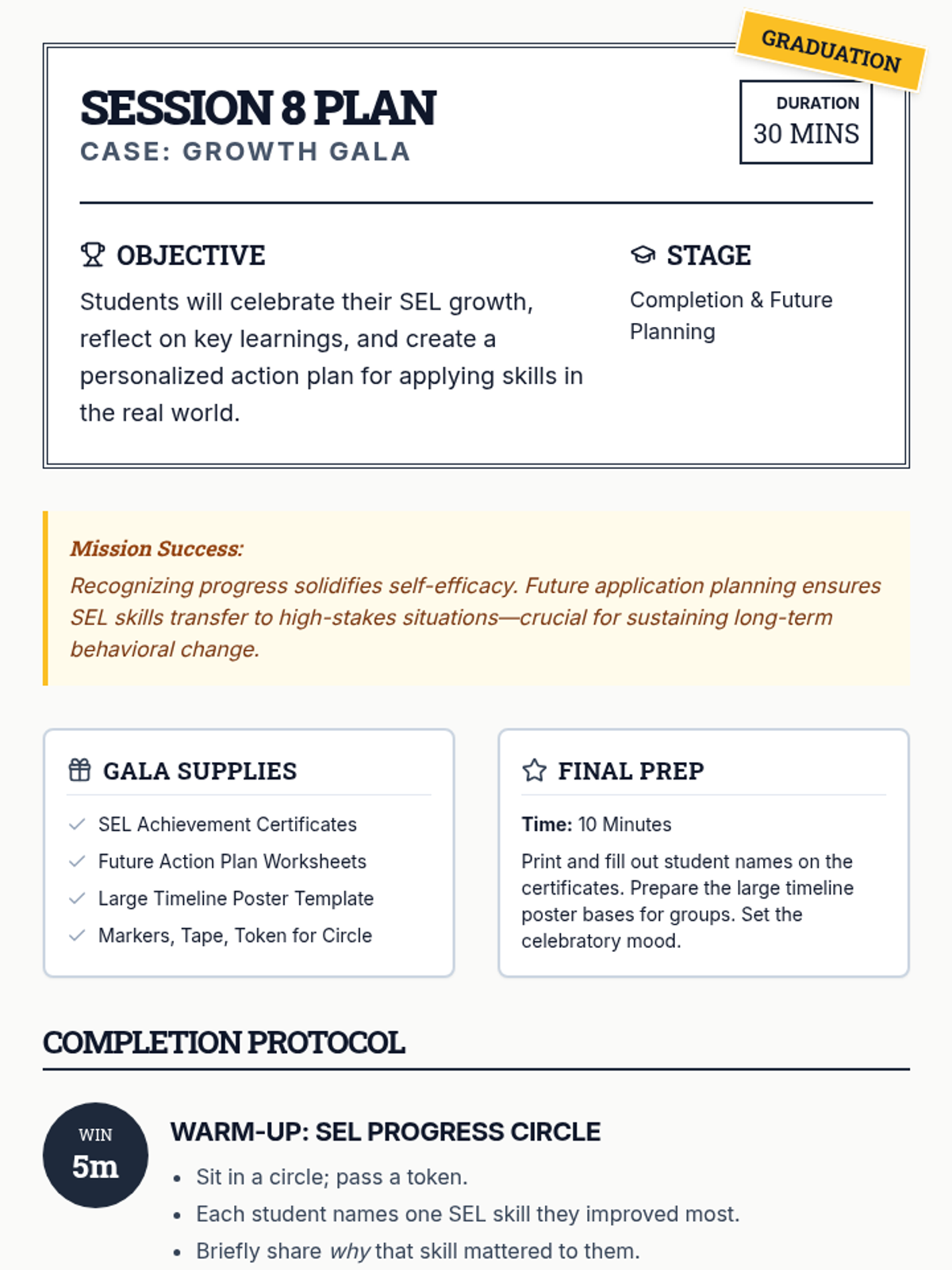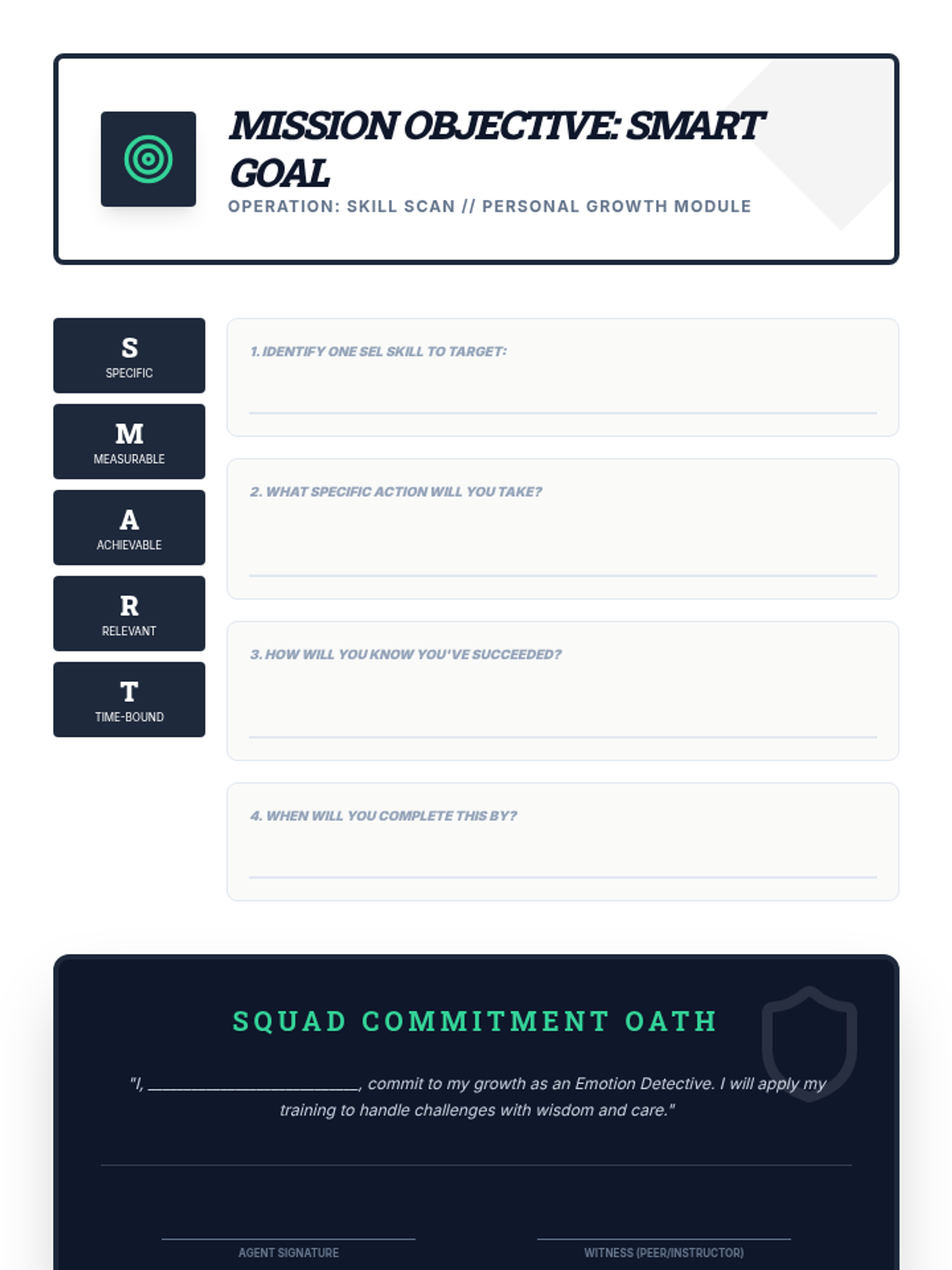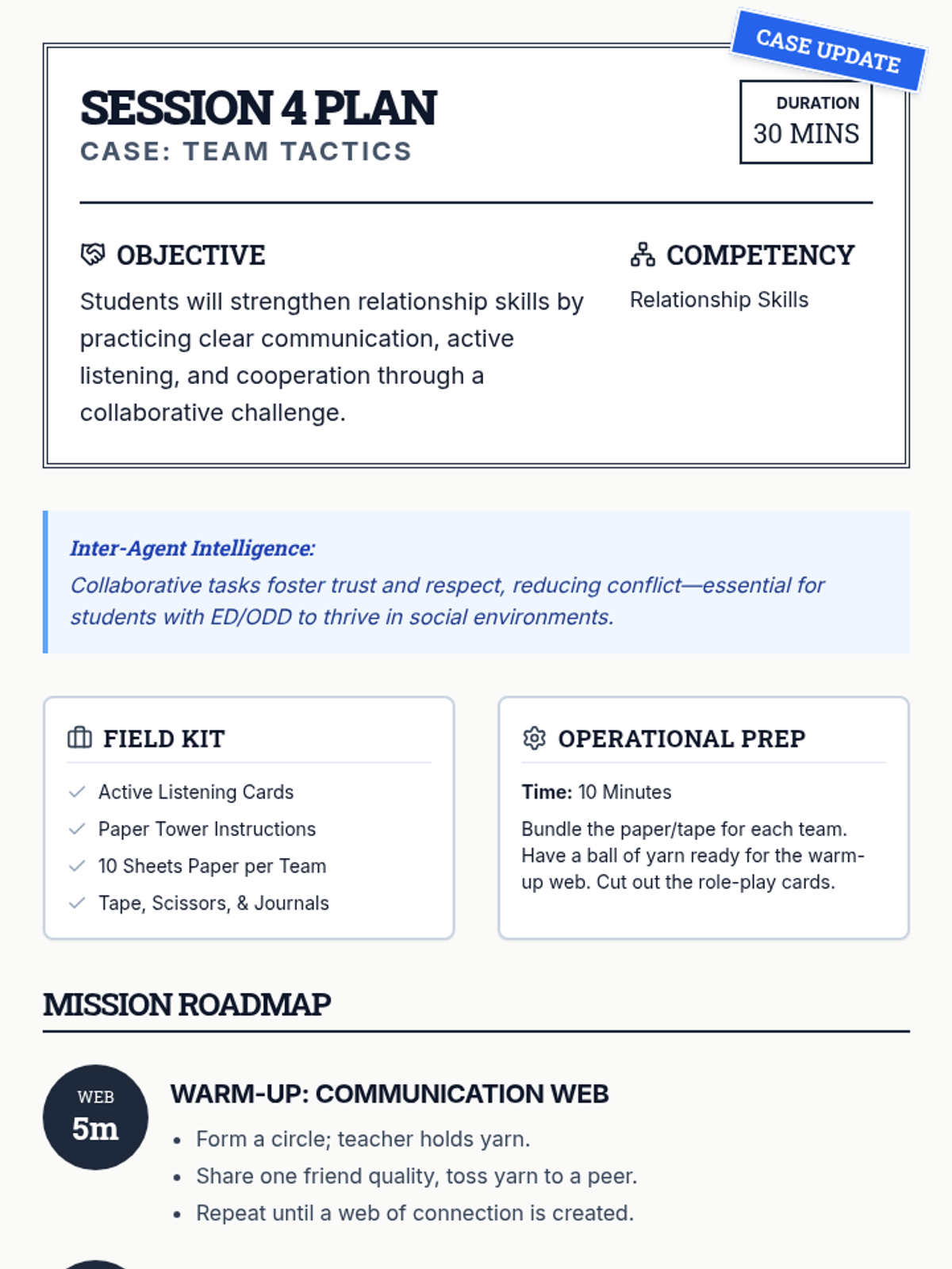 An 8-session intensive social-emotional learning program designed for middle school students with emotional disturbances and ODD, using a detective-themed approach to master self-awareness and relationship skills.