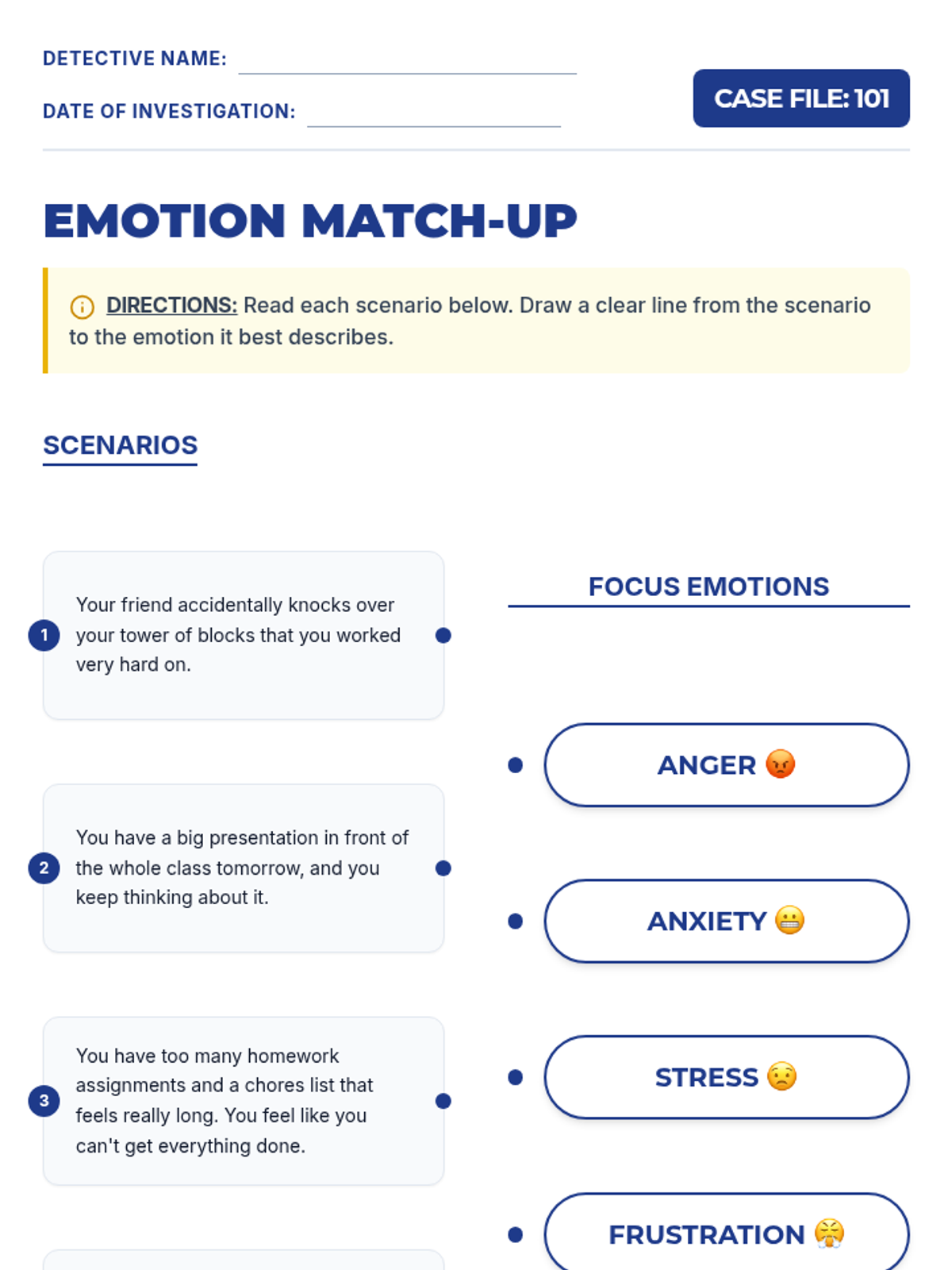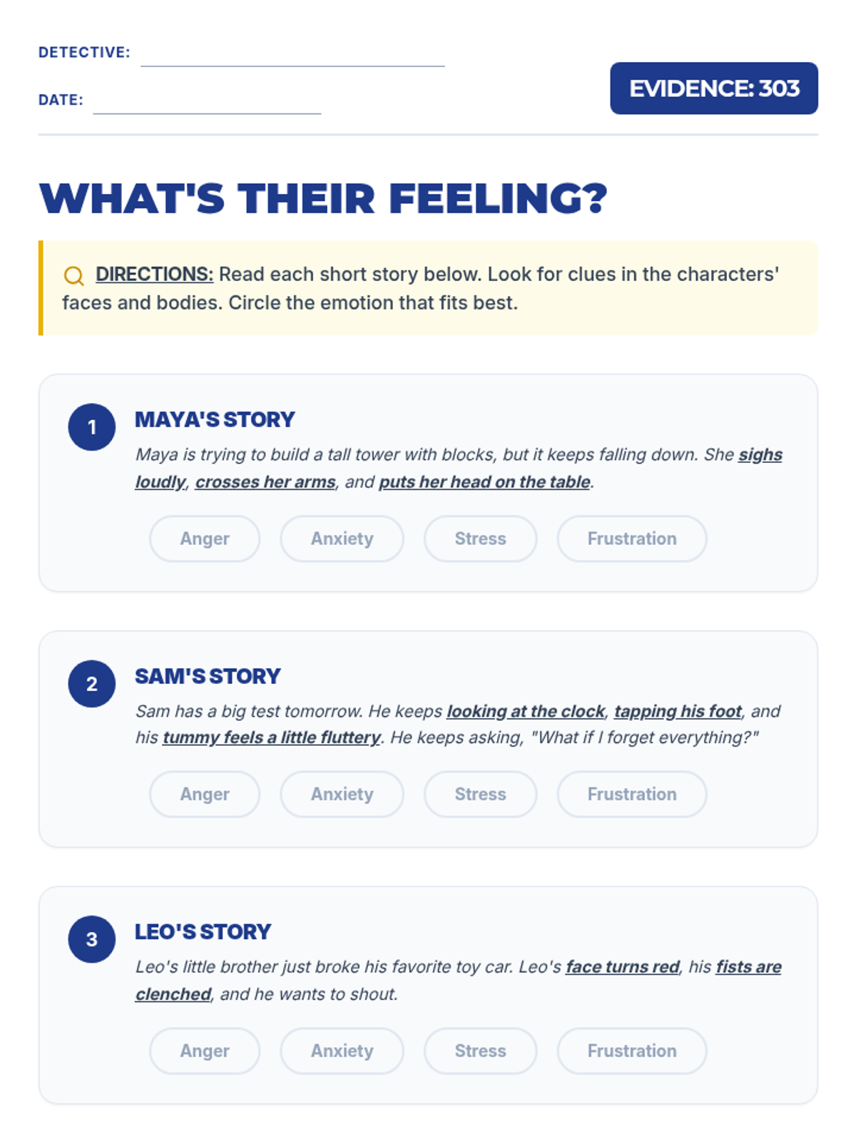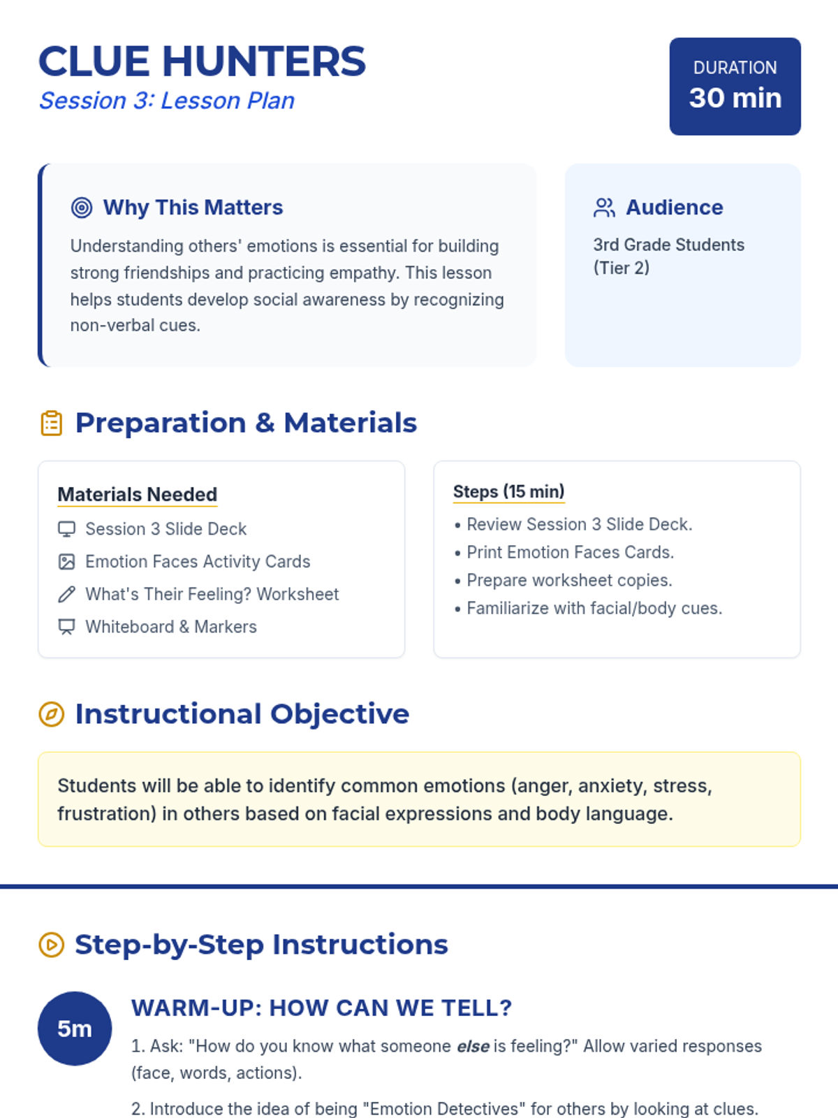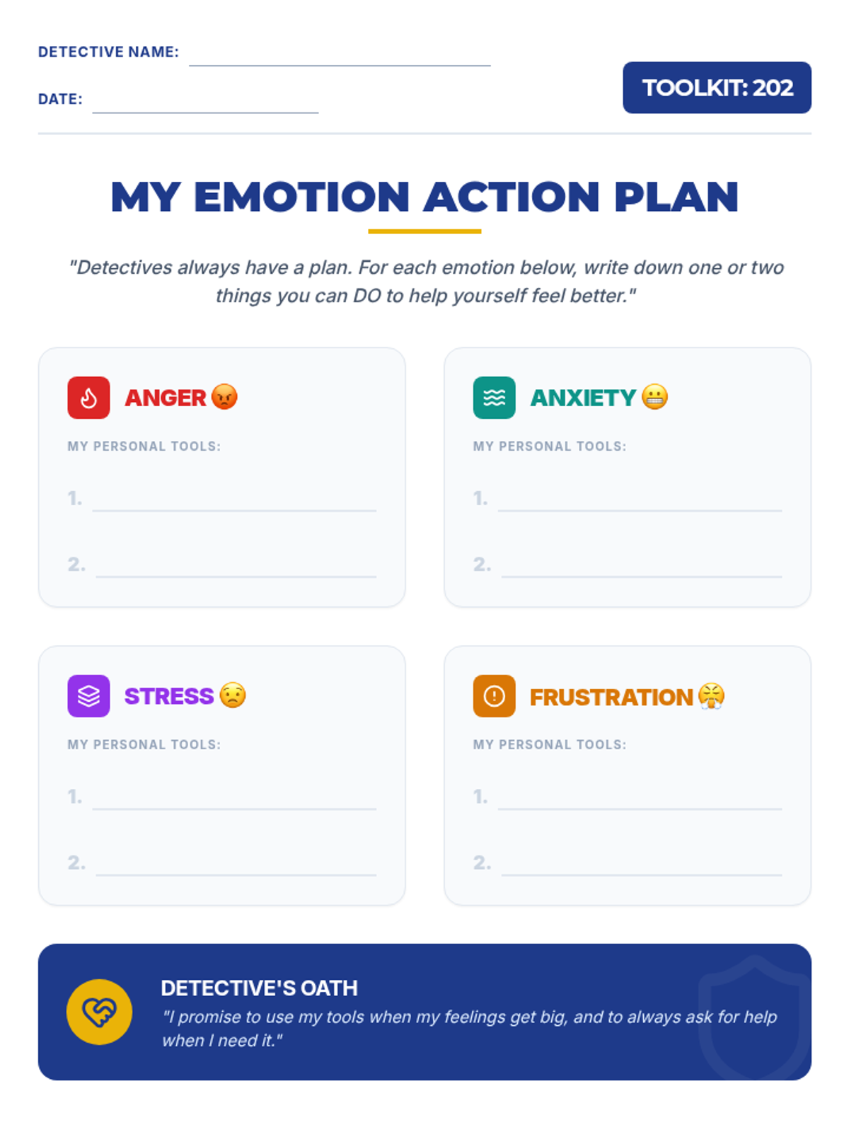 A 6-week Tier 2 social-emotional learning series for 3rd graders focused on identifying, managing, and expressing complex emotions through a detective-themed lens.