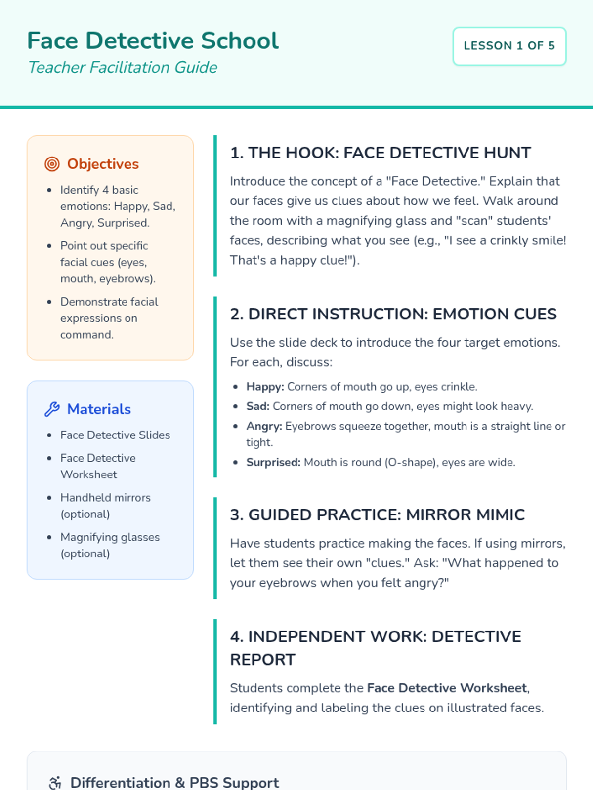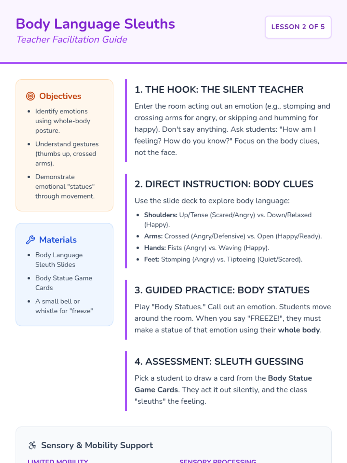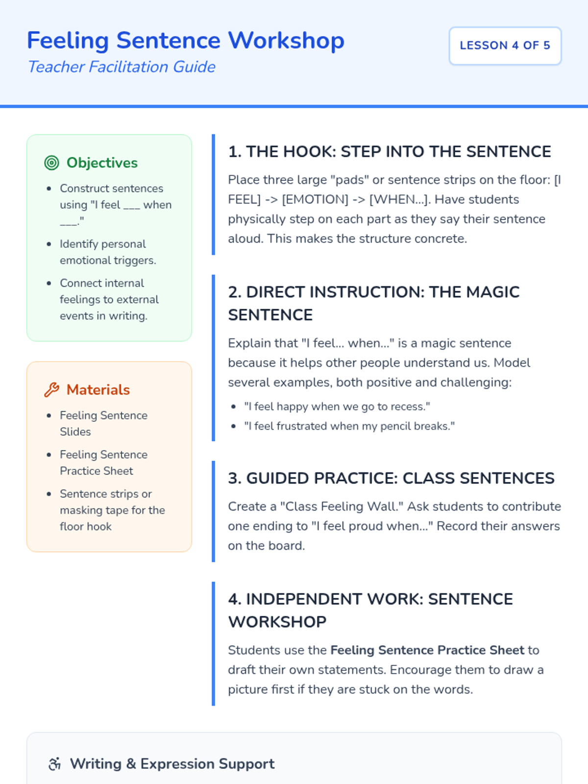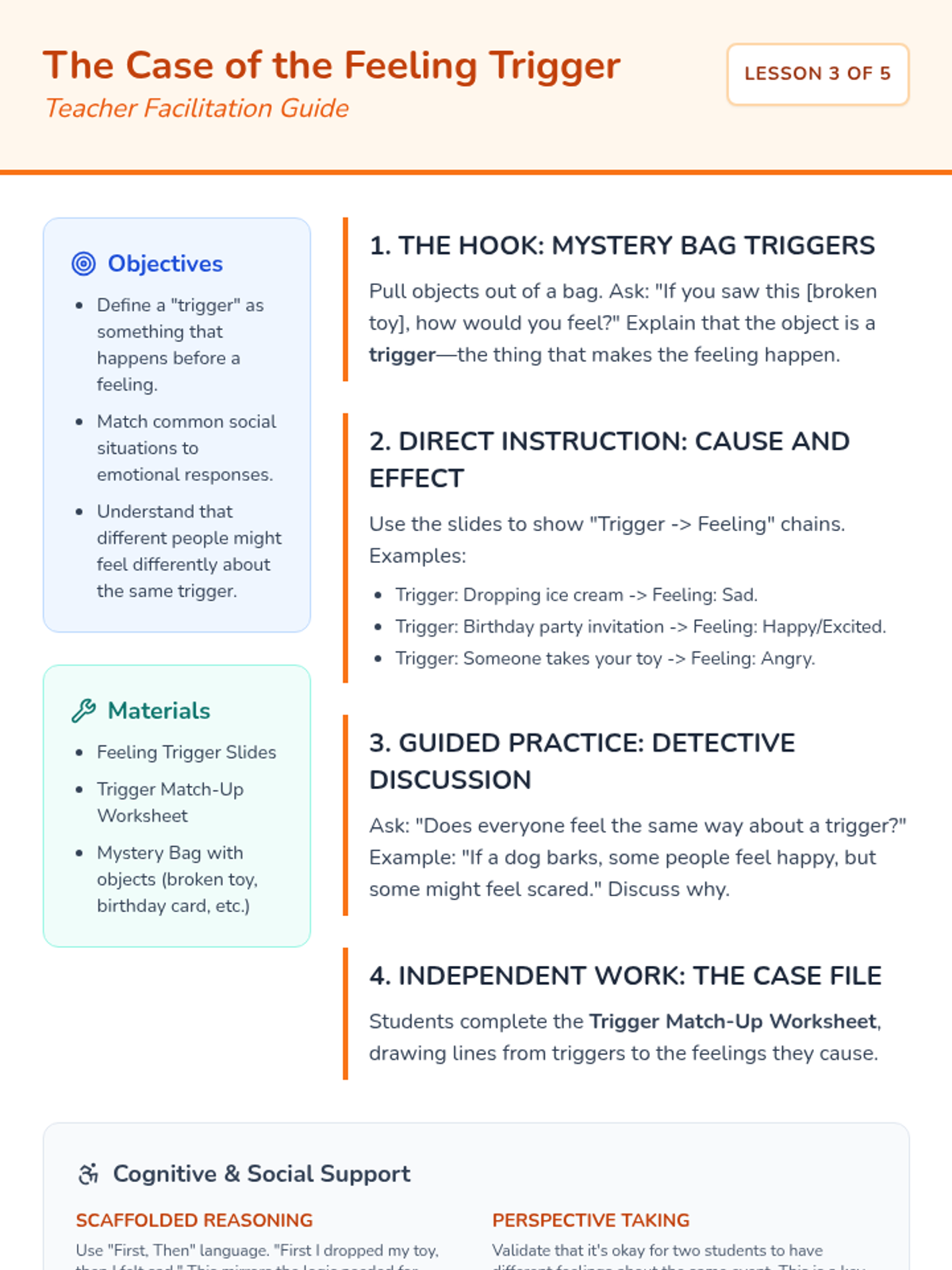 This 1st Grade sequence teaches students to identify facial expressions and body language, link triggers to emotions, and construct 'I feel' statements. These foundational skills prepare students to create their own personal social stories for self-regulation and social understanding.