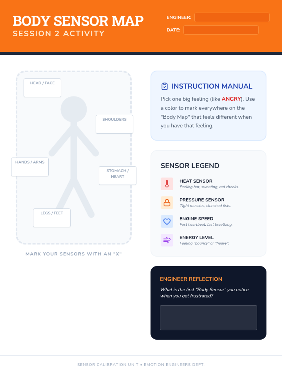 A 6-week emotional regulation small group curriculum for 2nd-grade boys titled 'Emotion Engineers'. The program focuses on identifying emotions, body signals, calming strategies, empathy, and social problem-solving through a construction and engineering theme.