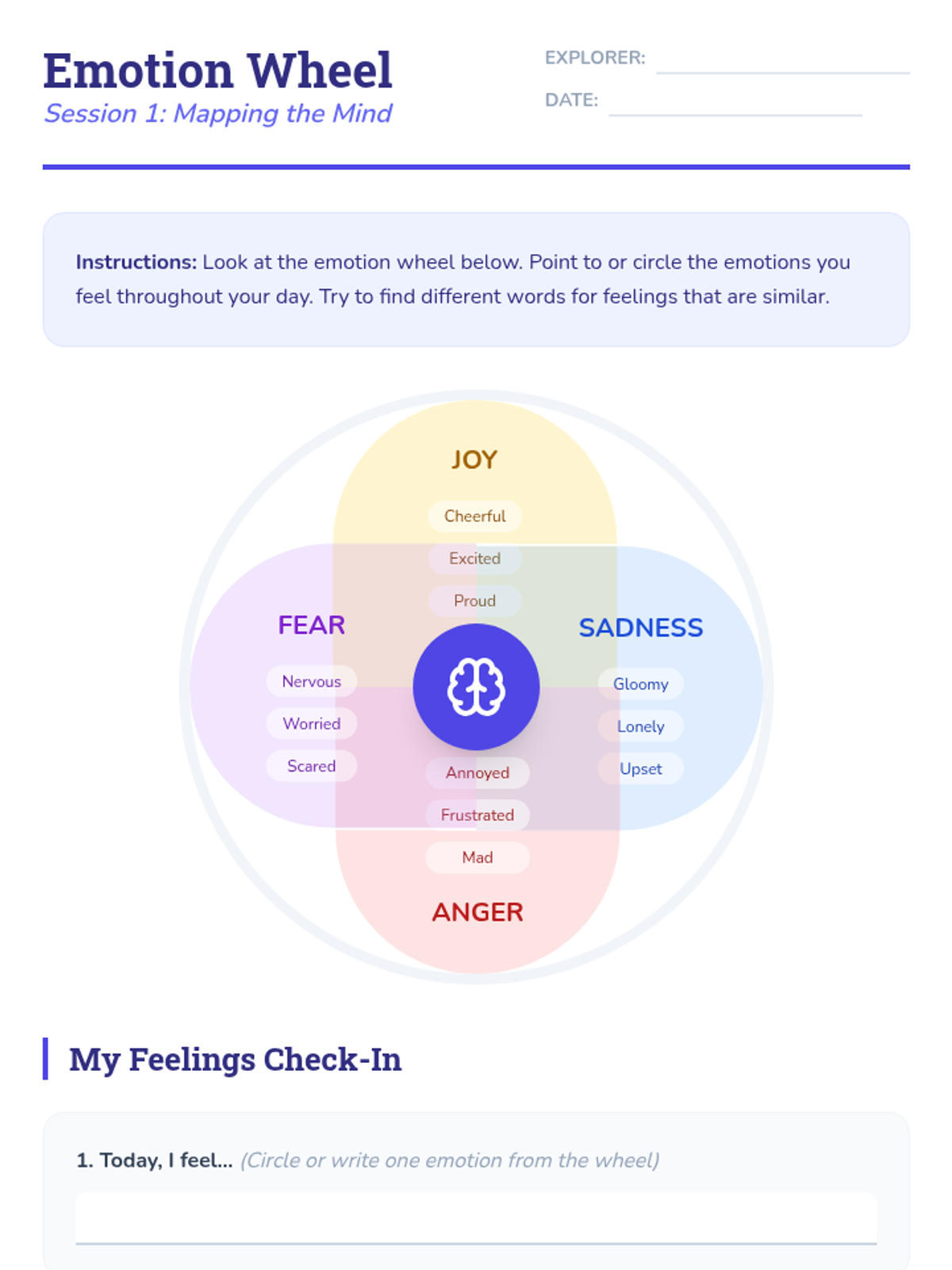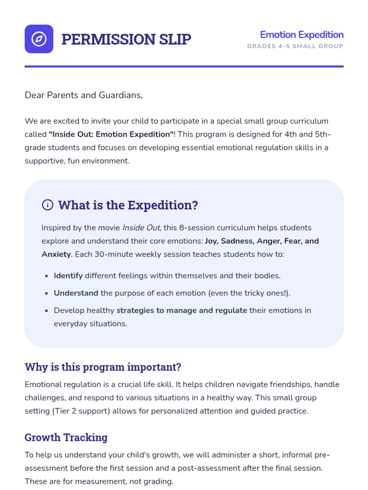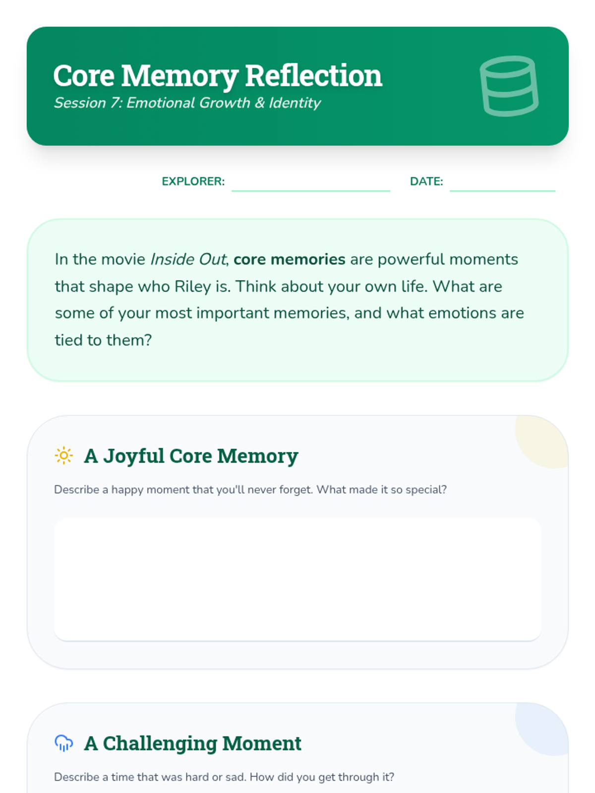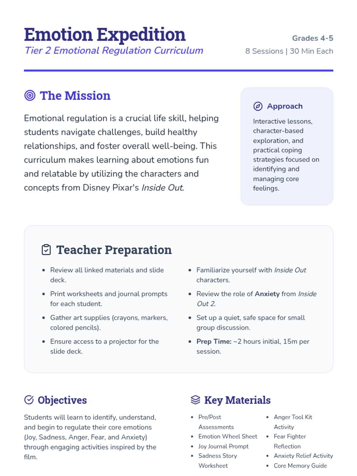 An 8-session Tier 2 emotional regulation curriculum for 4th and 5th graders using characters from Inside Out. Students explore identifying and managing Joy, Sadness, Anger, Fear, and Anxiety through interactive activities and reflection.