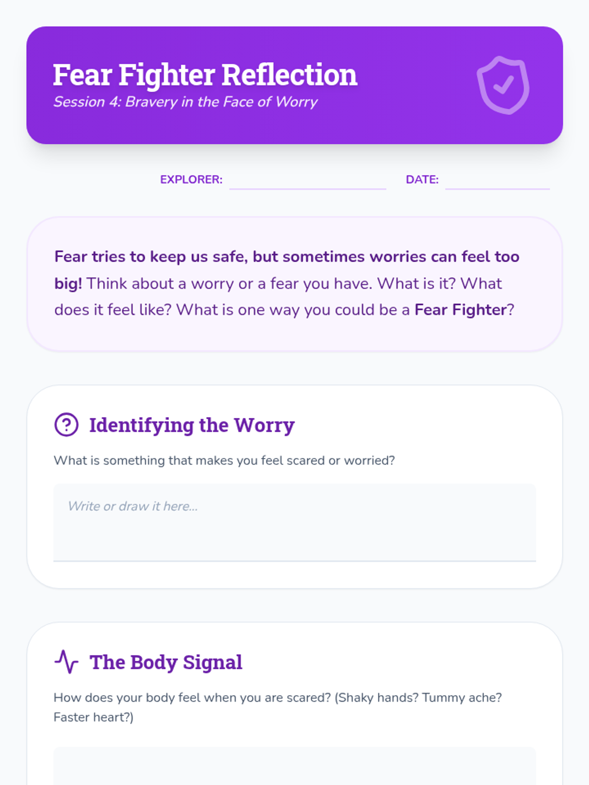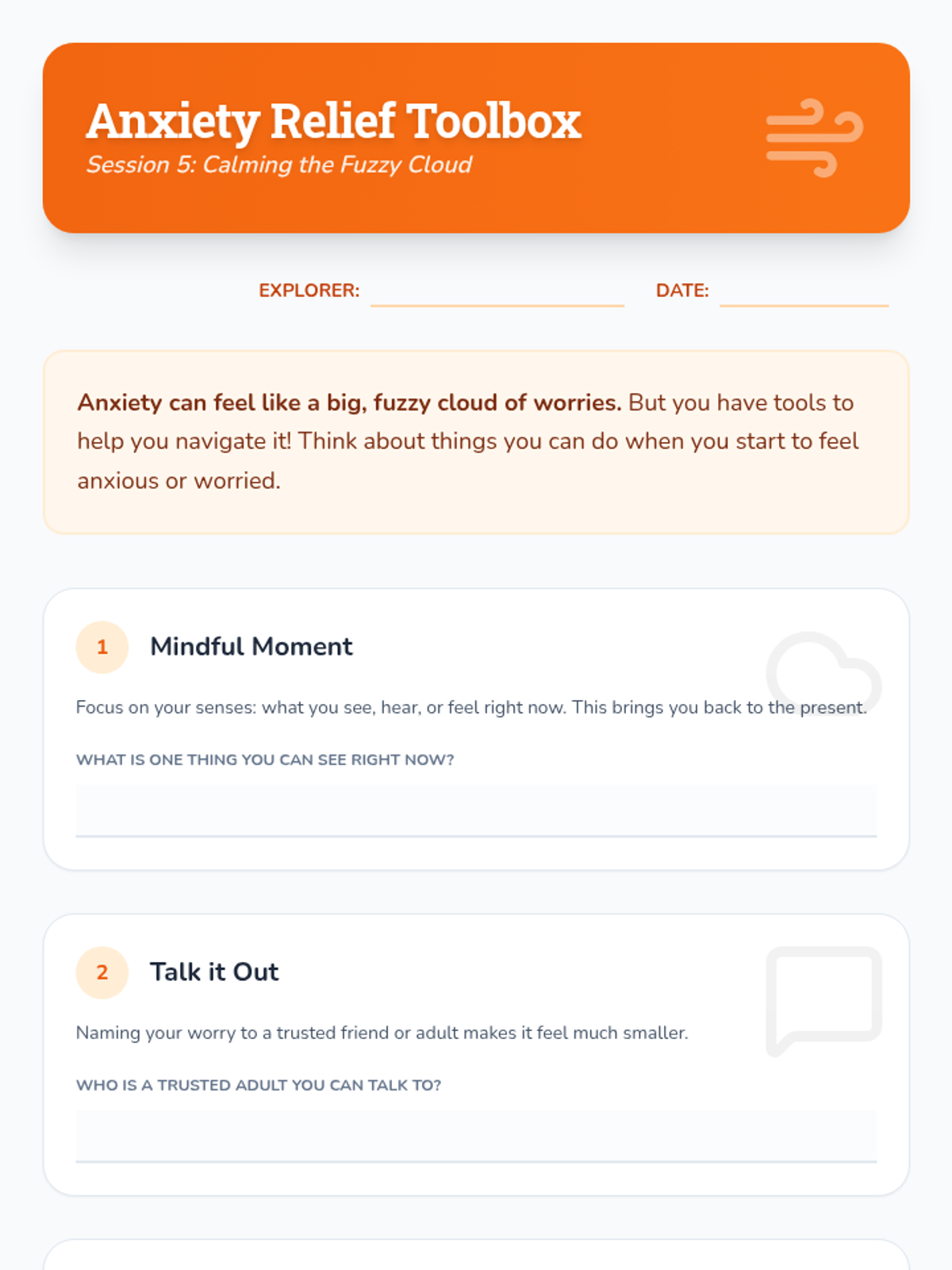 A 6-session counseling group designed to help students identify triggers, understand physical symptoms of anxiety, and build a personalized toolkit of coping strategies through a 'Calm Explorer' theme.