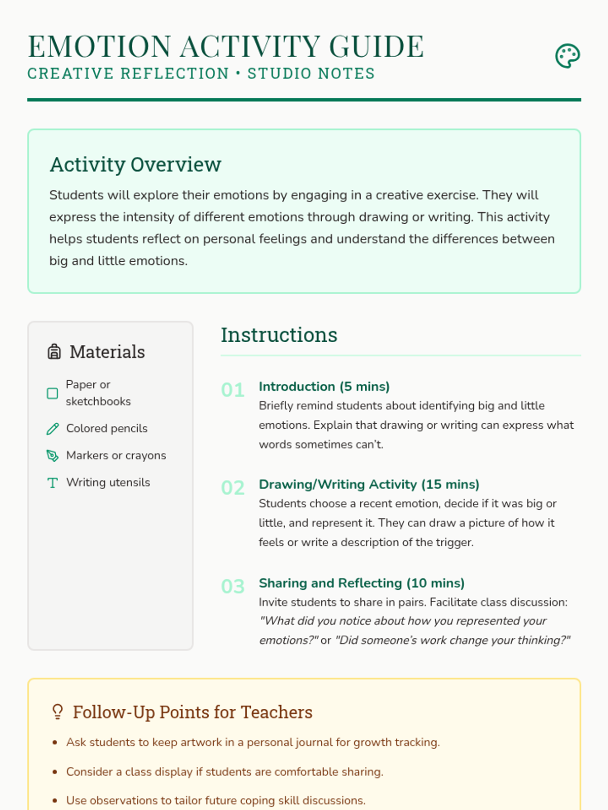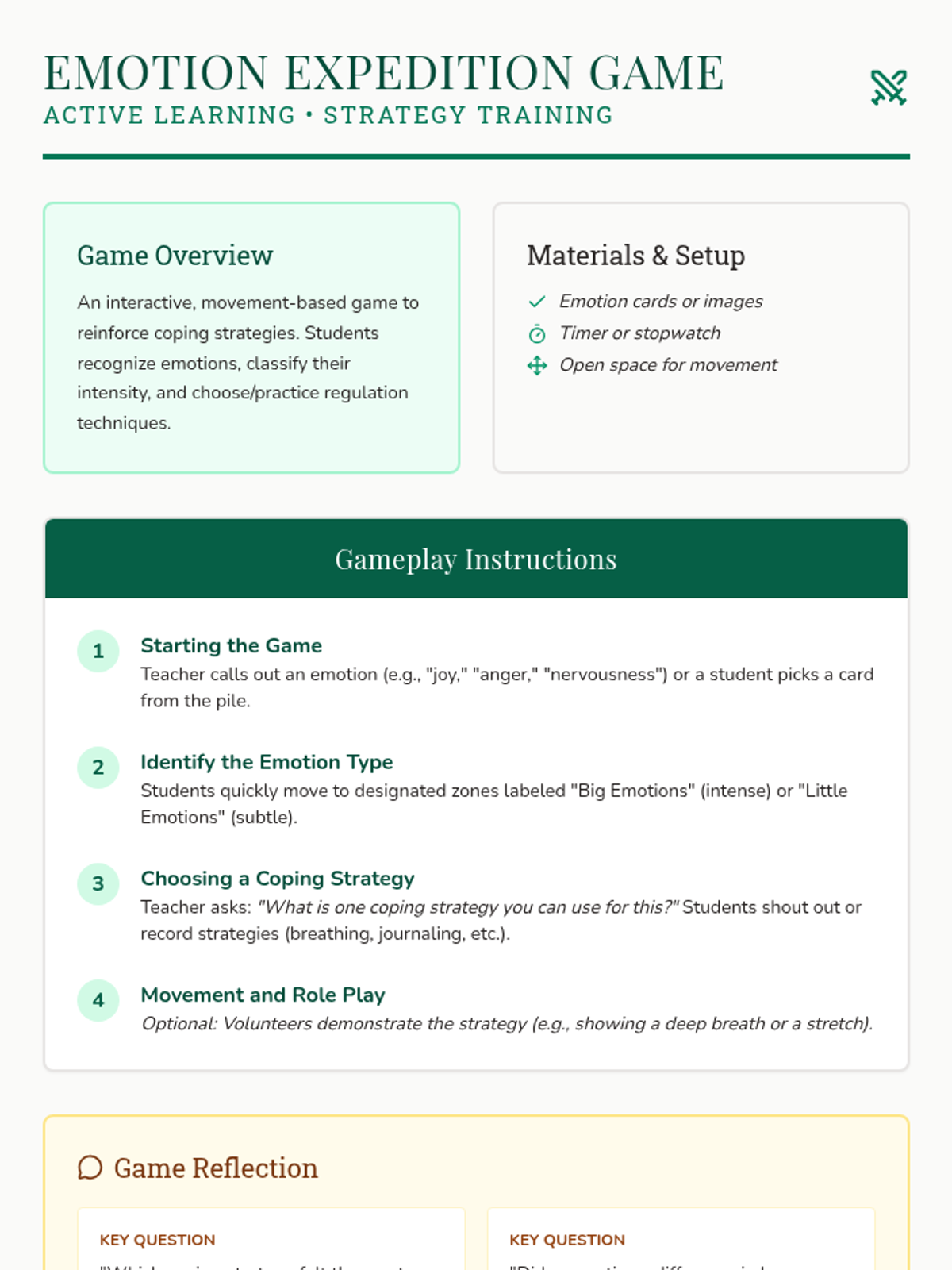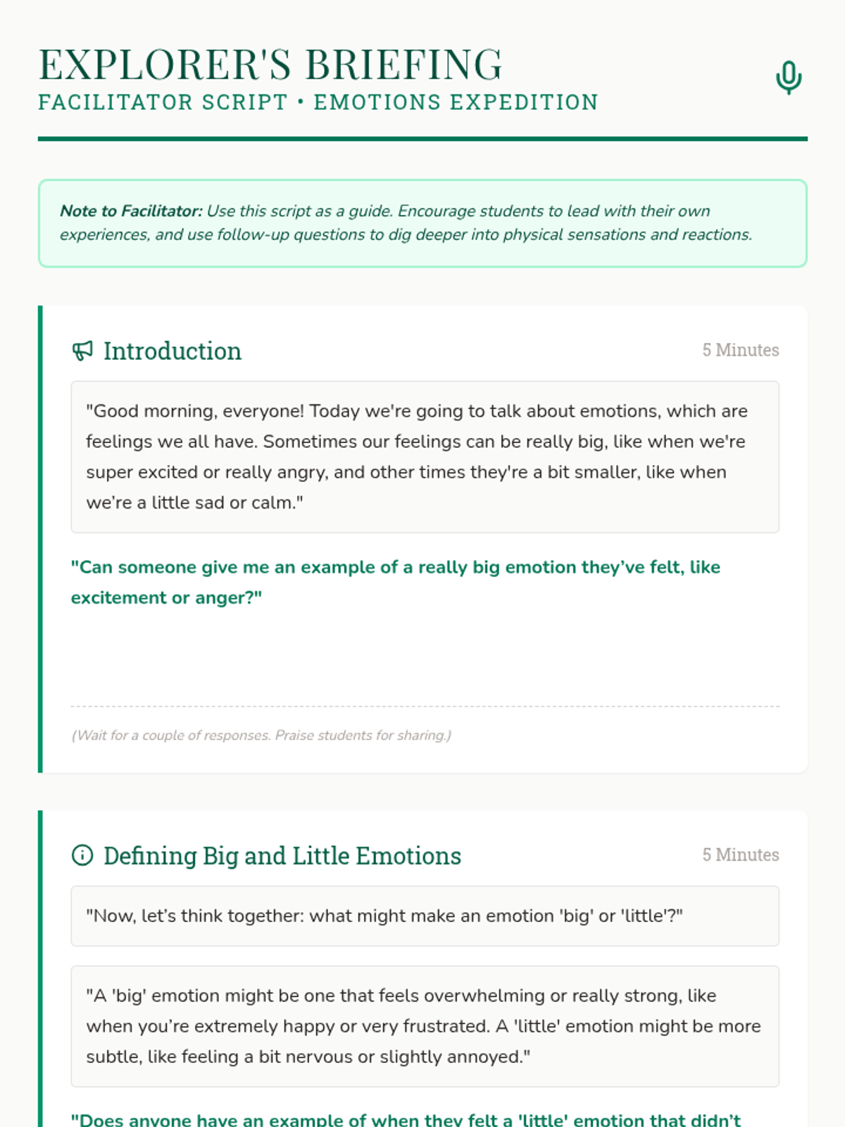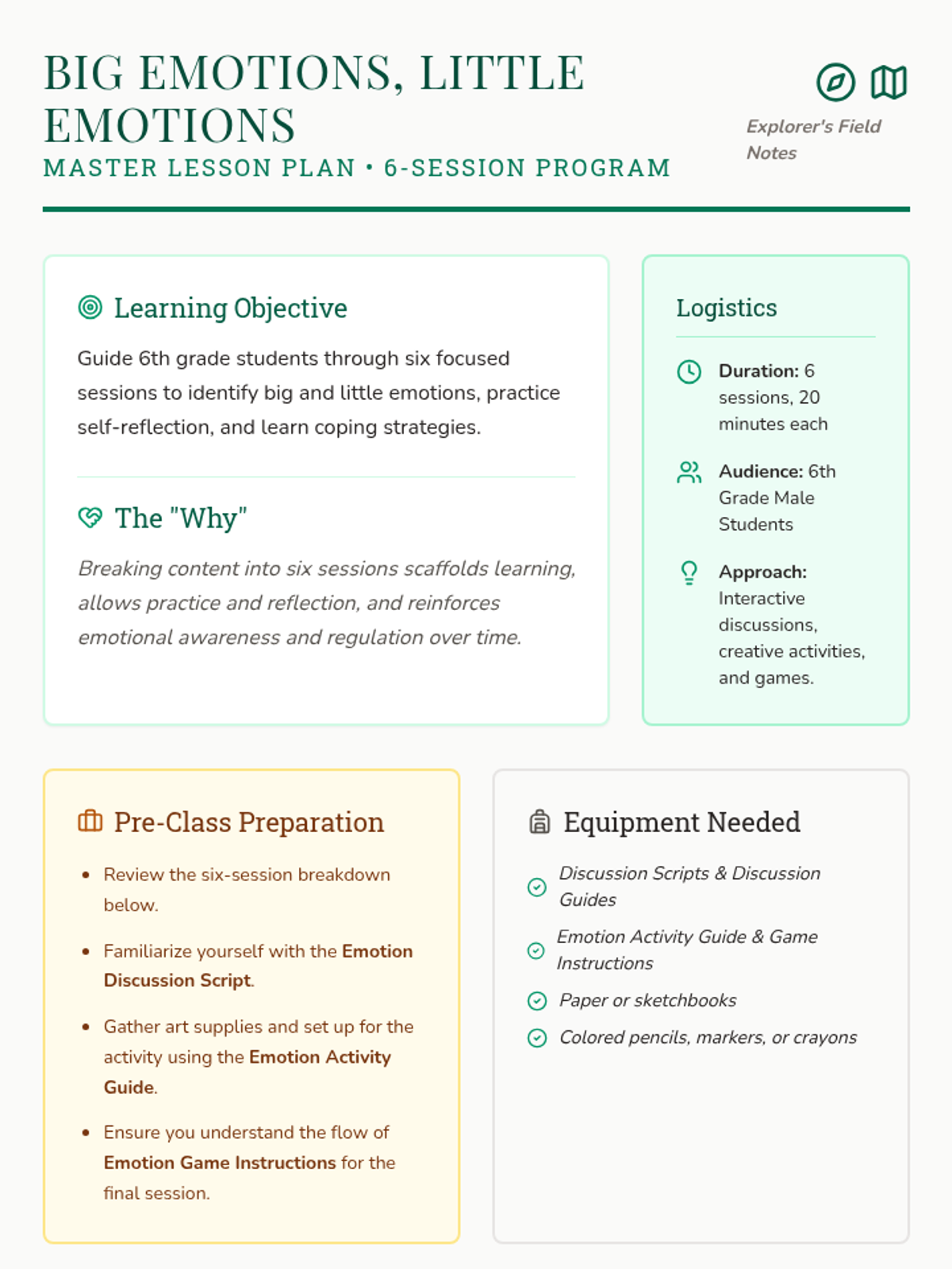 A comprehensive emotional intelligence program designed for 6th-grade students to recognize and manage big and little emotions through both group sessions and individualized Tier 3 support. The program uses a 'field guide' theme to encourage exploration and self-discovery.