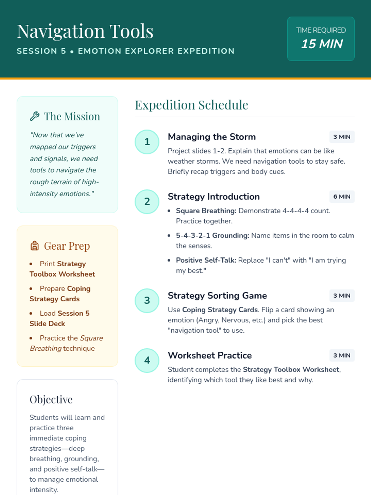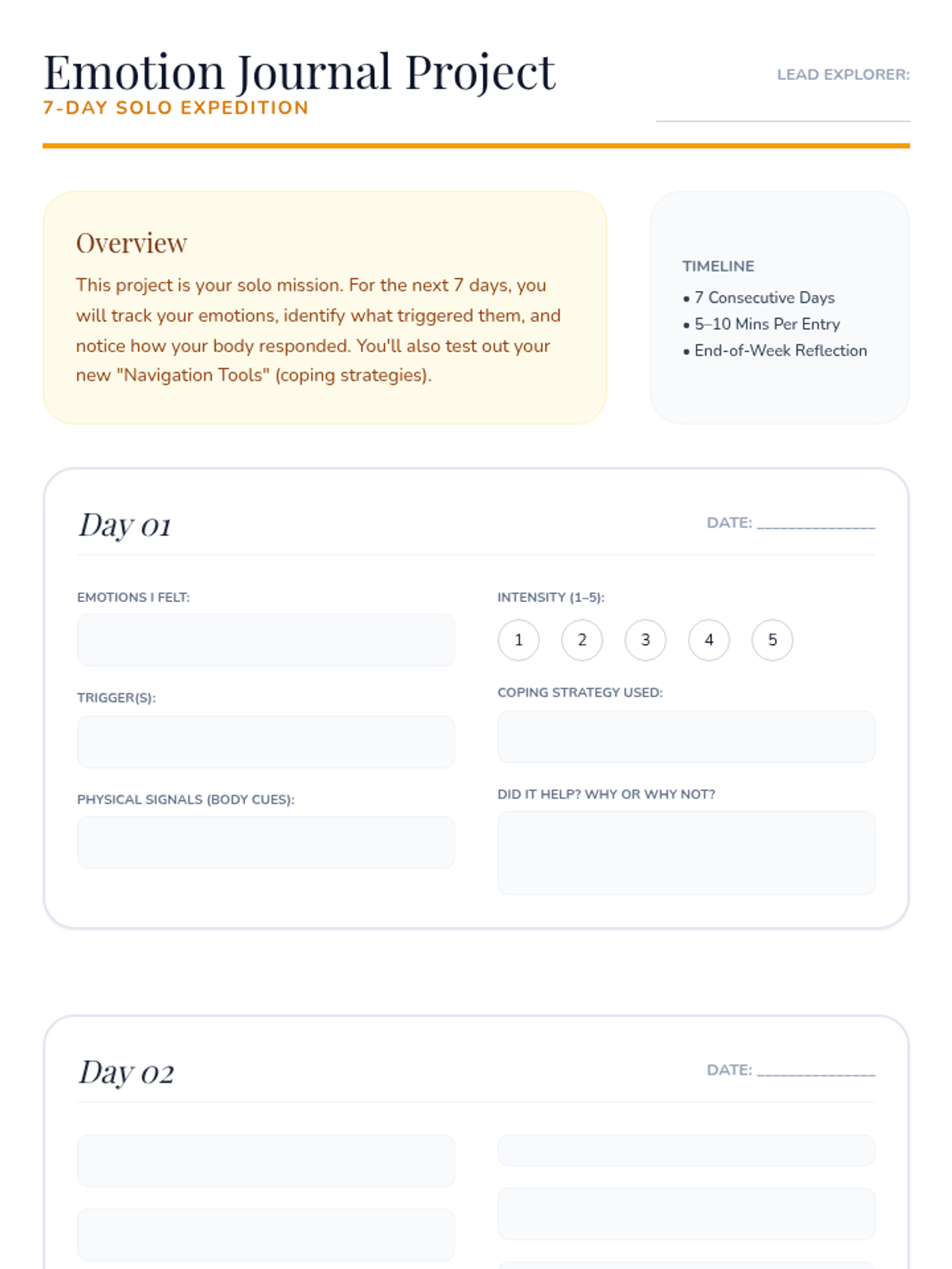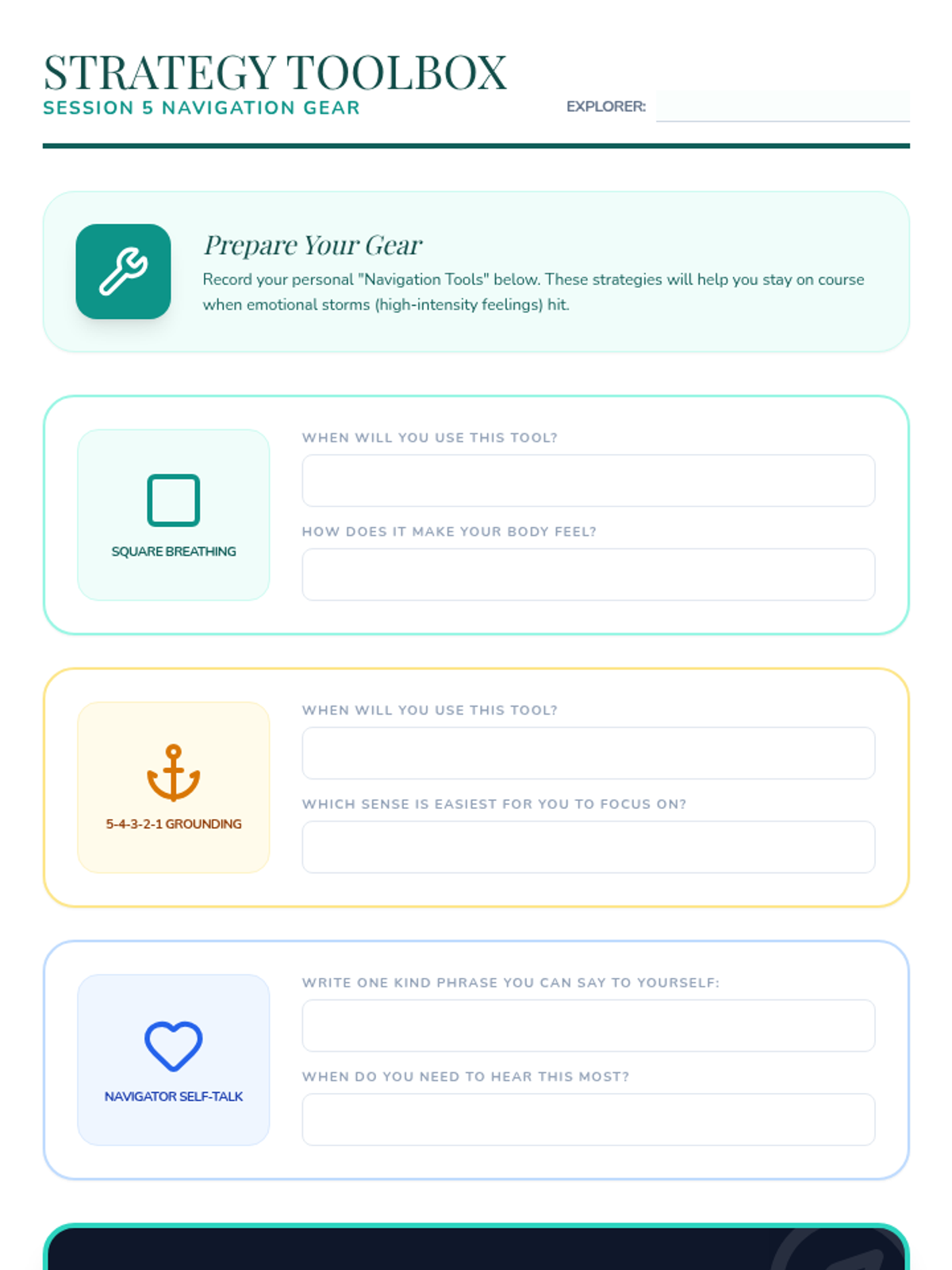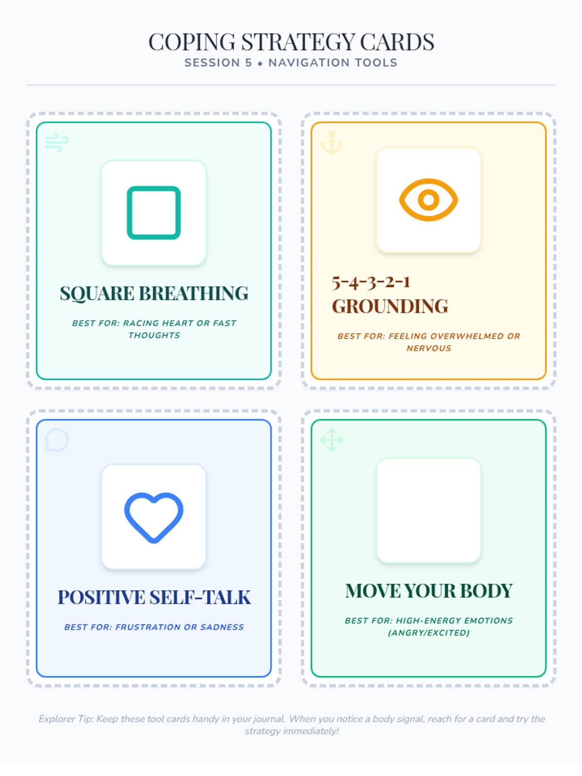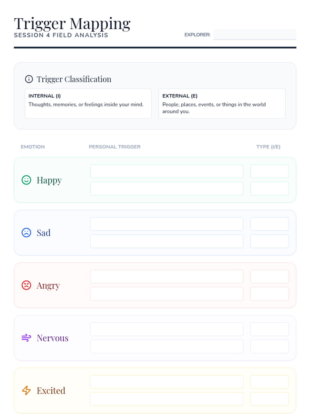 A 6-session mini-course for middle school students to build emotional intelligence by identifying triggers, bodily signals, and coping strategies through an explorer-themed lens.