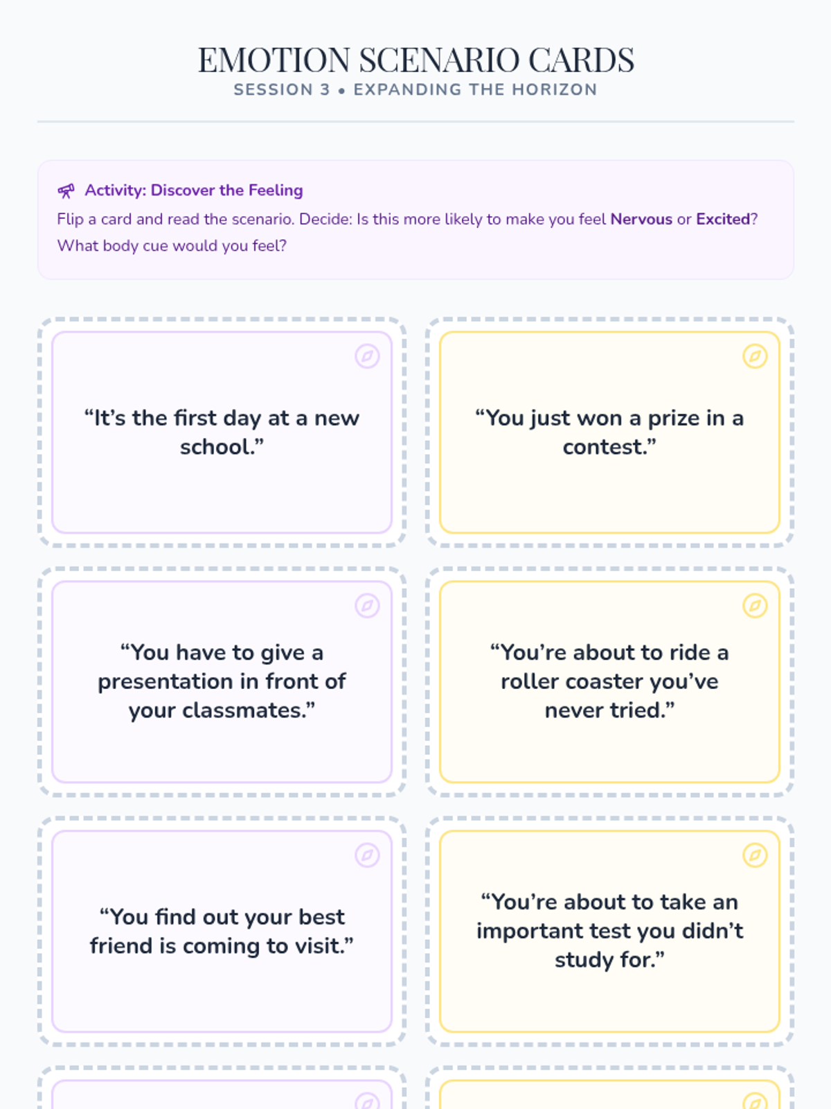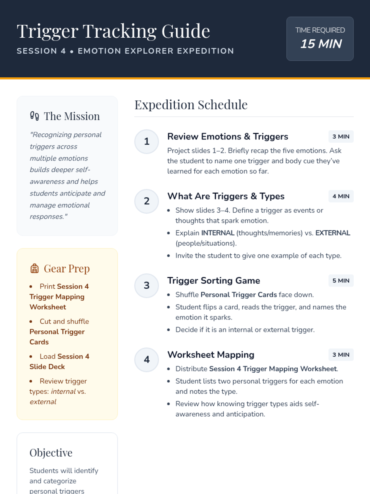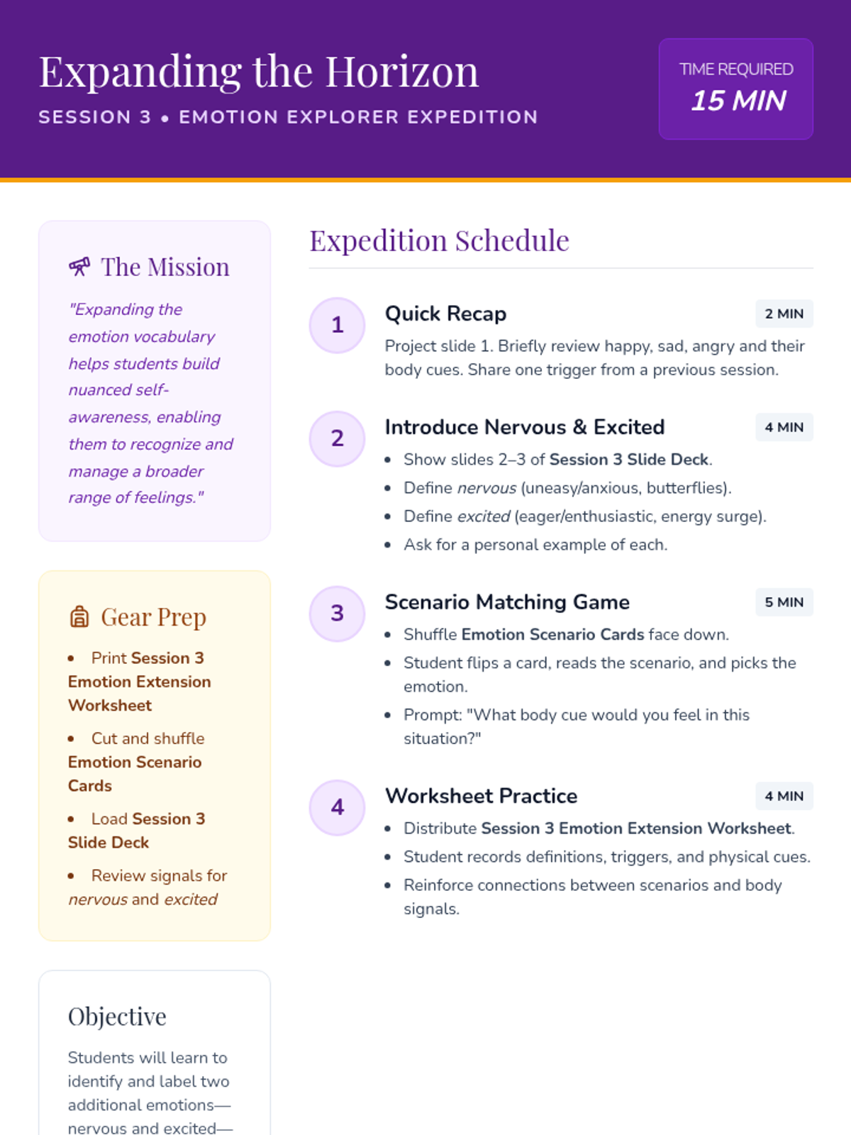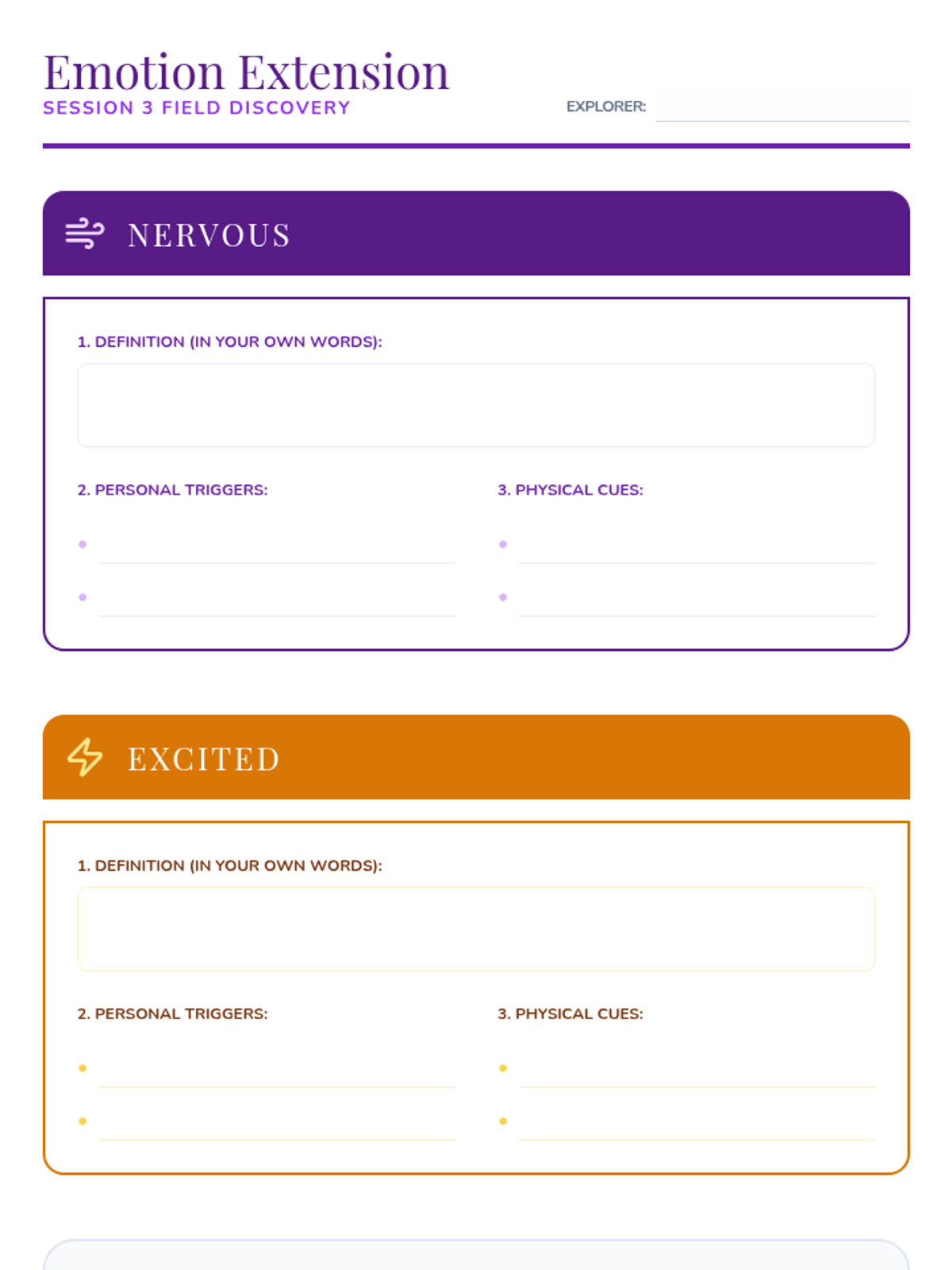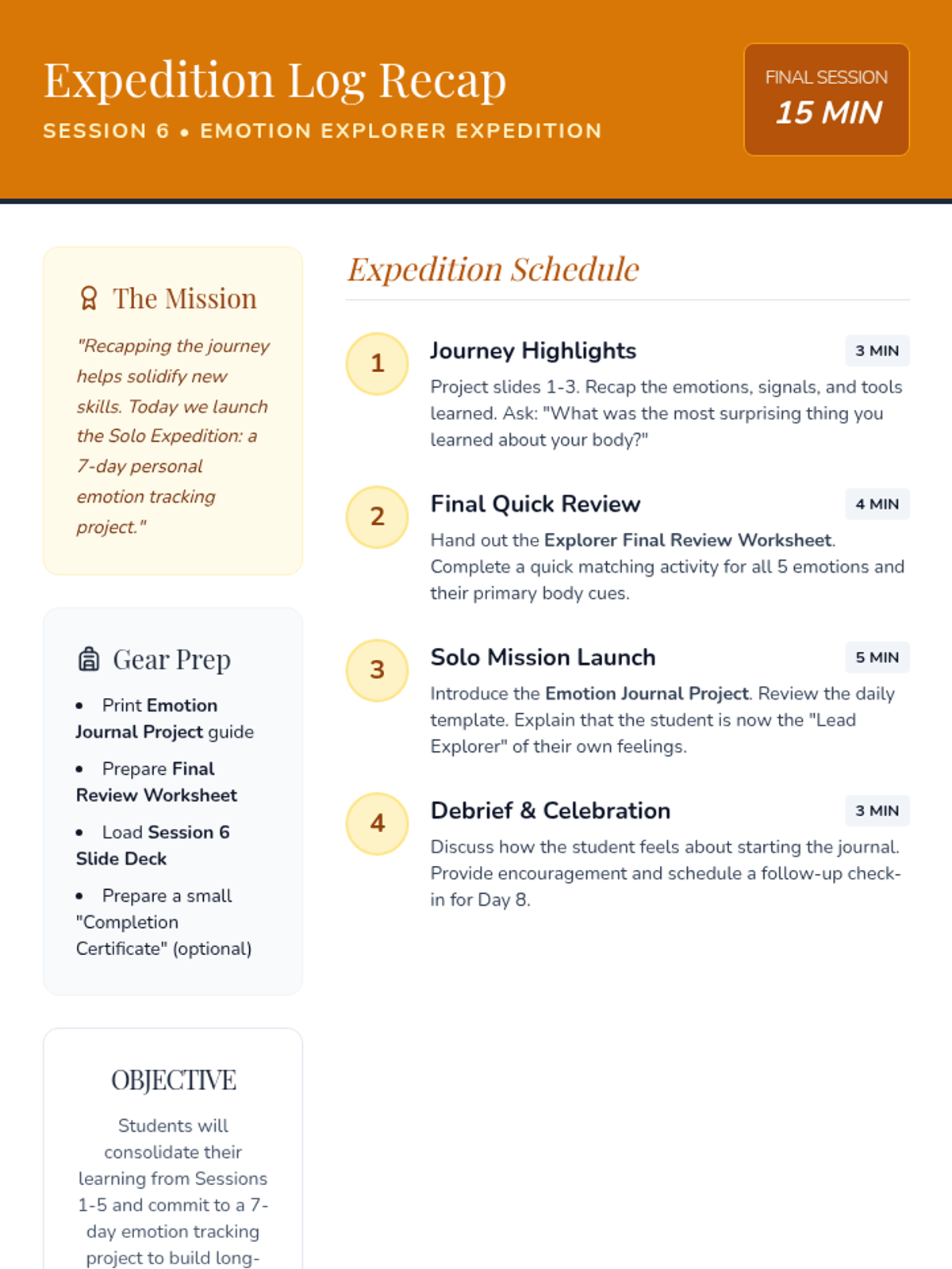 A 6-session mini-course for middle school students to build emotional intelligence by identifying triggers, bodily signals, and coping strategies through an explorer-themed lens.
