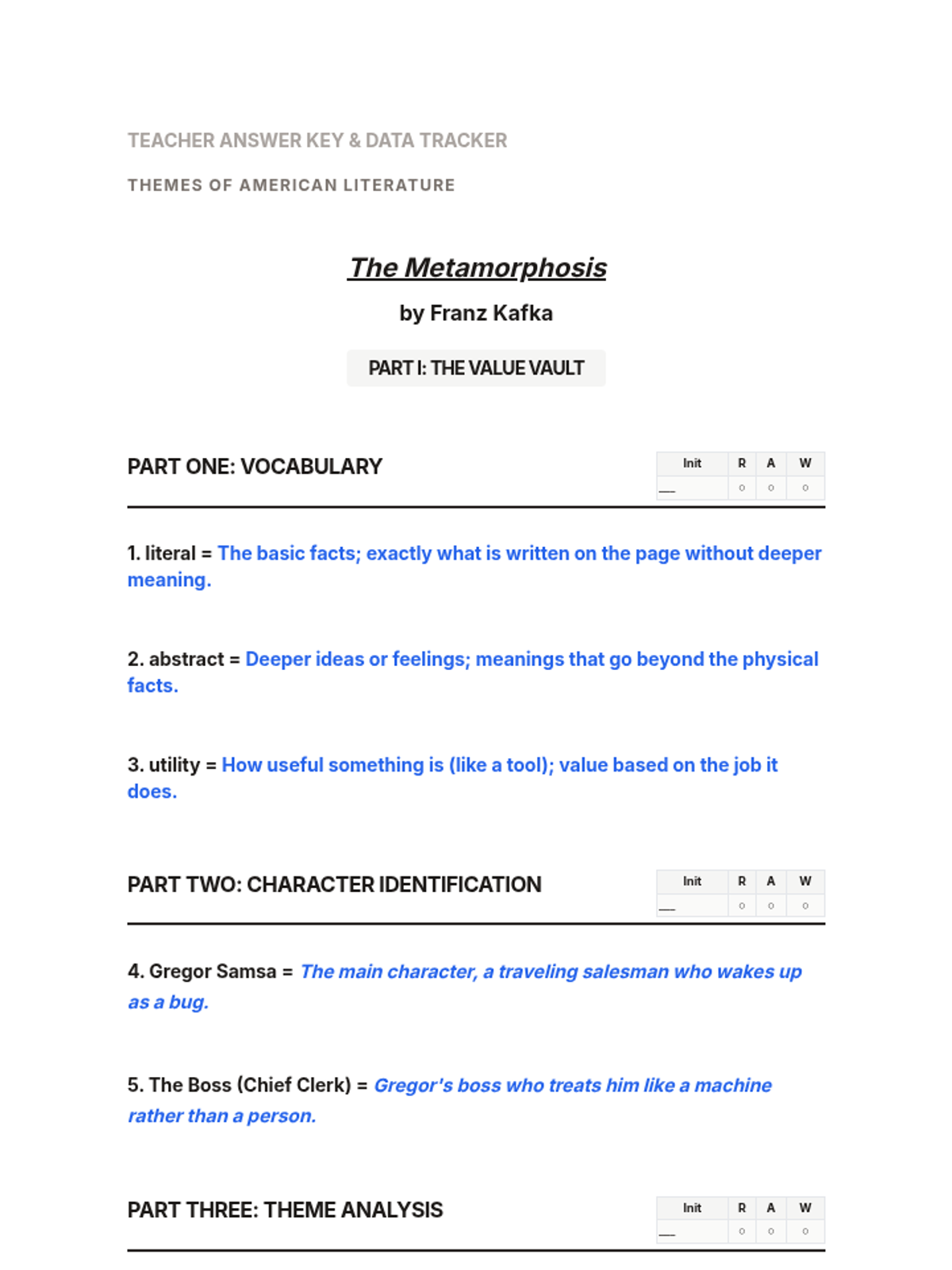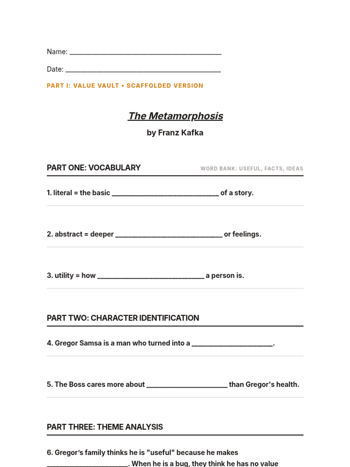 An 8-week deep dive into Kafka's Metamorphosis for special education students, focusing on abstract thinking, social value, and the human condition through high-engagement activities and visual organizers.