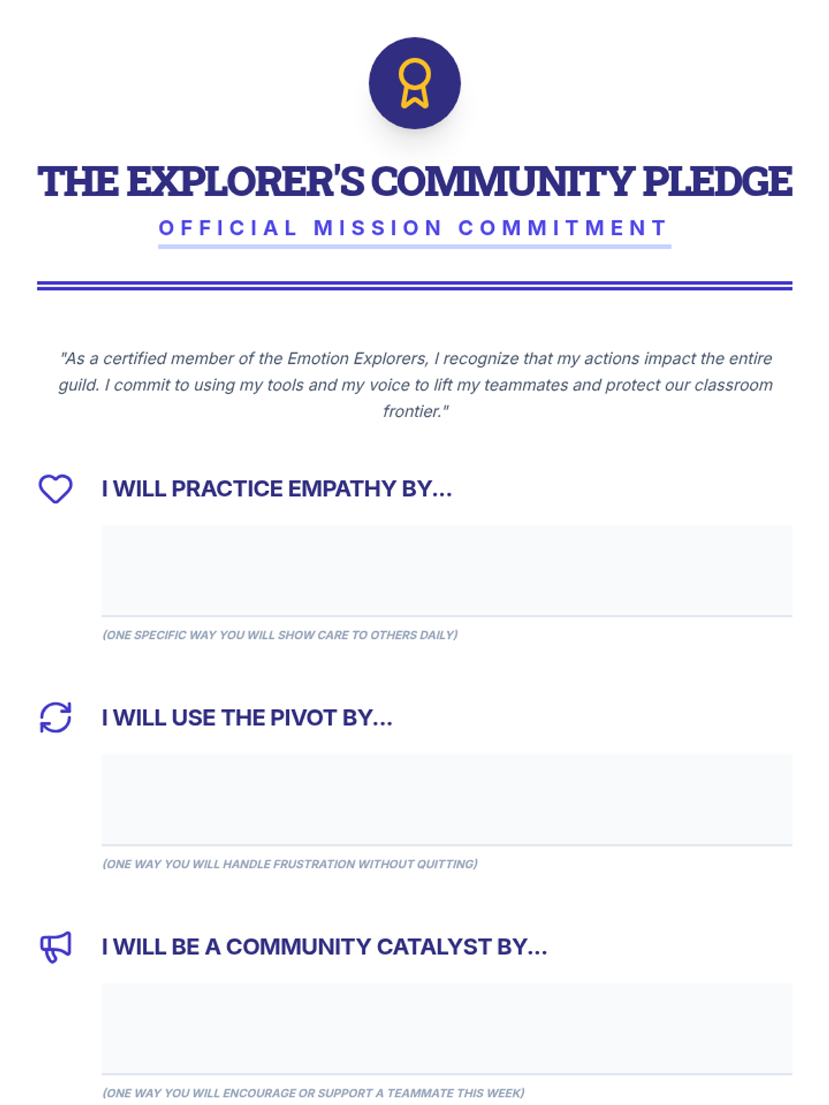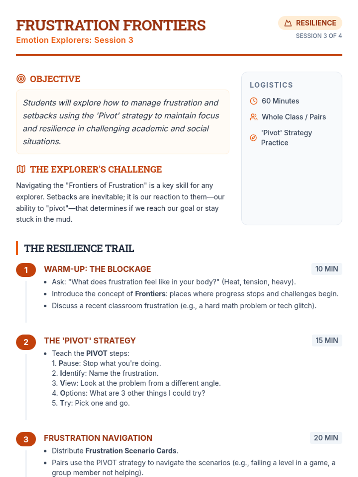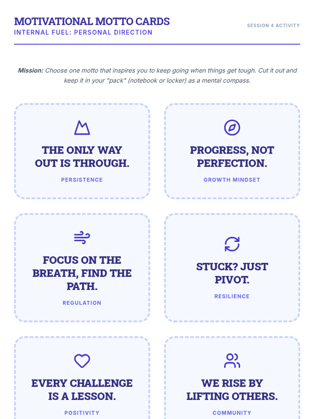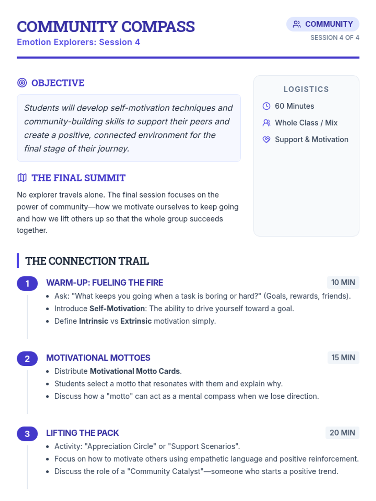A month-long, four-session course for 7th graders that builds empathy, self-regulation, frustration management, self-motivation, and community skills through engaging activities and reflection.