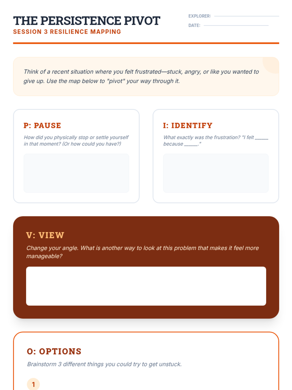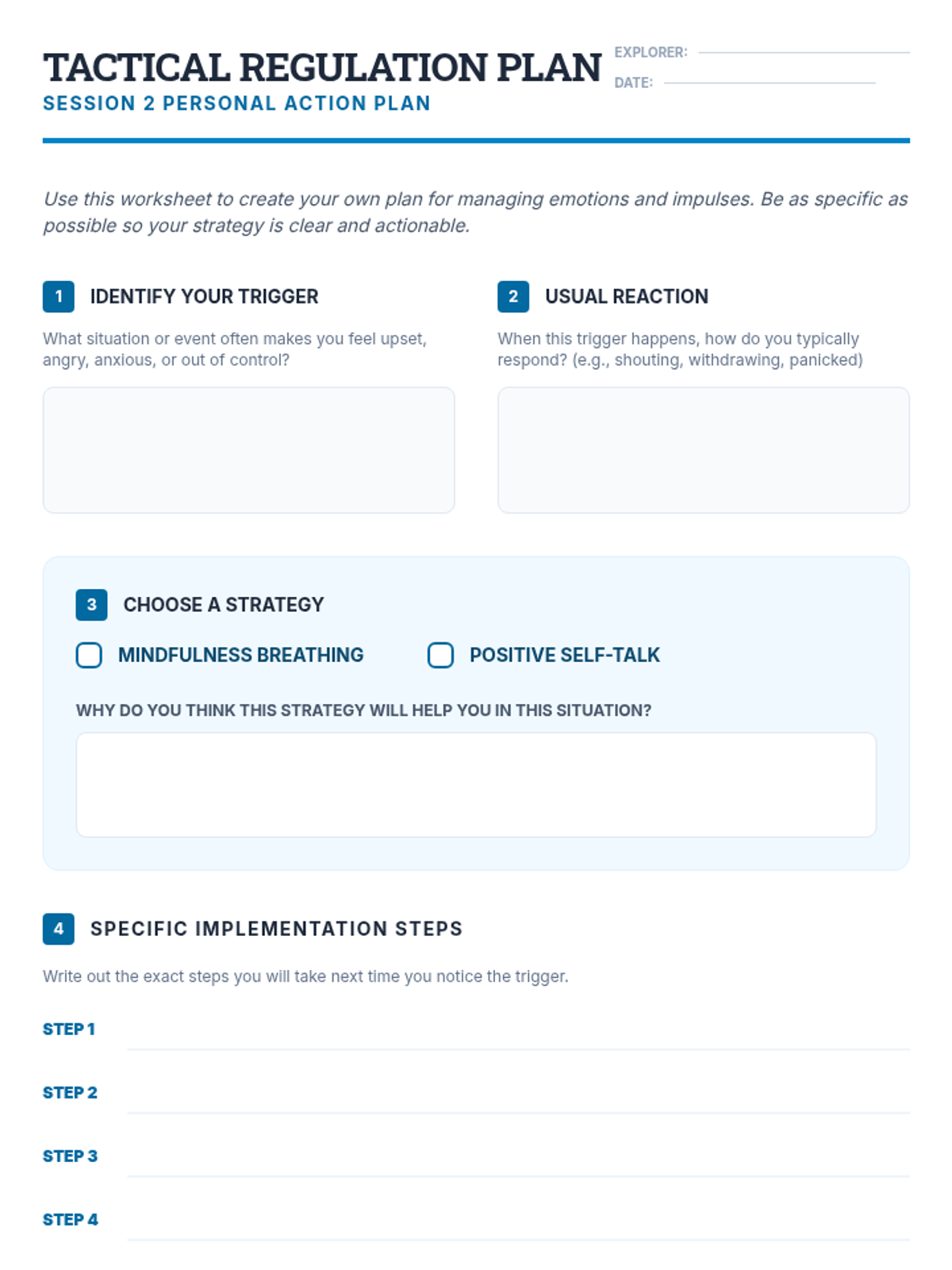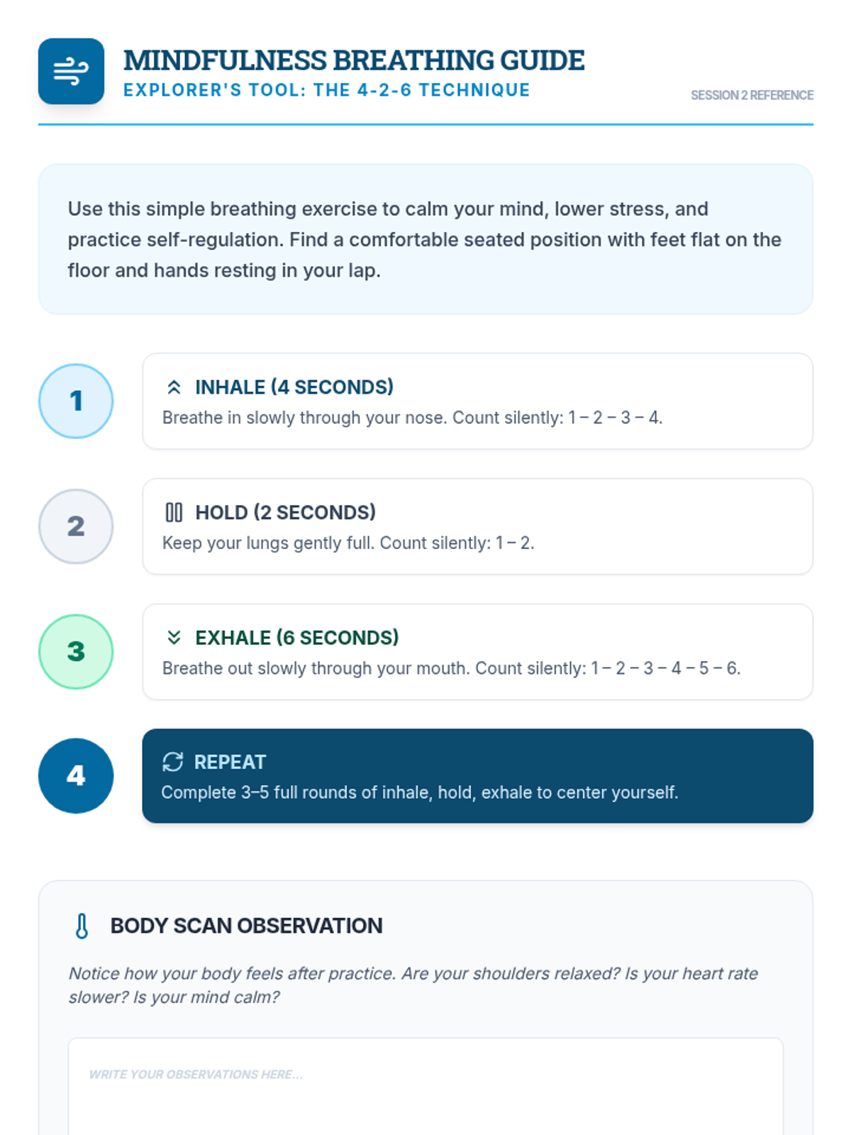 A 6-session counseling group designed to help students identify triggers, understand physical symptoms of anxiety, and build a personalized toolkit of coping strategies through a 'Calm Explorer' theme.