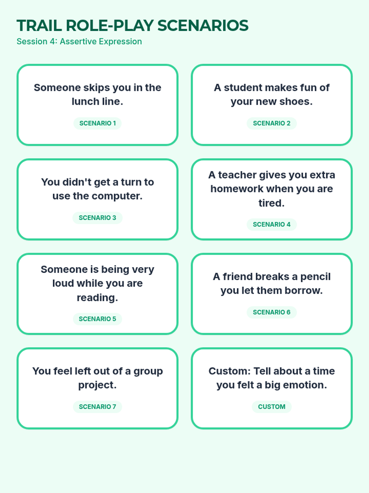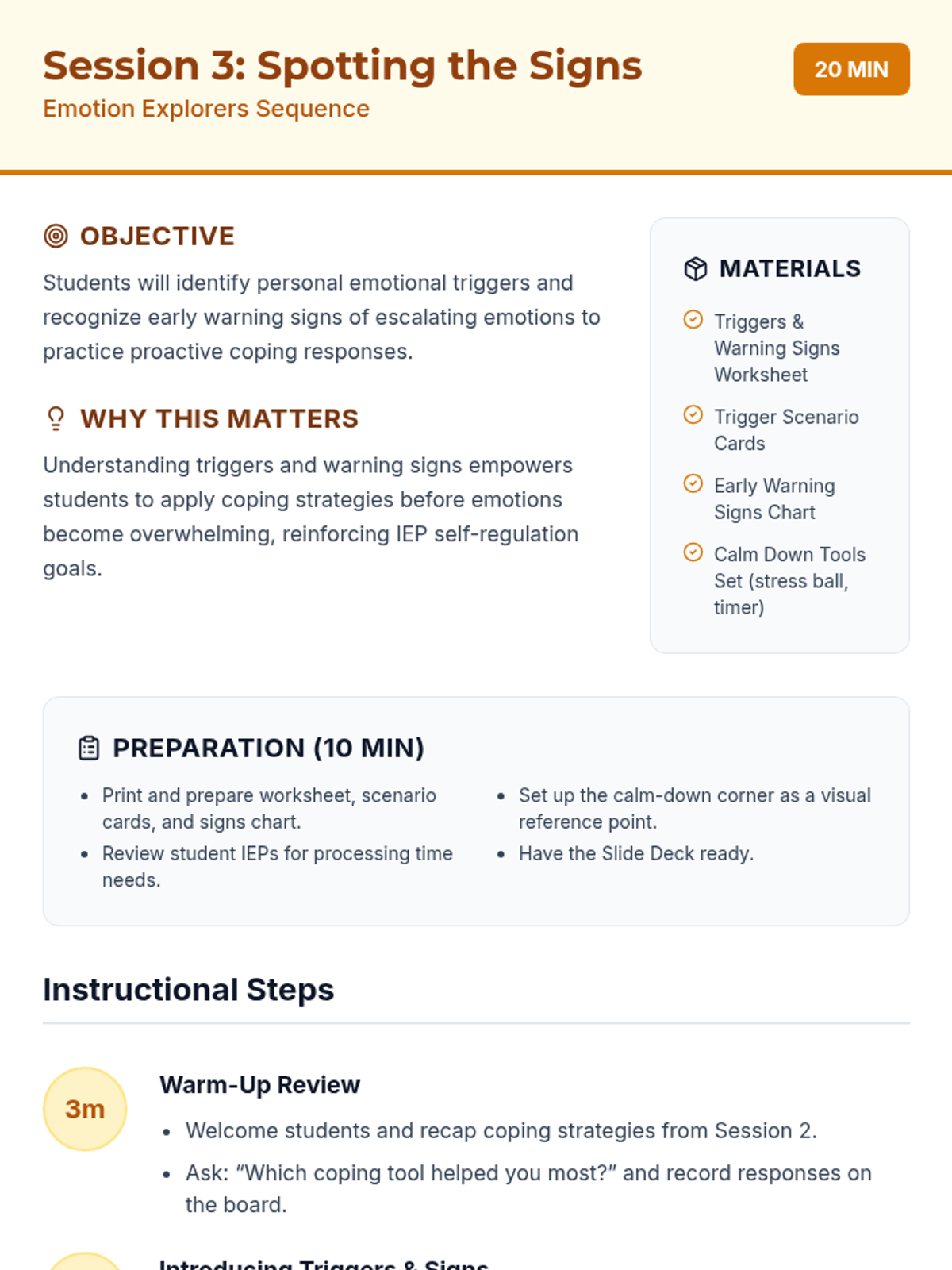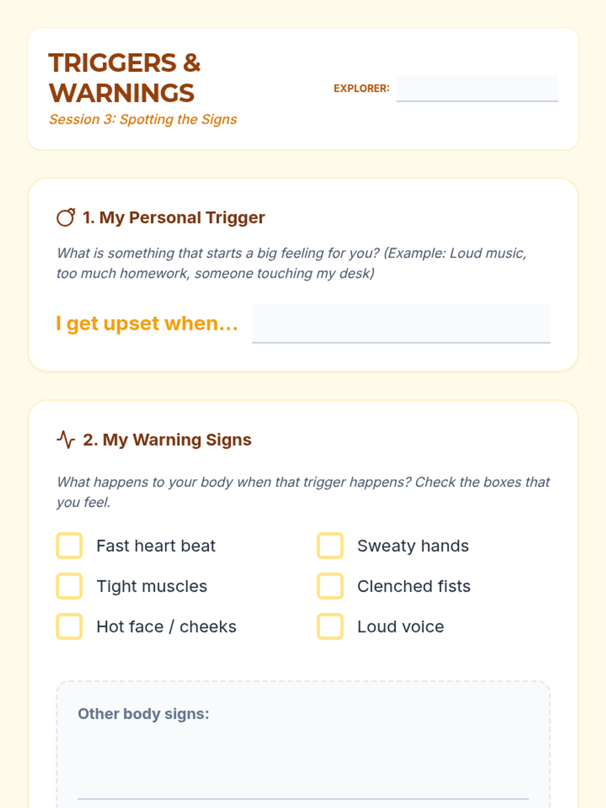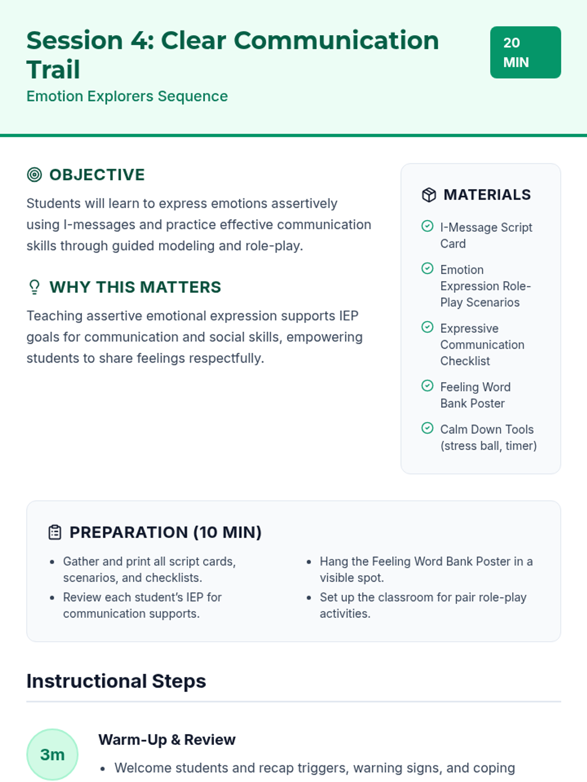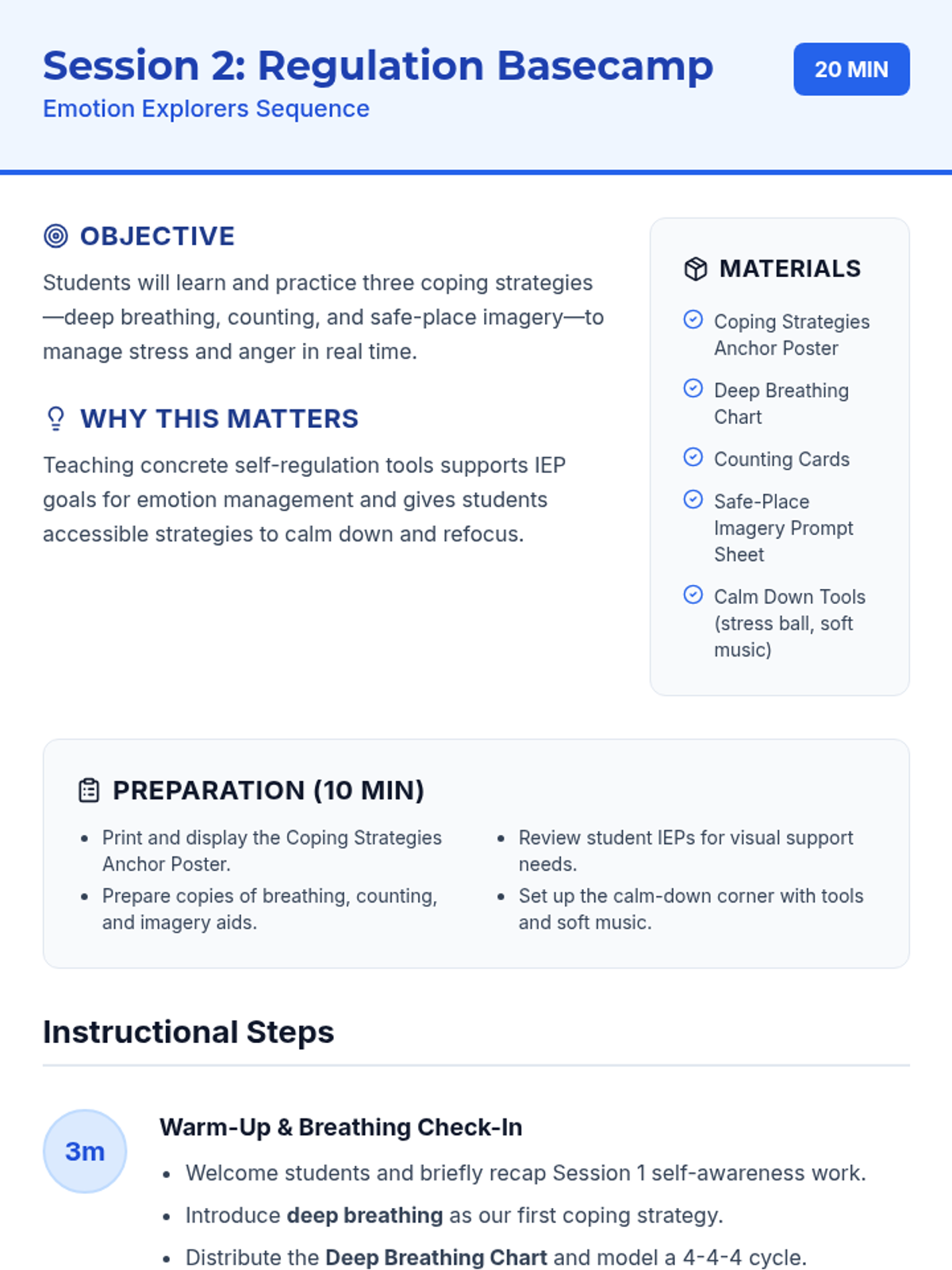 A 4-session series for 7th-grade sub-separate students to develop self-awareness, coping strategies, and assertive communication through an engaging 'Explorer' theme. Each session focuses on practical skills to meet IEP goals for self-regulation and social-emotional growth.