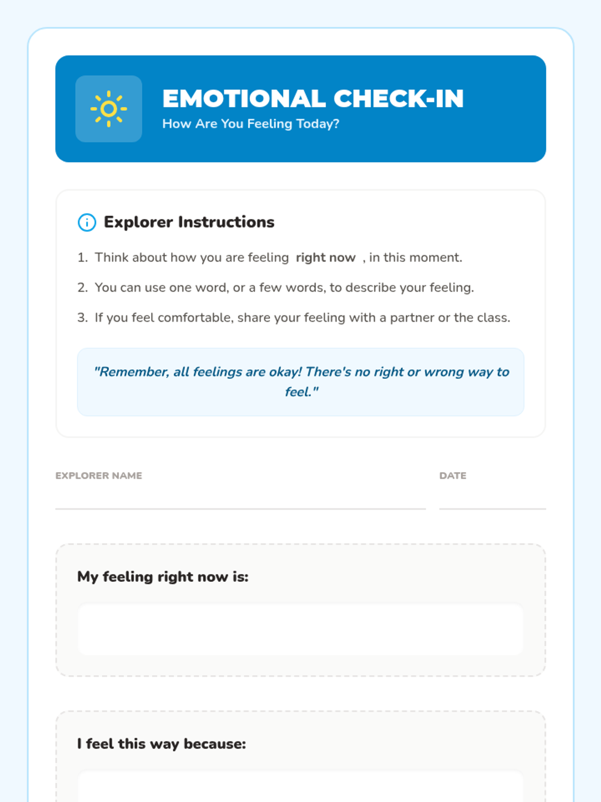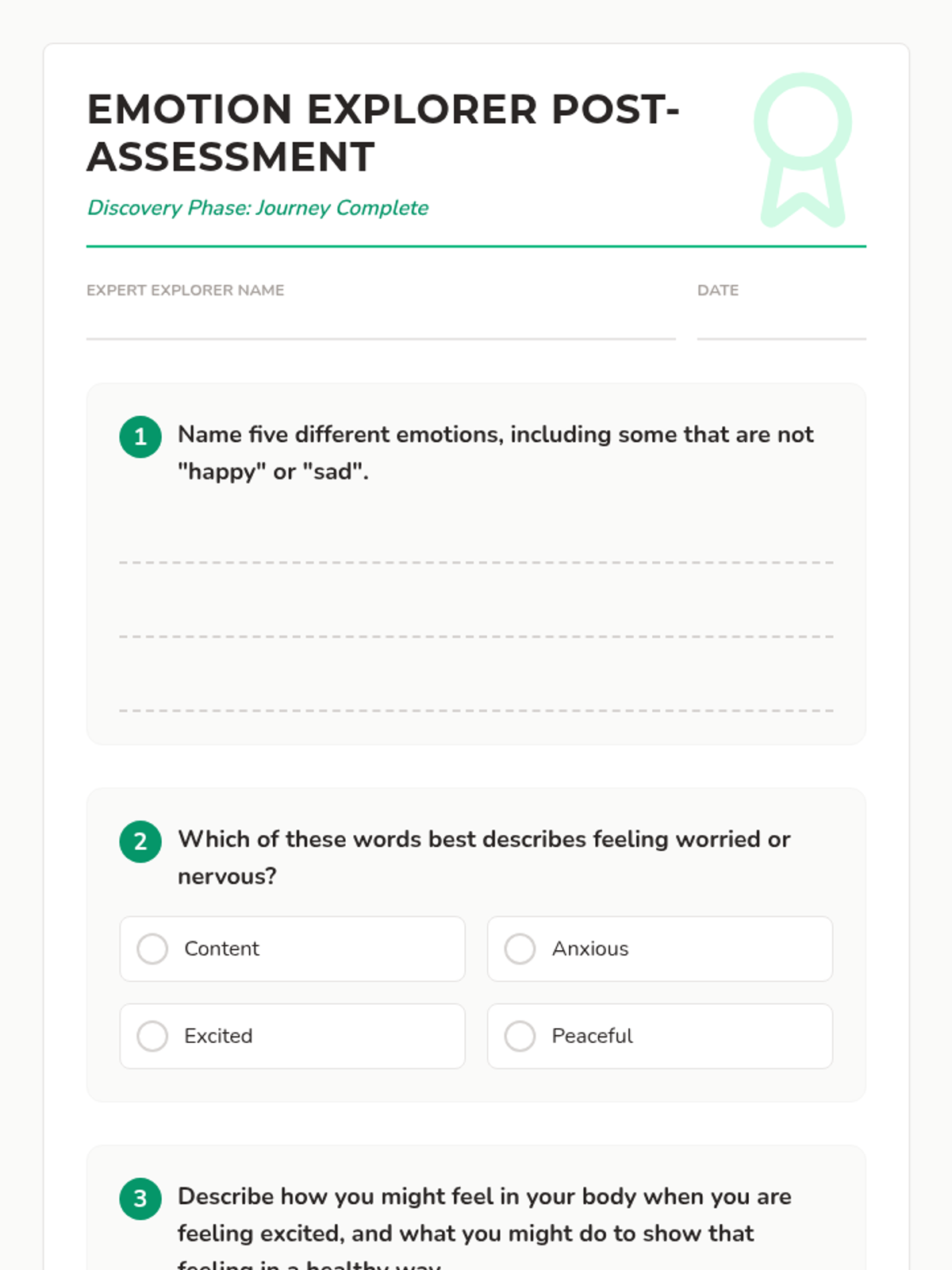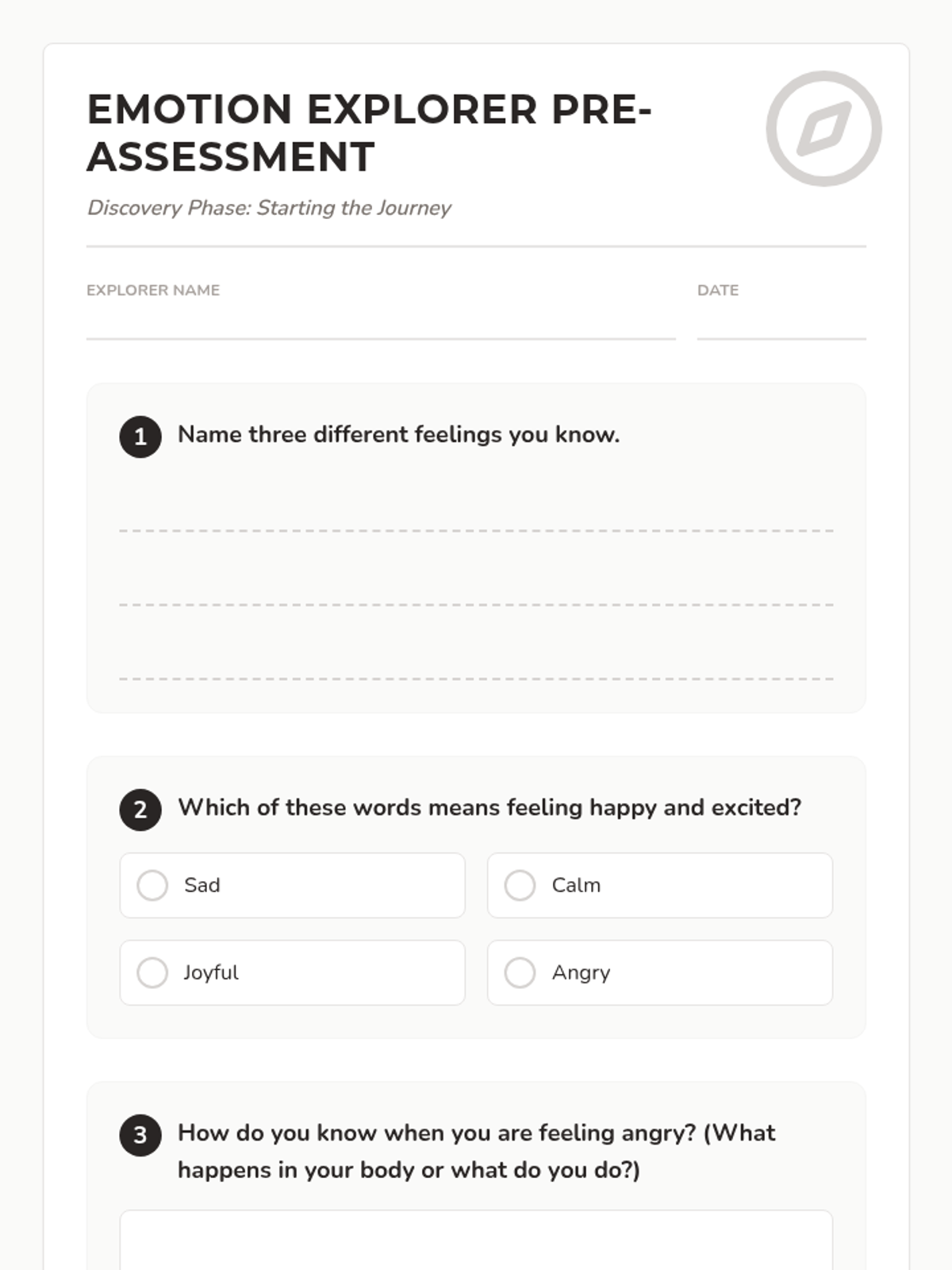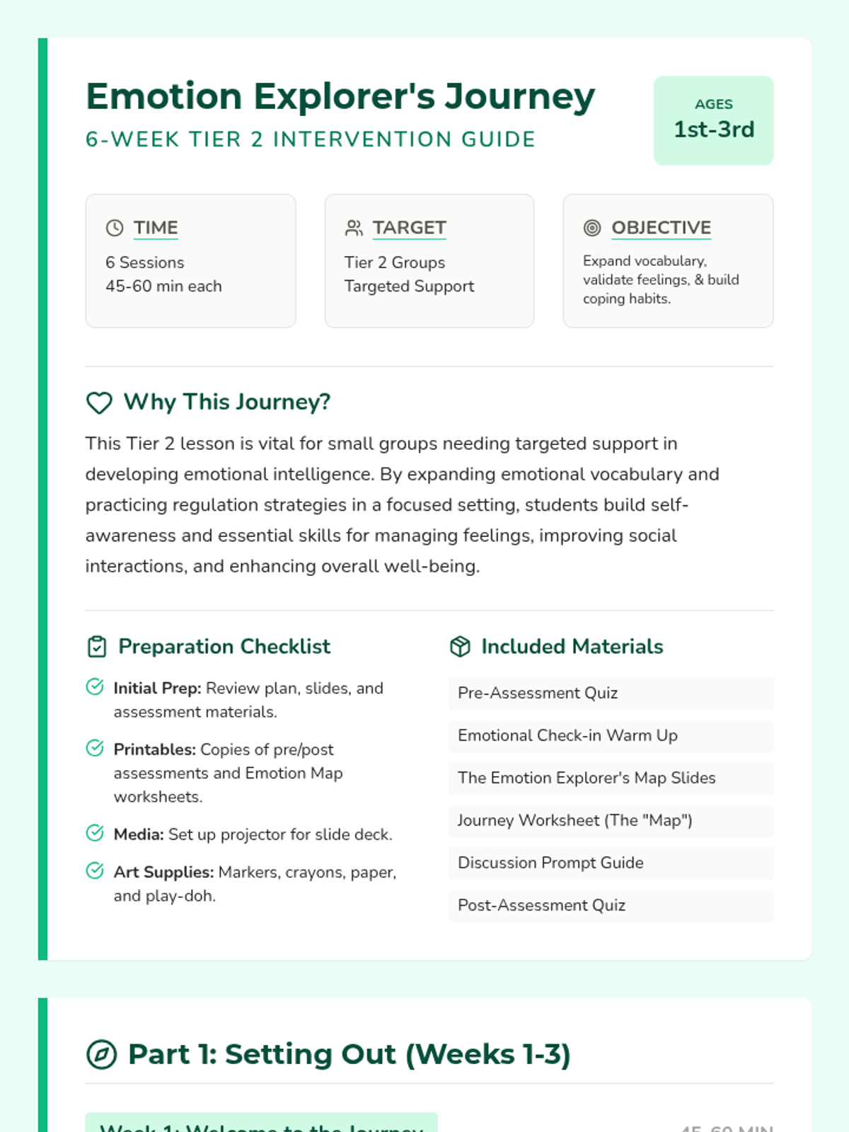 A 6-week Tier 2 small group intervention designed for 1st to 3rd grade students to build emotional vocabulary, self-awareness, and coping skills through an adventure-themed 'Emotion Map' curriculum.