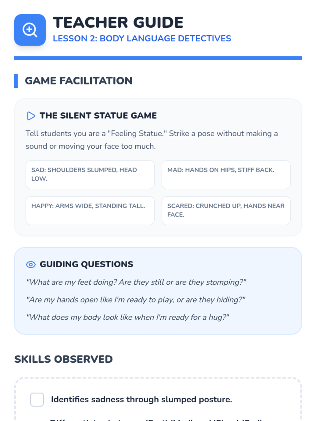 A sequence focused on building social-emotional competencies, starting with identifying and understanding a wide range of emotions. Students learn to recognize physical cues and situational triggers for different feelings.
