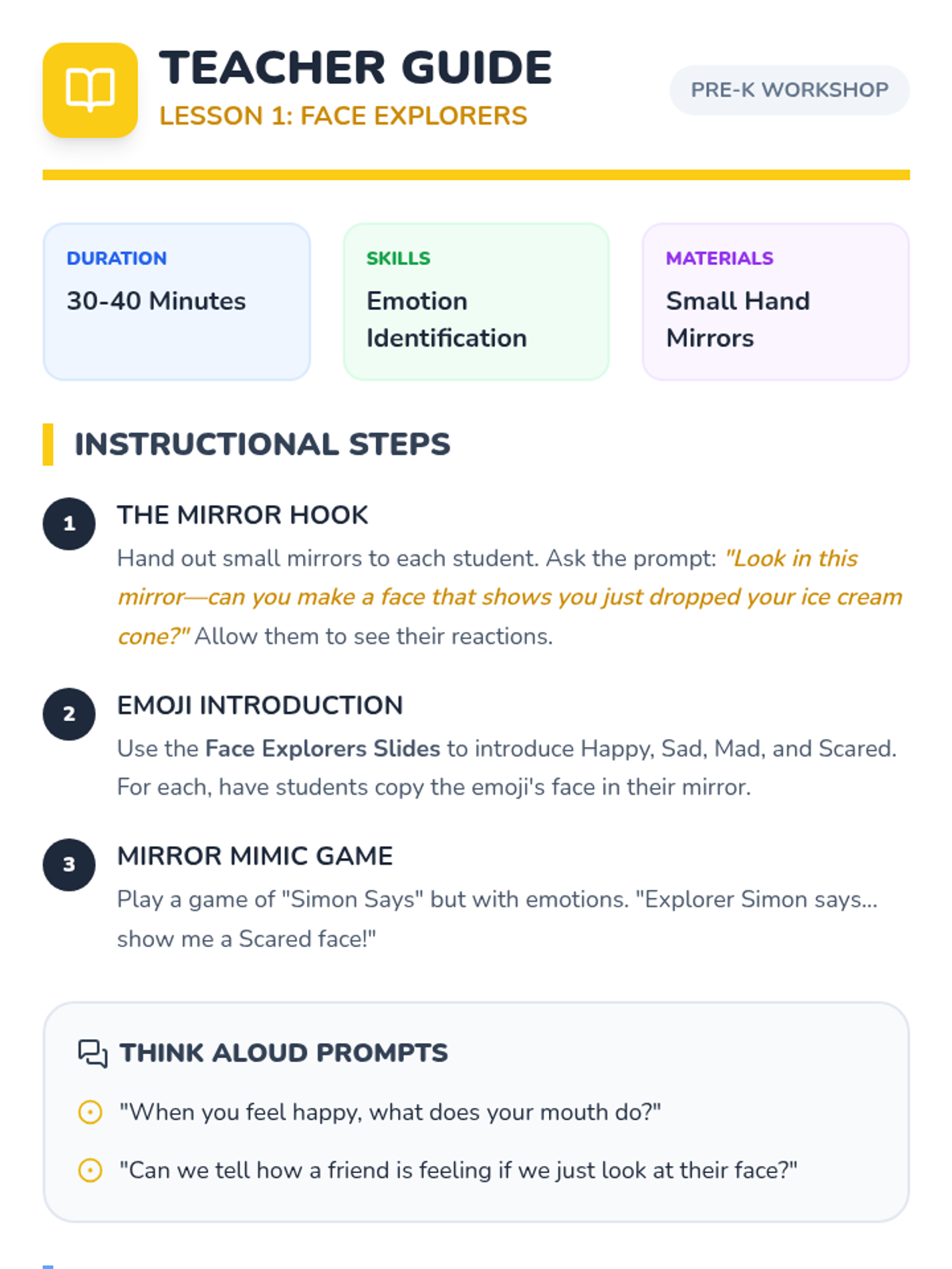 A Pre-K sequence focused on emotional literacy, helping young children identify basic emotions in themselves and others, use verbal and non-verbal cues, and practice empathy through comforting gestures within a group setting.