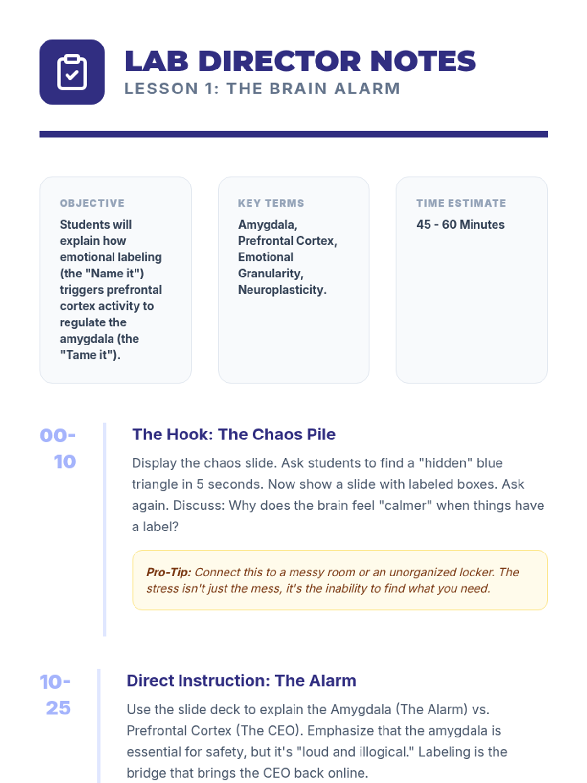 A 9th-grade sequence exploring the neurobiological link between accurate emotional labeling and effective self-regulation, using the 'Name it to Tame it' principle.