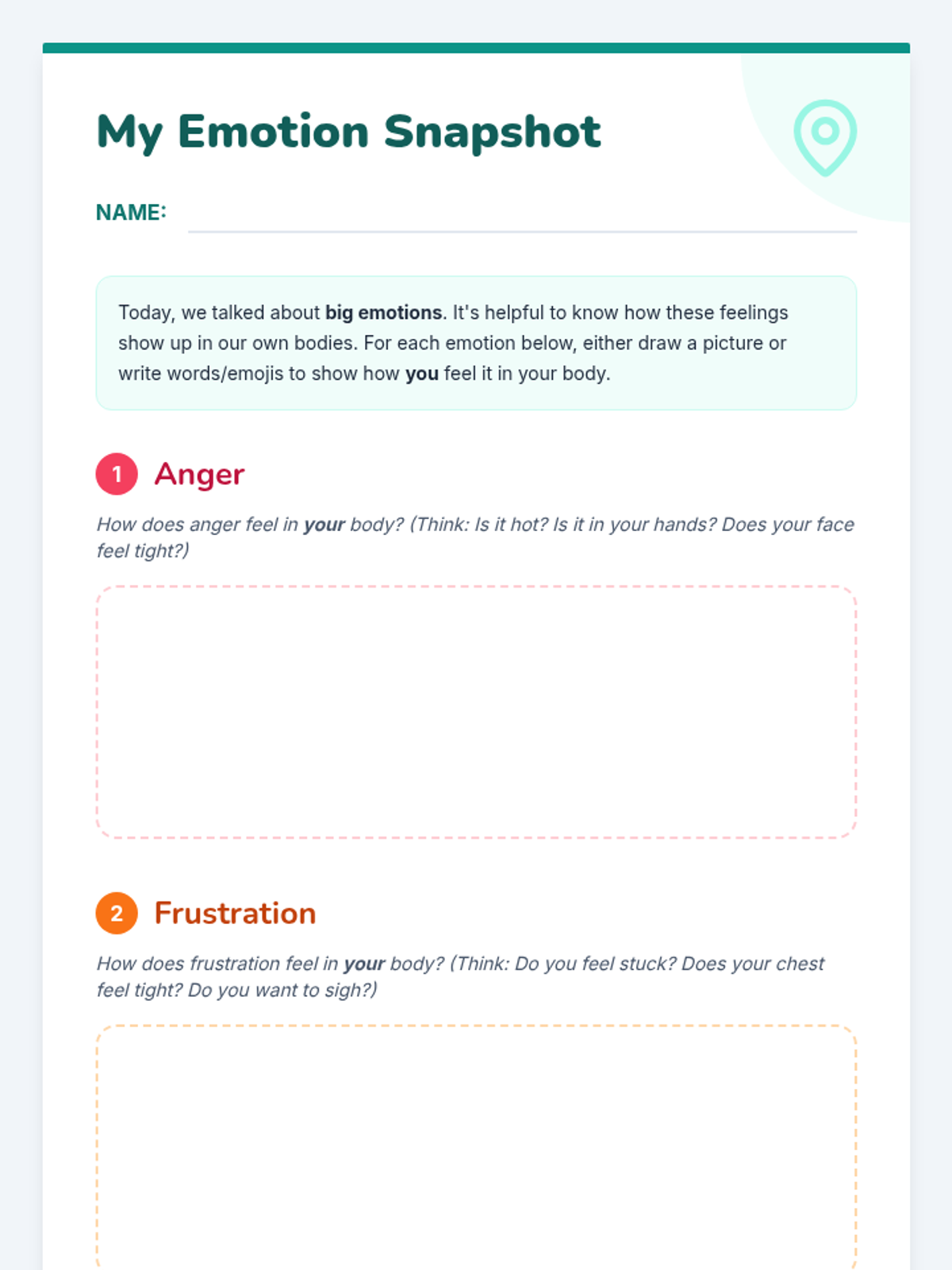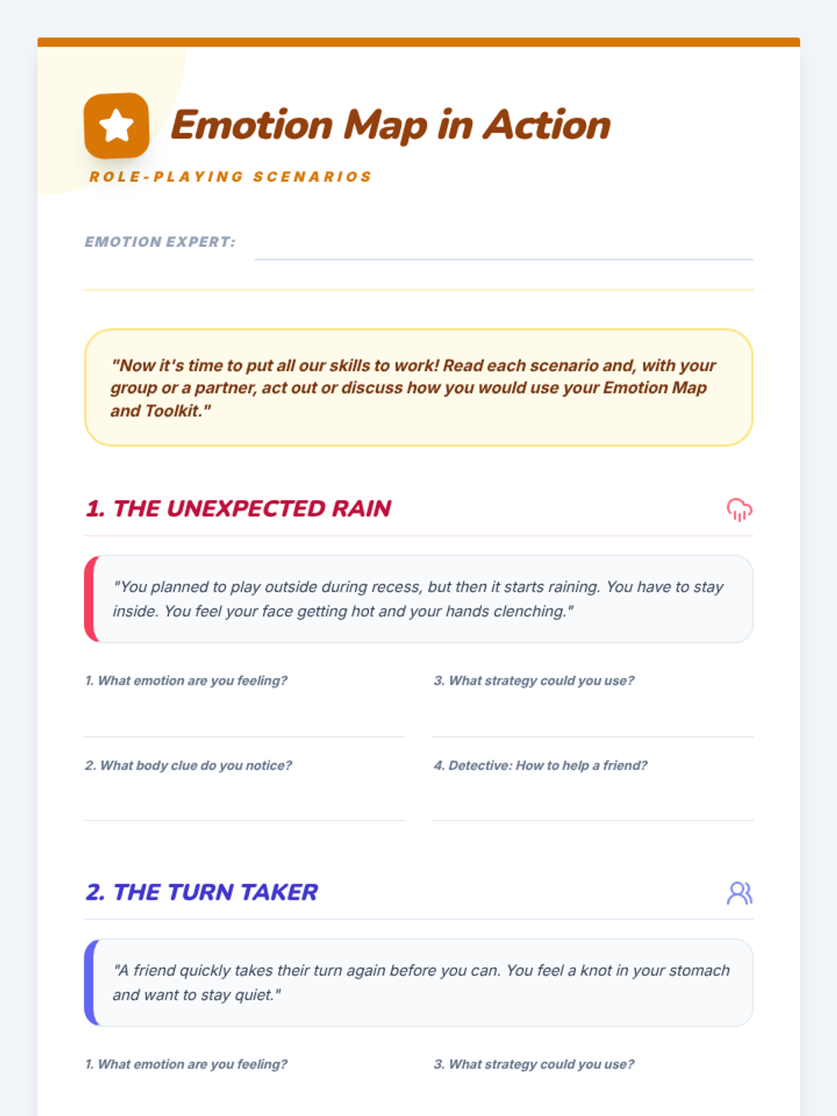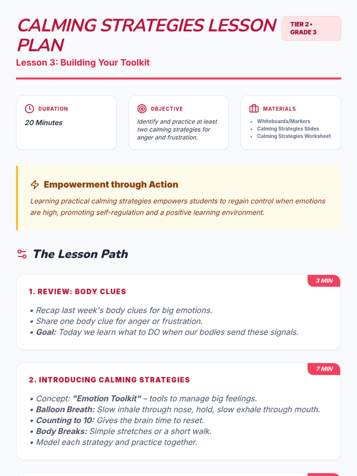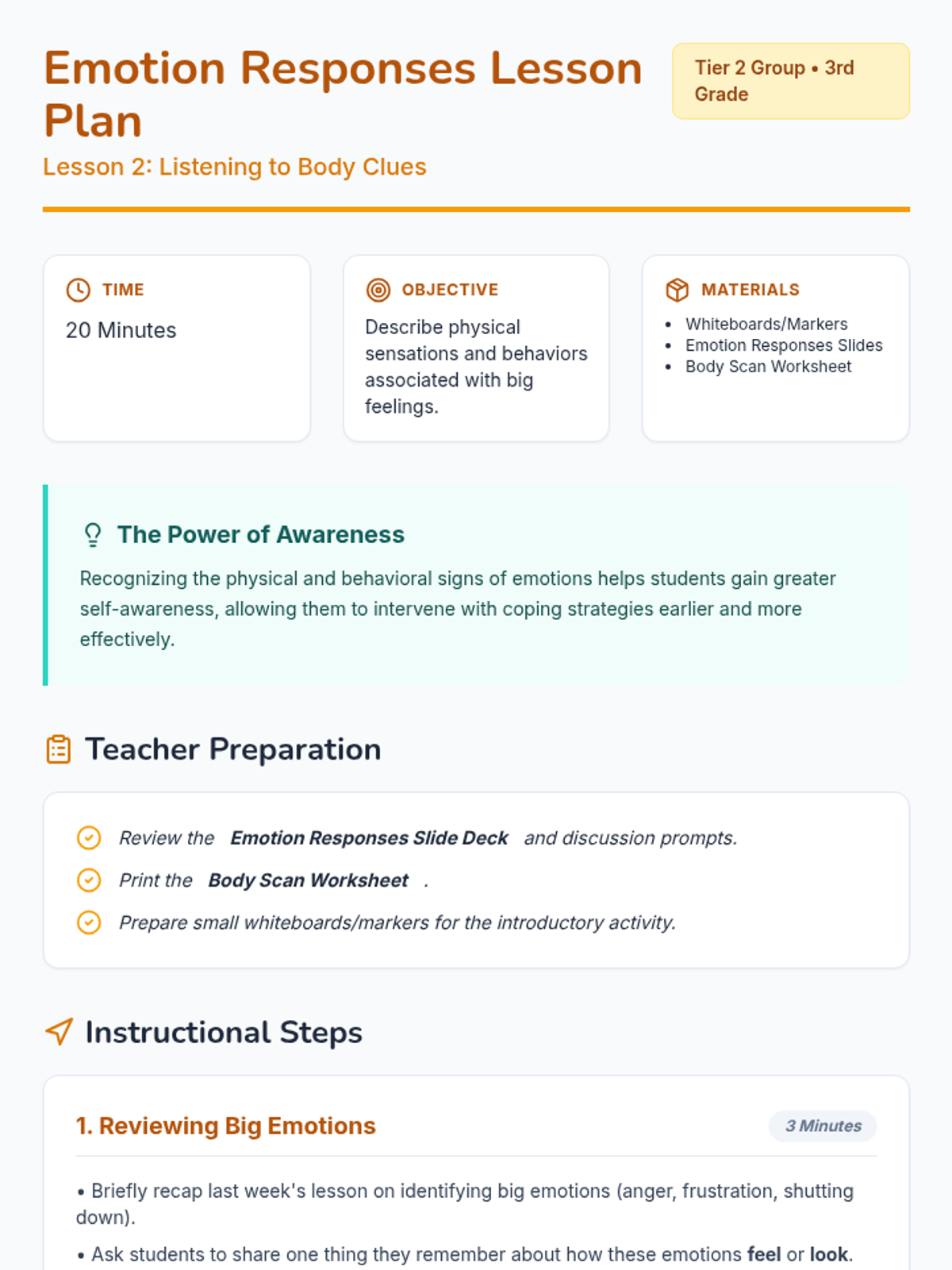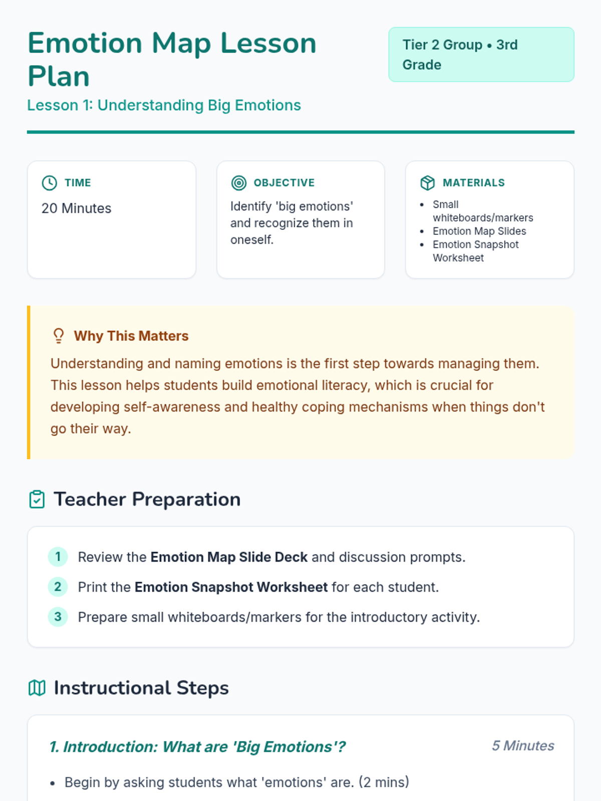 A six-part Tier 2 social-emotional learning unit for 3rd graders focused on identifying, understanding, and managing big emotions like anger, frustration, and shutting down through the metaphor of an 'Emotion Map'.