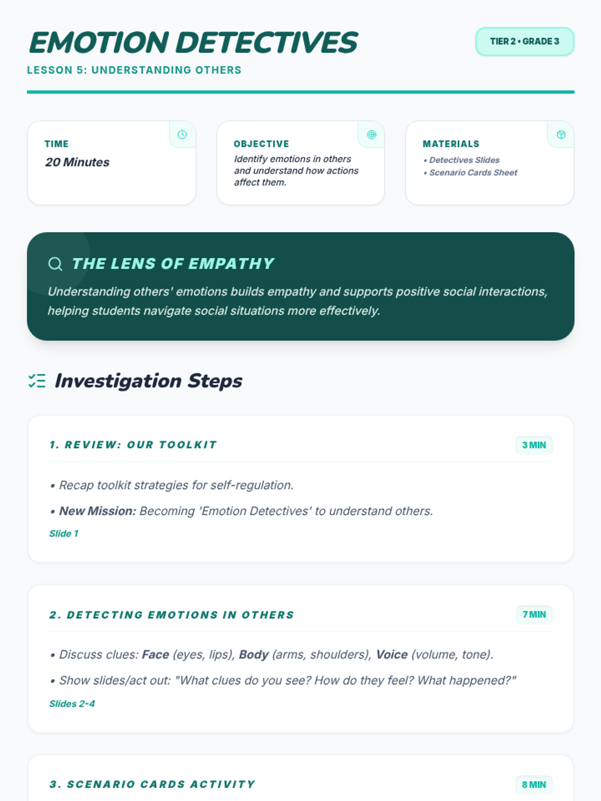 A 12-lesson social-emotional learning sequence themed around 'Mind Mechanics,' where students become 'mechanics' of their own minds to develop self-awareness, growth mindset, and social reasoning. Each lesson includes a facilitator script, student workbook pages, and visual anchor charts.