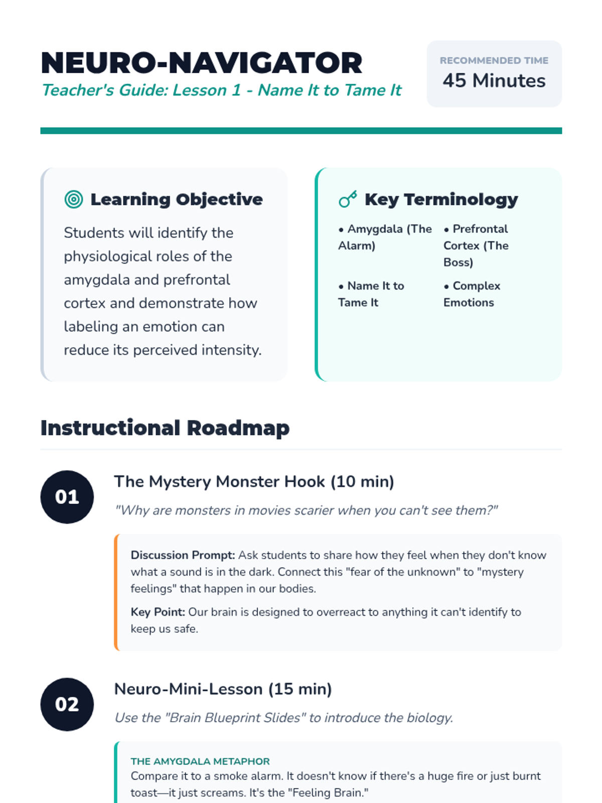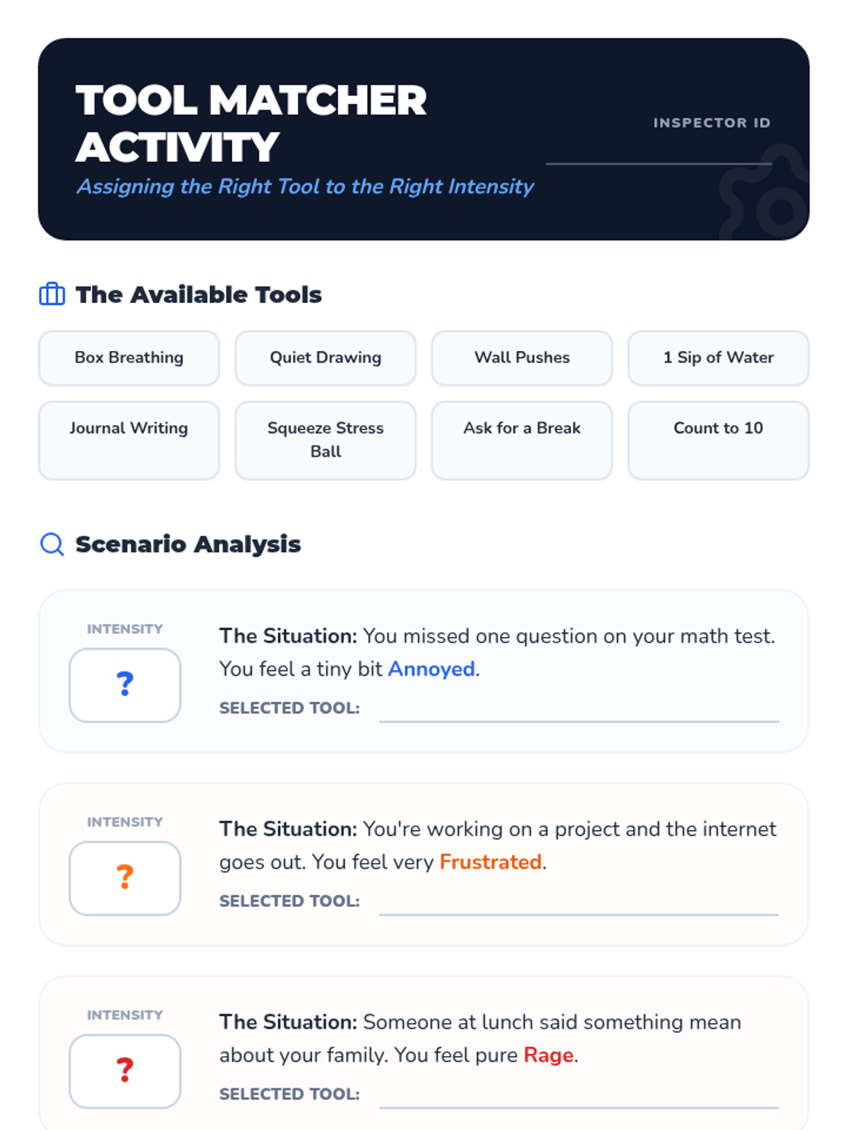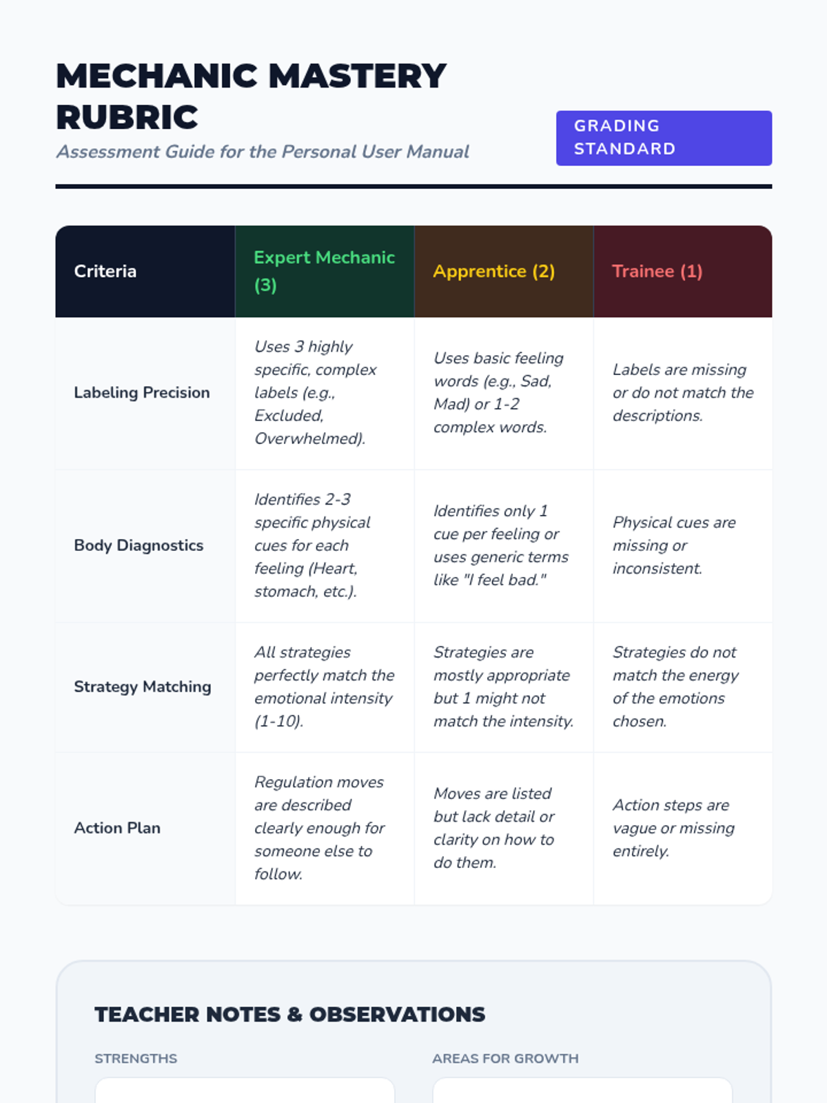 This sequence teaches 4th-grade students the 'Name it to Tame it' principle, helping them identify complex emotions and match them with appropriate self-regulation strategies through the creation of a personal 'User Manual'.