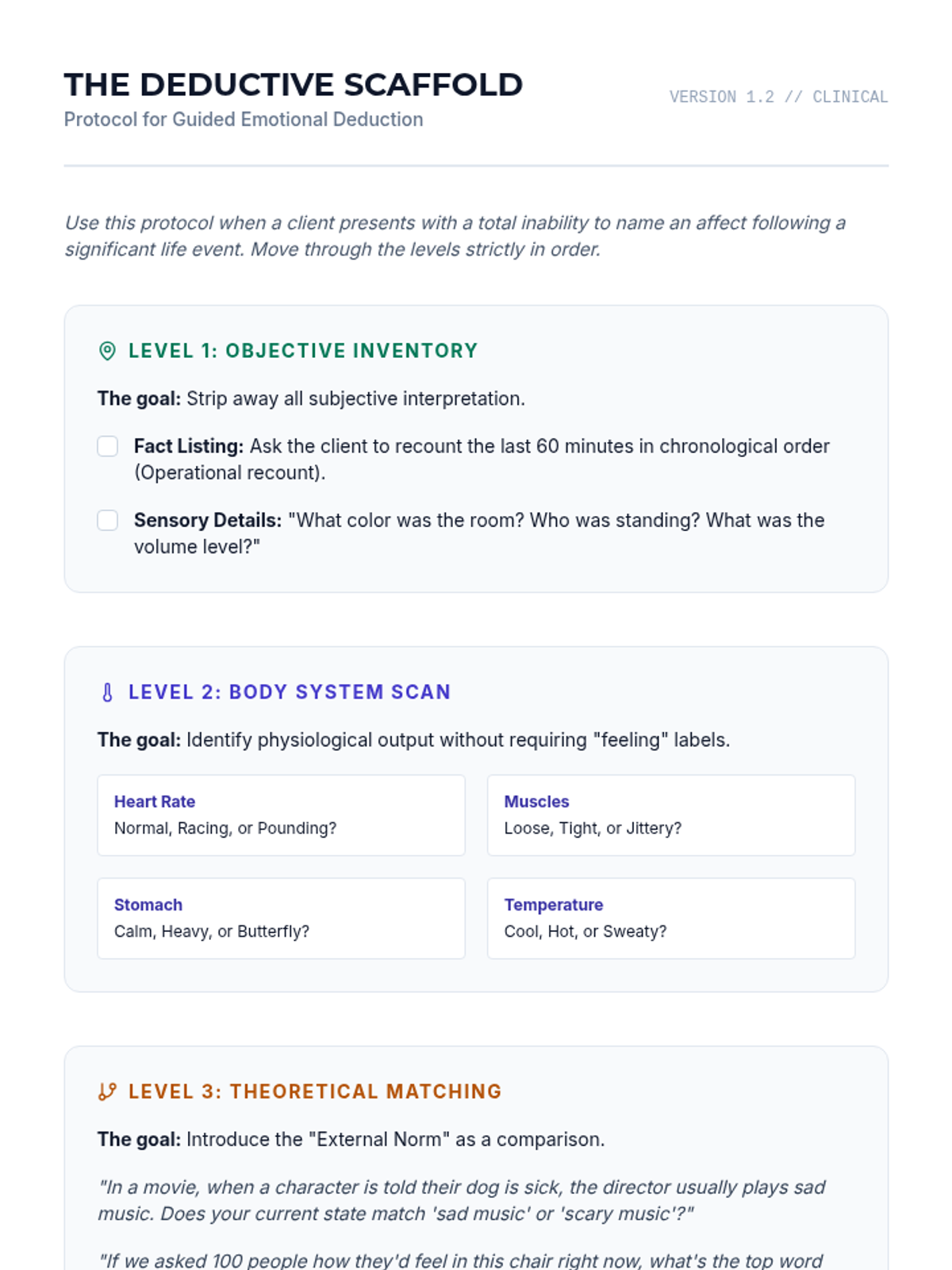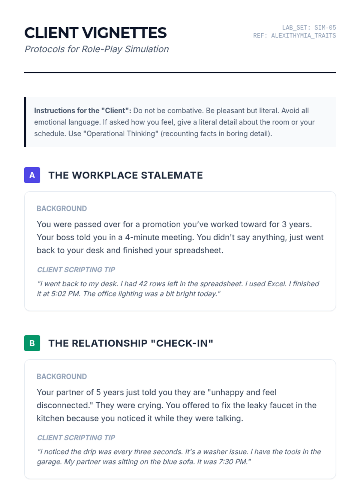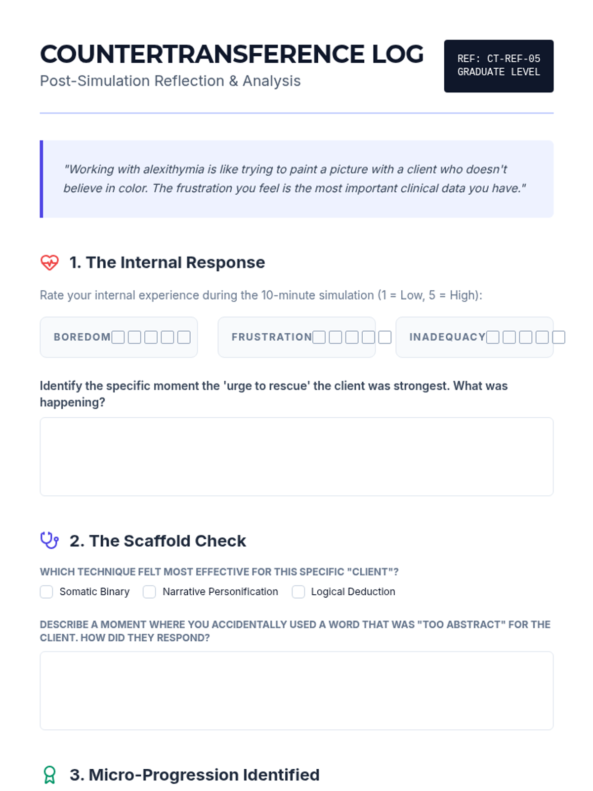 This graduate-level sequence focuses on clinical interventions for alexithymia, moving from sophisticated psychometric assessment to somatic and narrative scaffolding for clients who struggle to identify and label emotions.