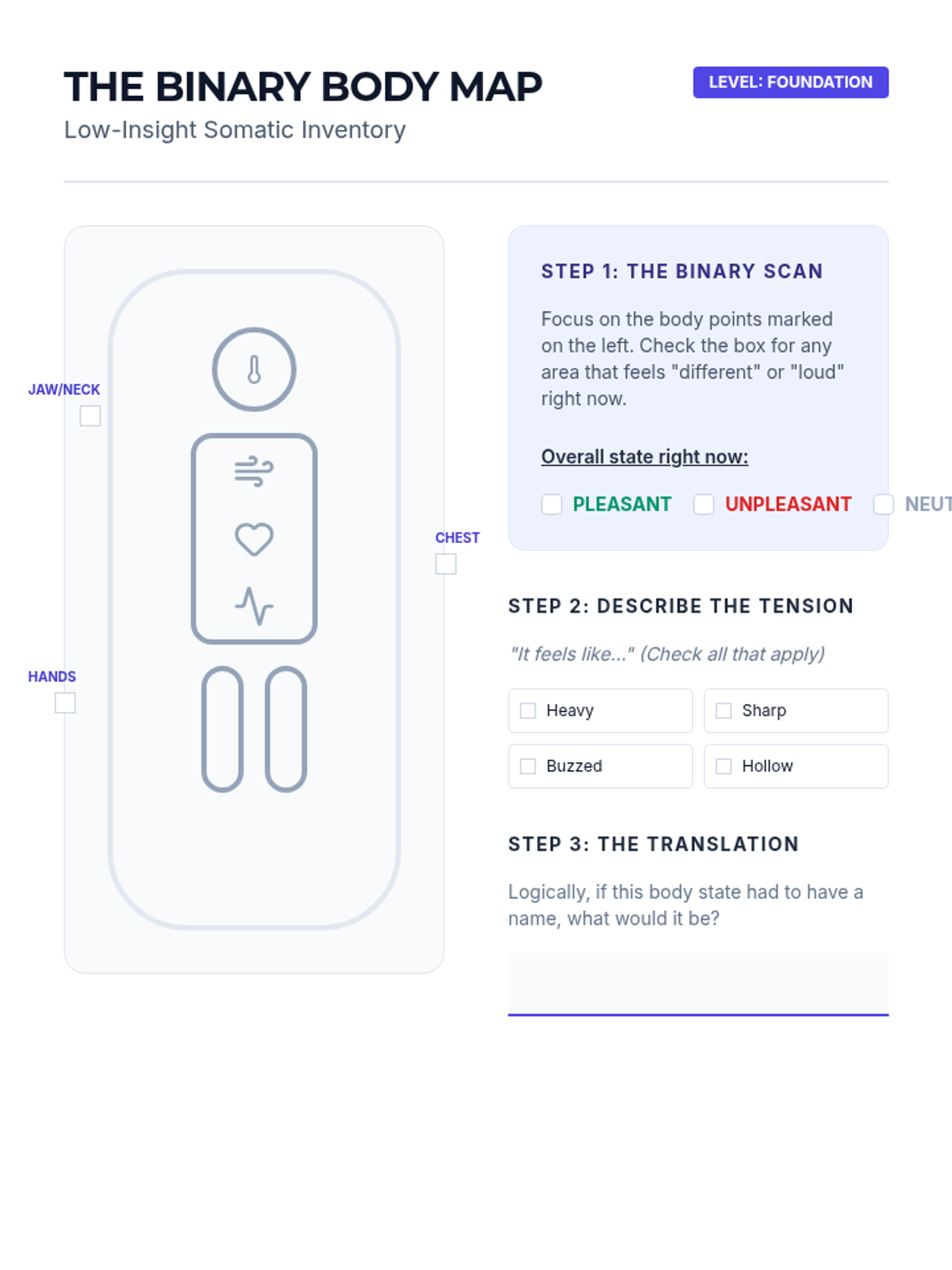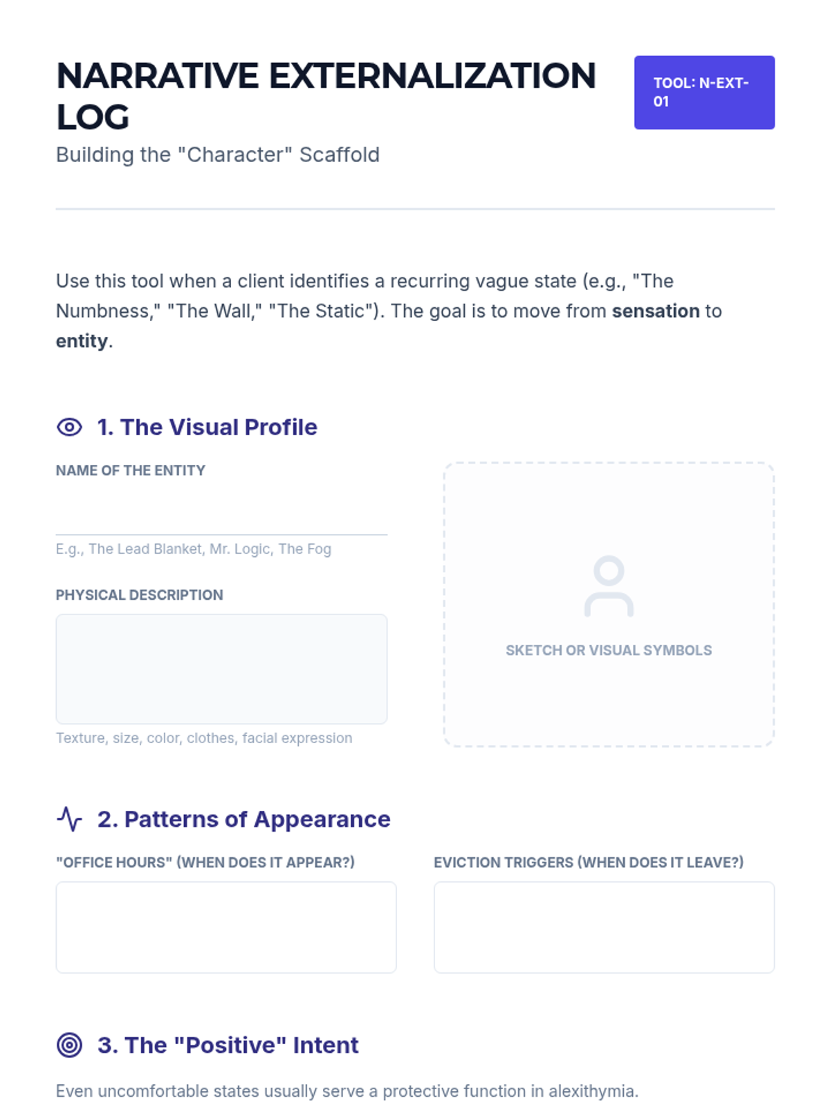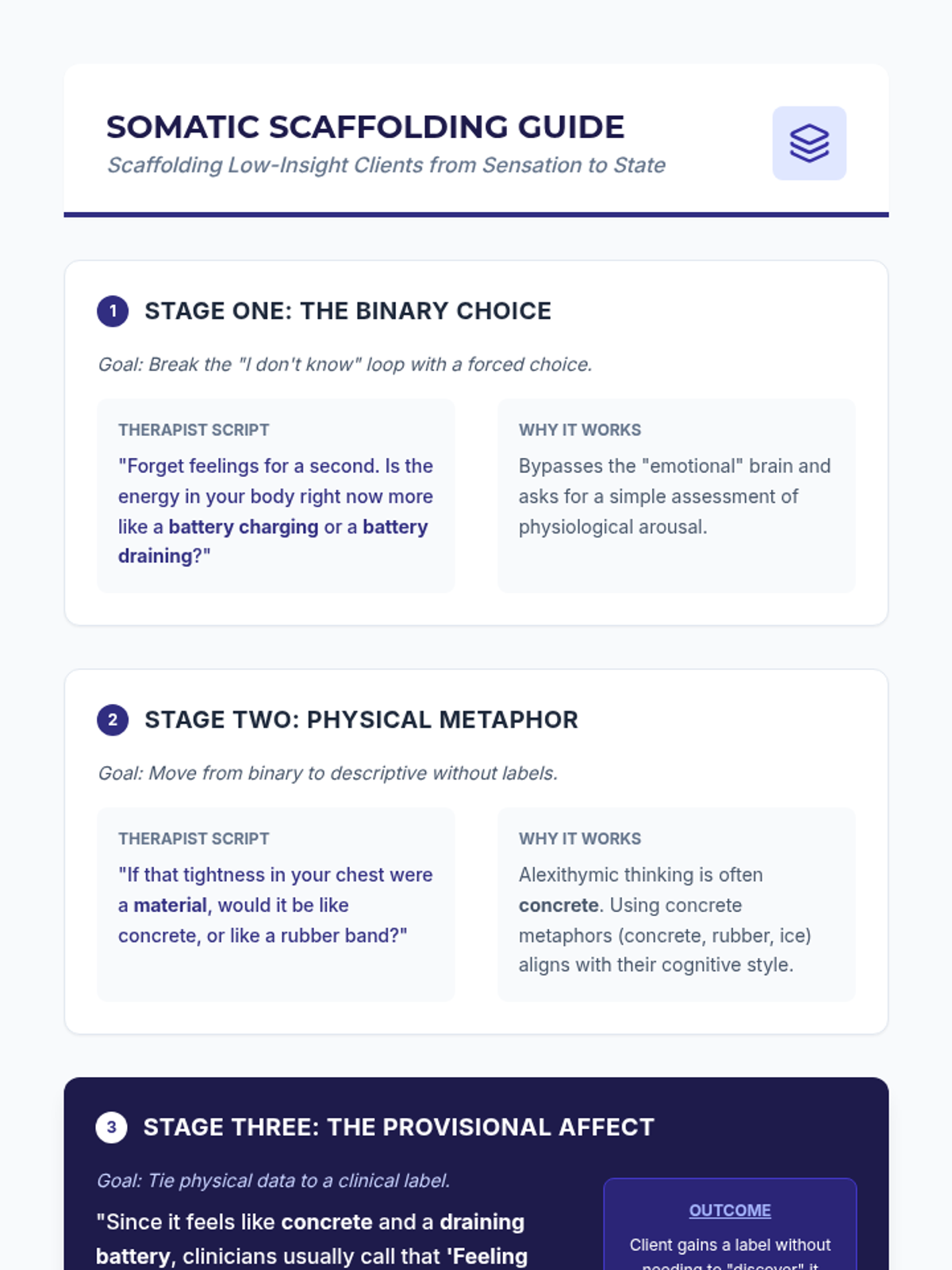 This graduate-level sequence focuses on clinical interventions for alexithymia, moving from sophisticated psychometric assessment to somatic and narrative scaffolding for clients who struggle to identify and label emotions.