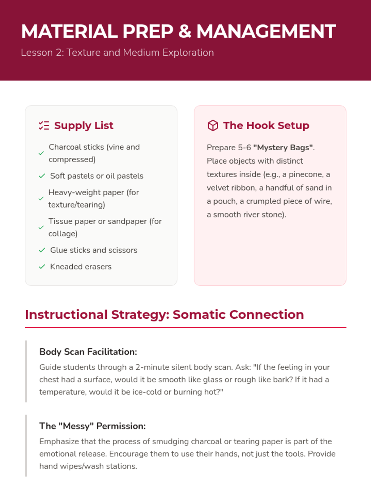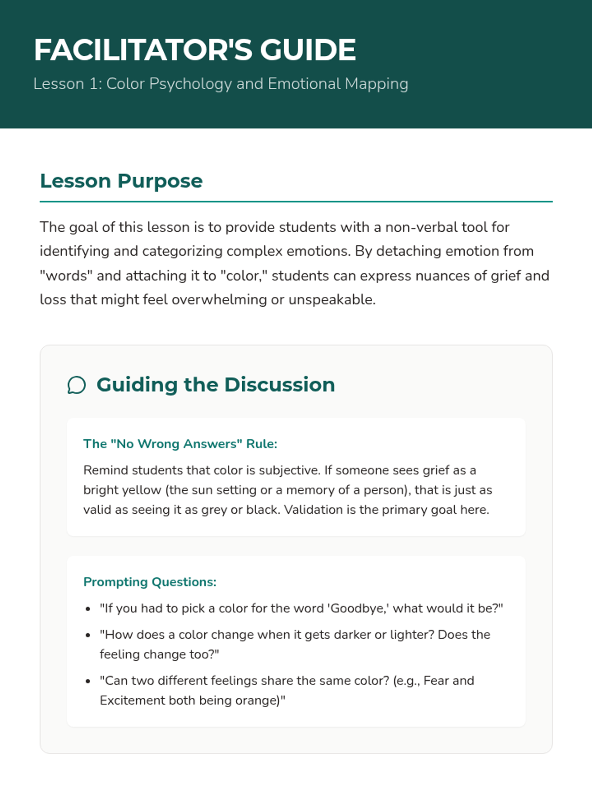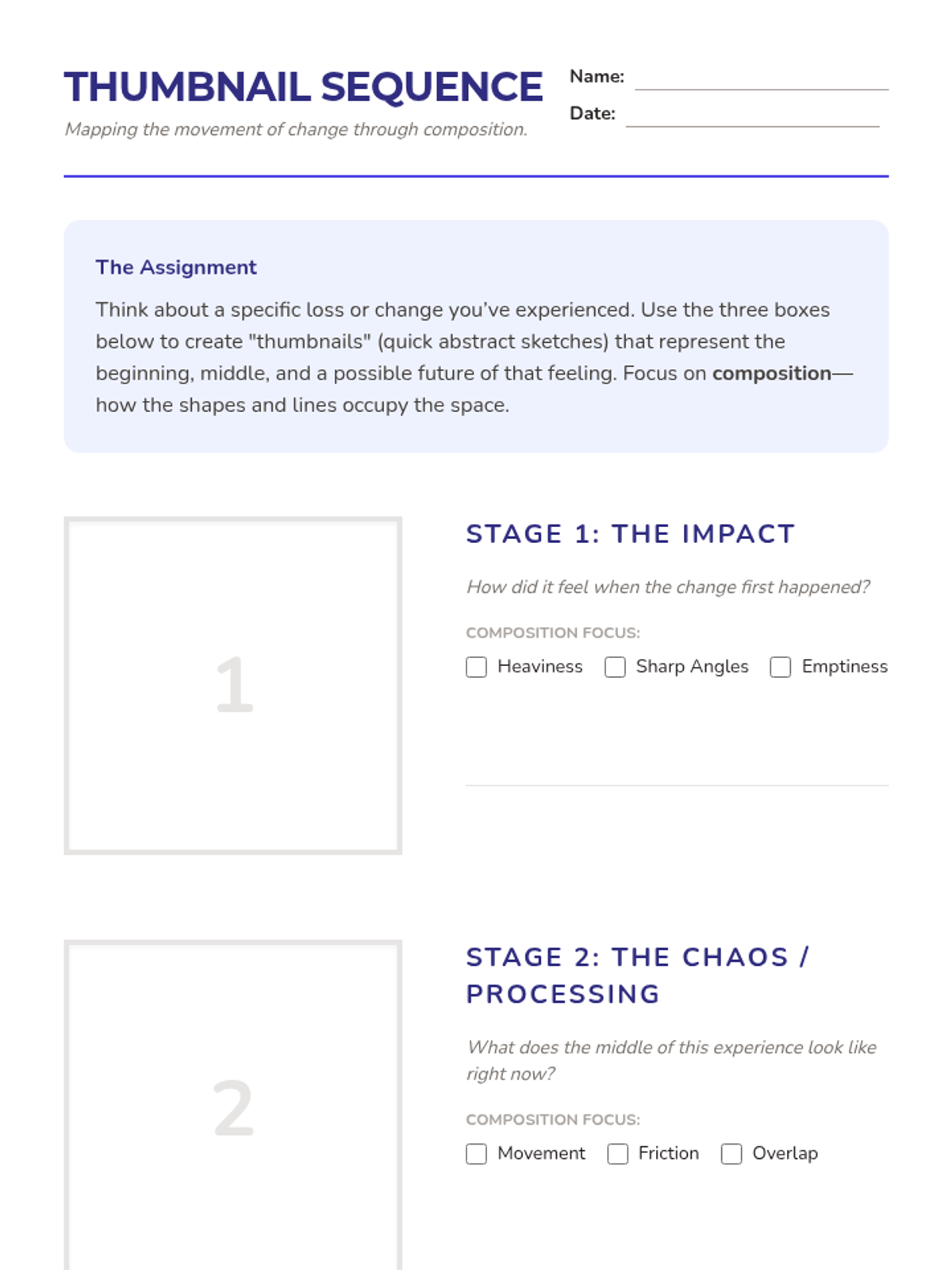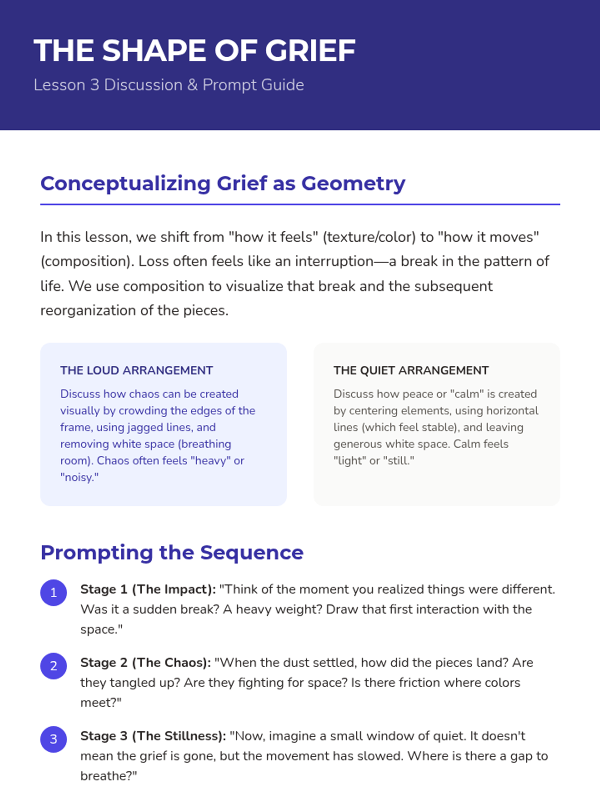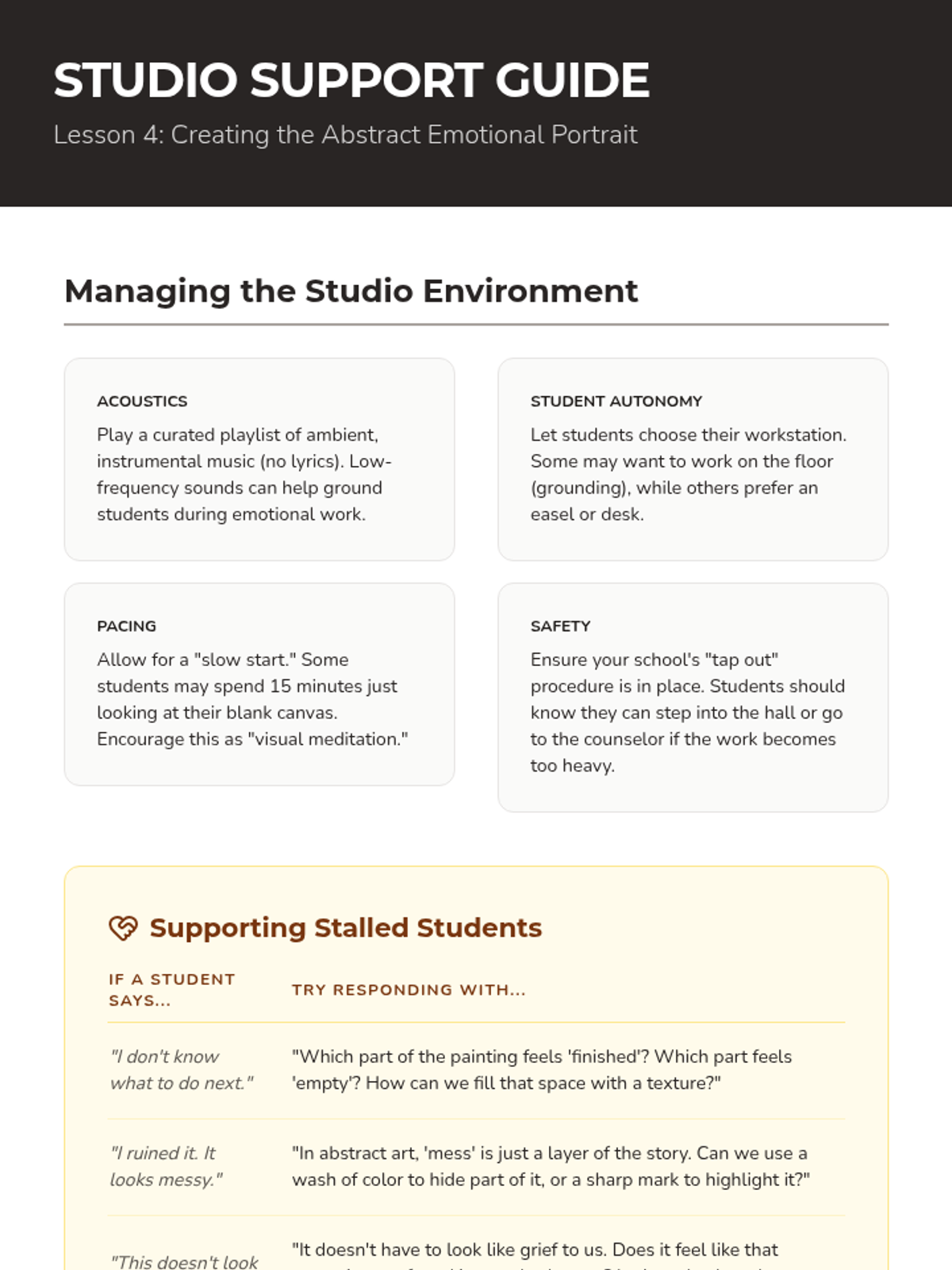 A 5-lesson sequence for 7th graders to explore abstract art as a medium for processing loss and transition, focusing on color psychology, texture, and composition.