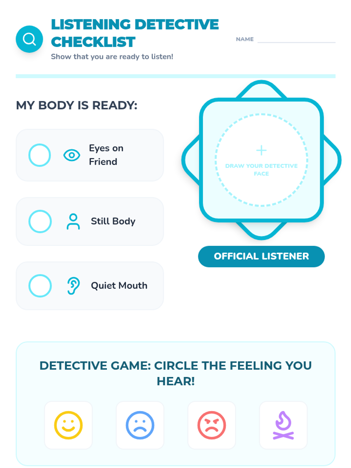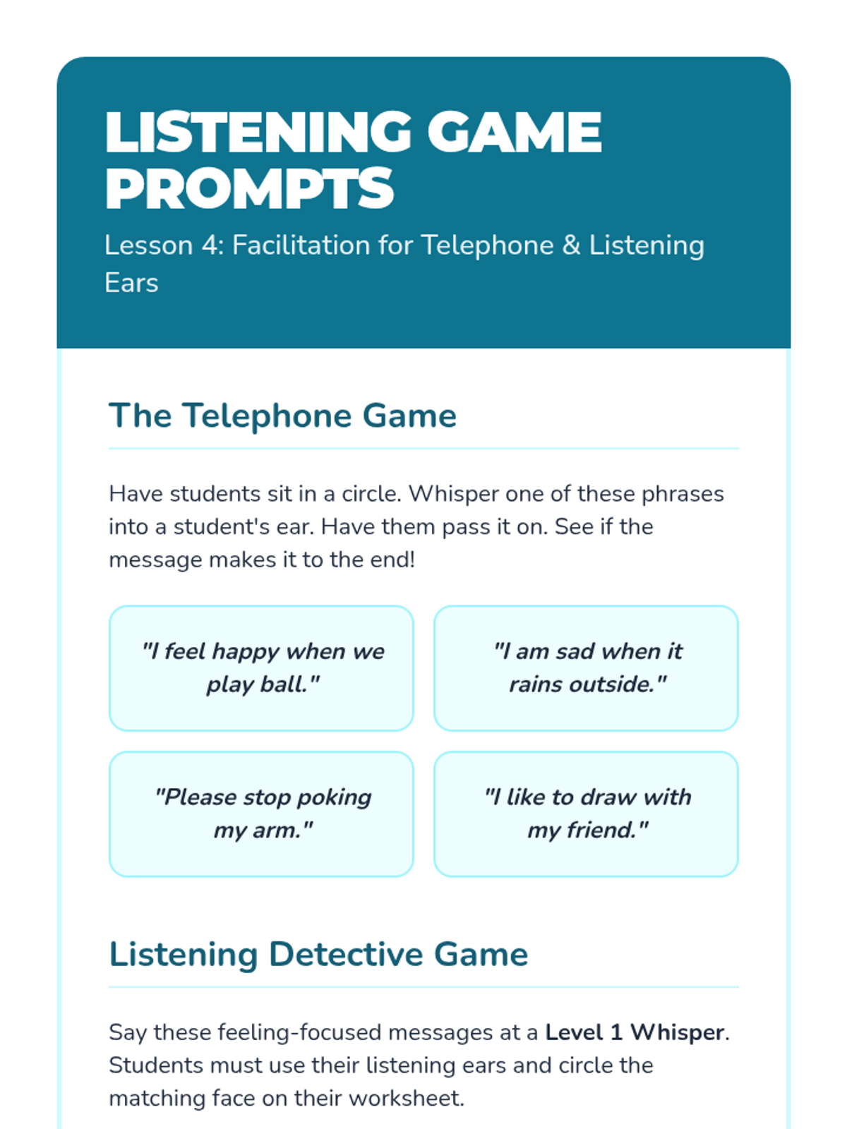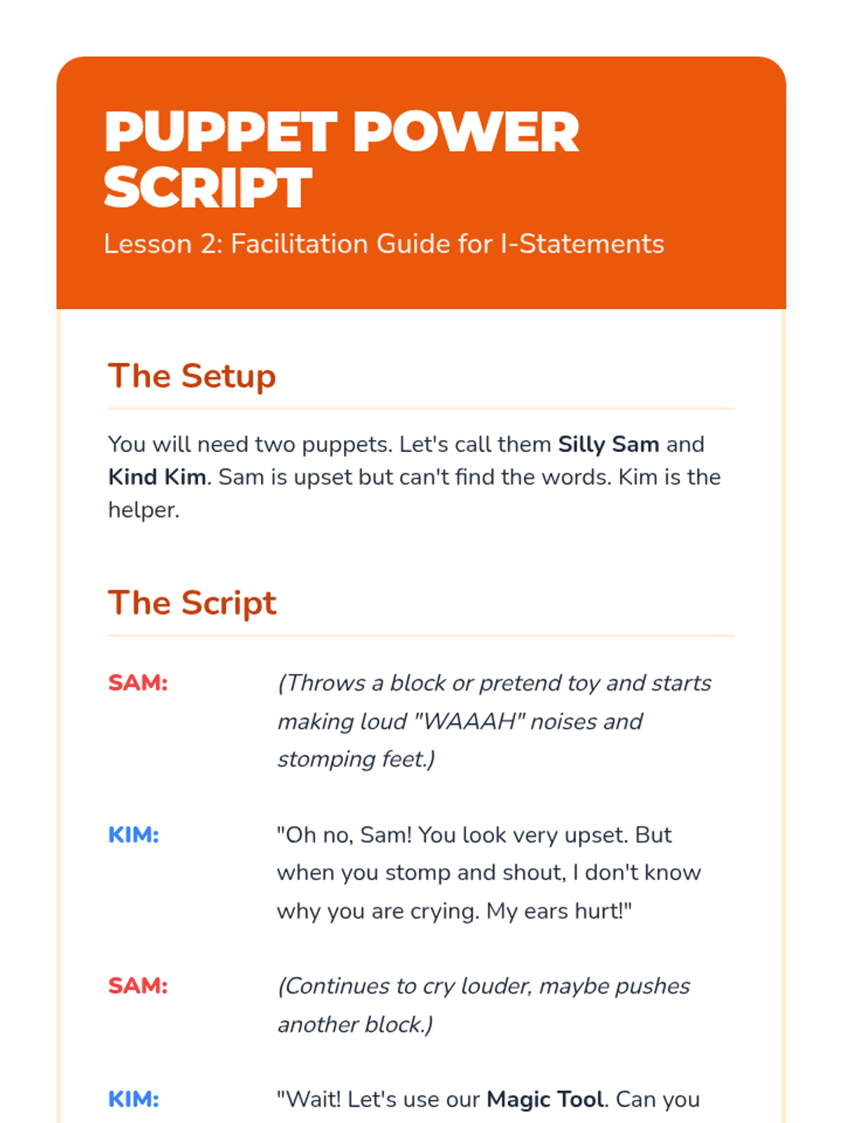 A Kindergarten sequence focused on building emotional literacy and verbal communication skills. Students learn to identify emotions, use I-Statements, regulate tone and body language, and practice active listening to resolve conflicts peacefully.