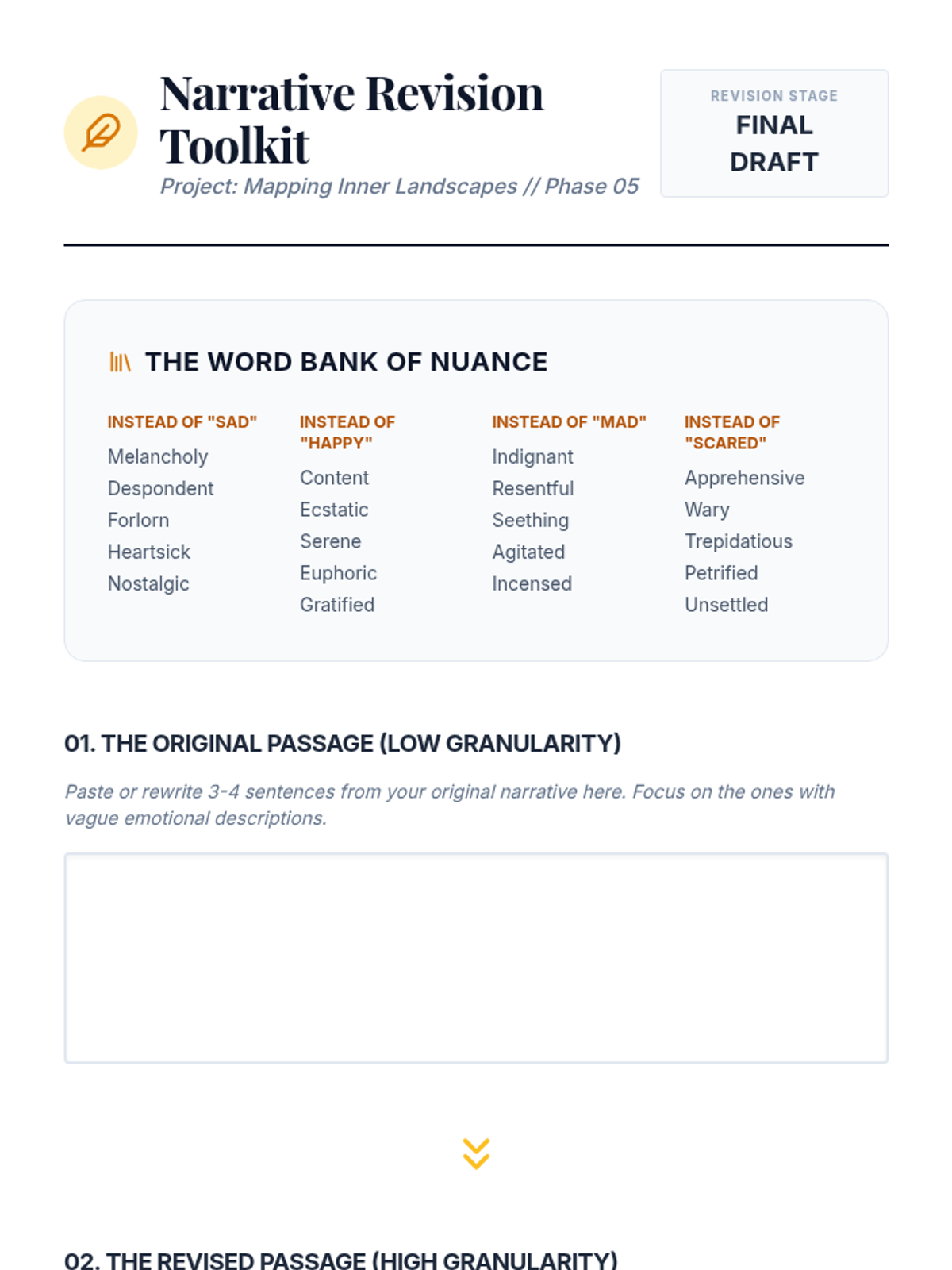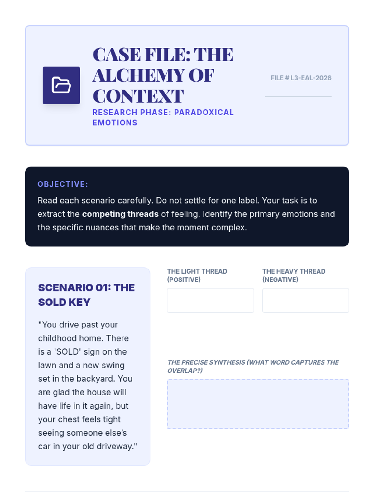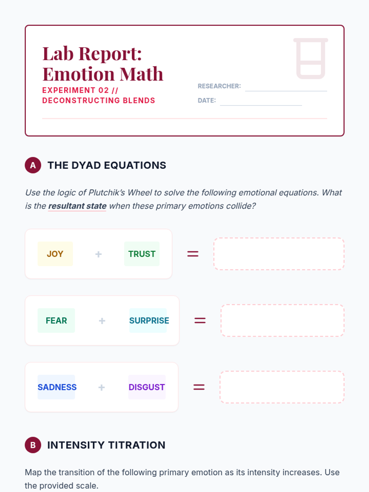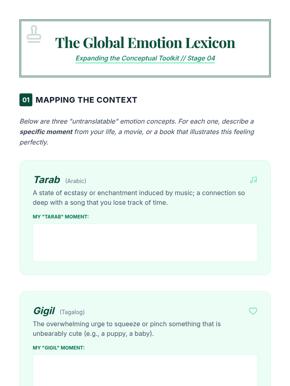 A 12th-grade sequence focused on developing emotional granularity. Students move from basic emotion labeling to nuanced articulation using psychological frameworks like Plutchik's Wheel and cross-cultural concepts to improve emotional regulation and communication.