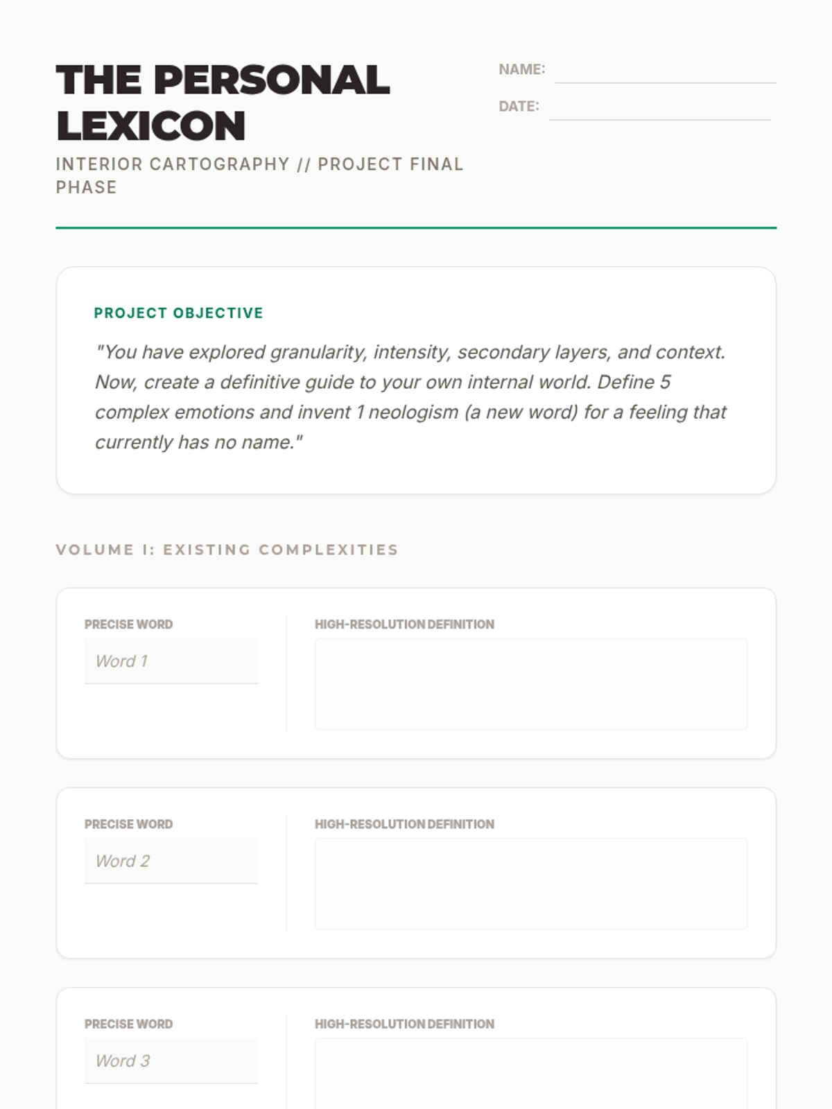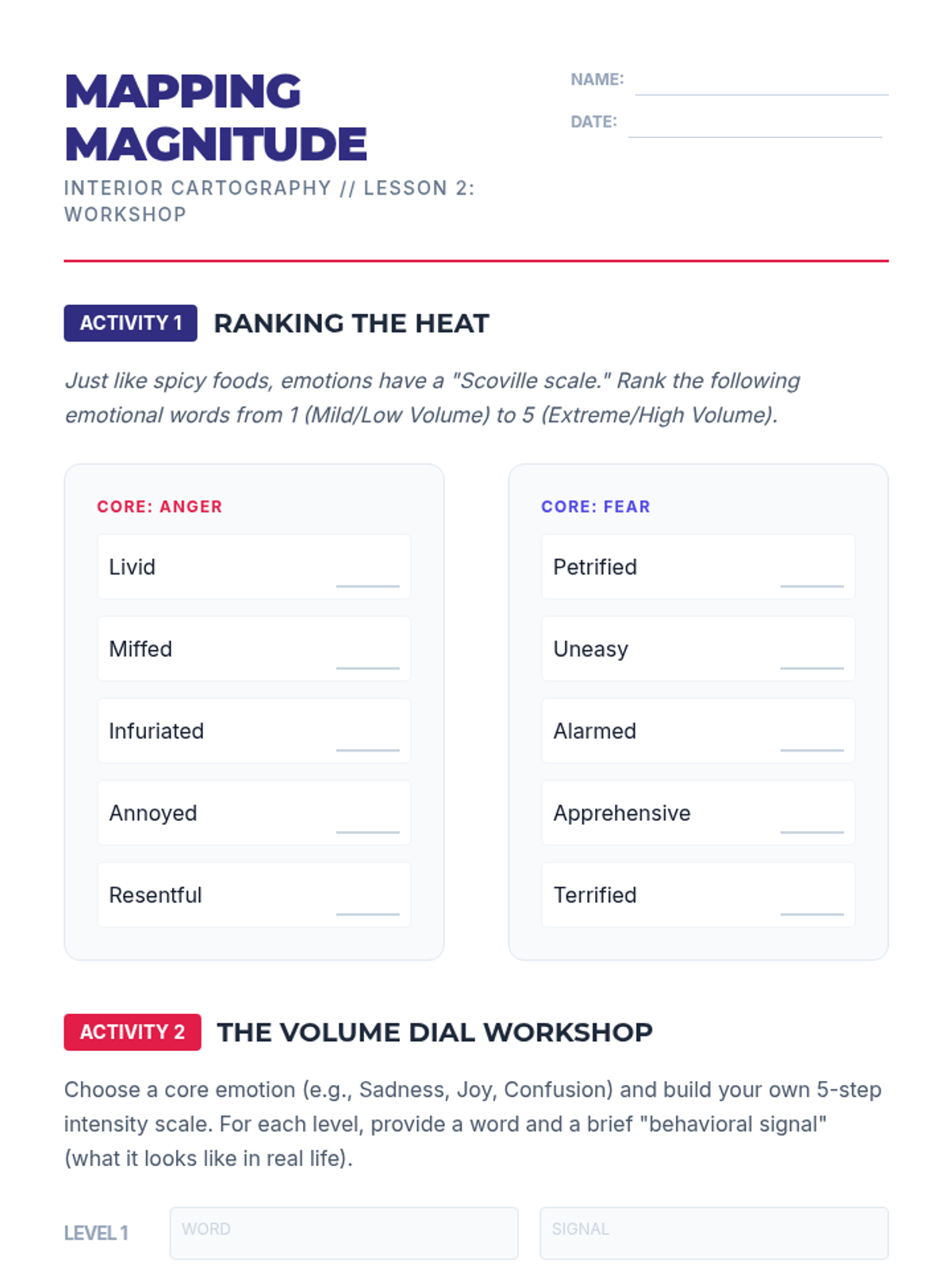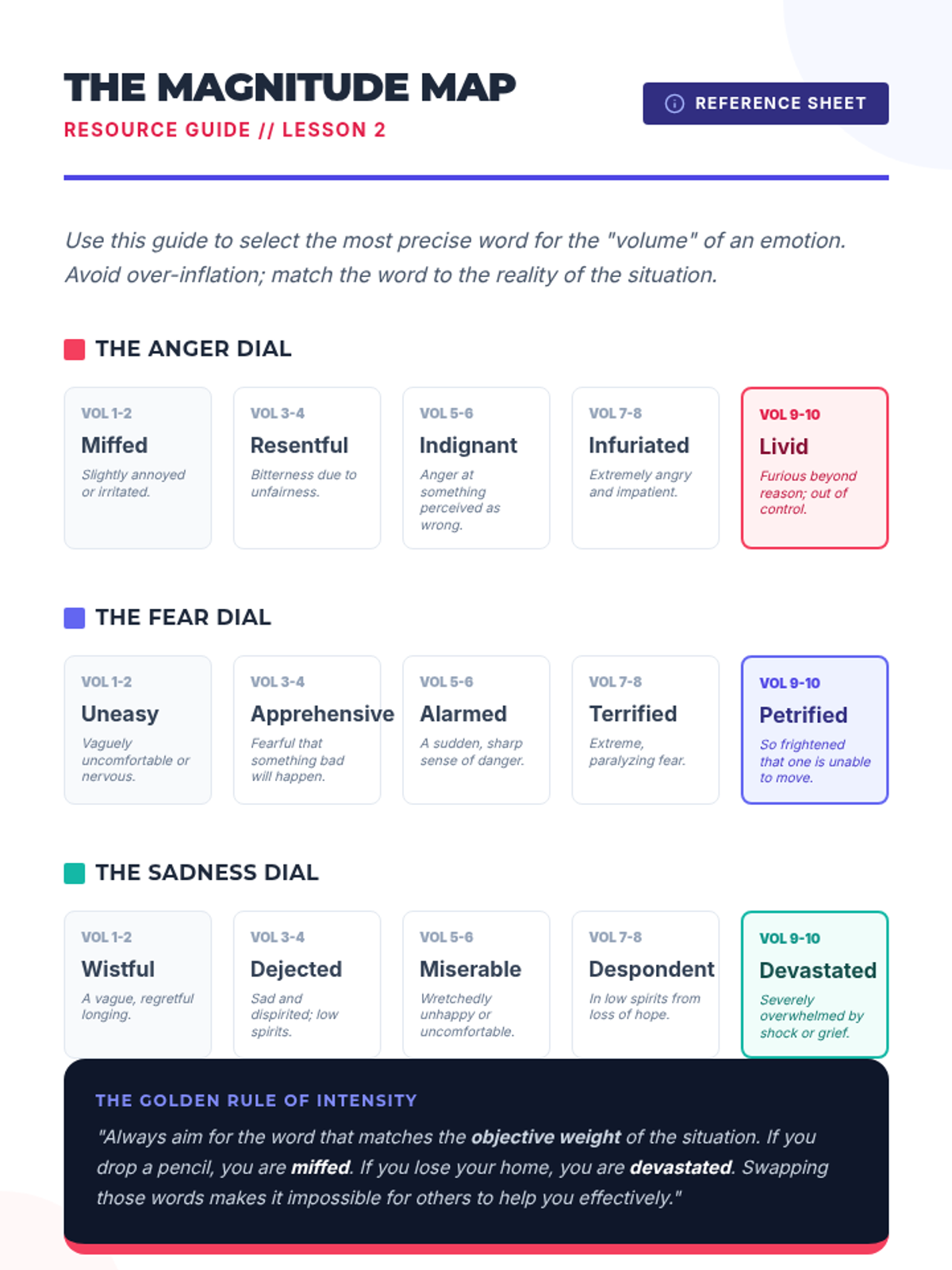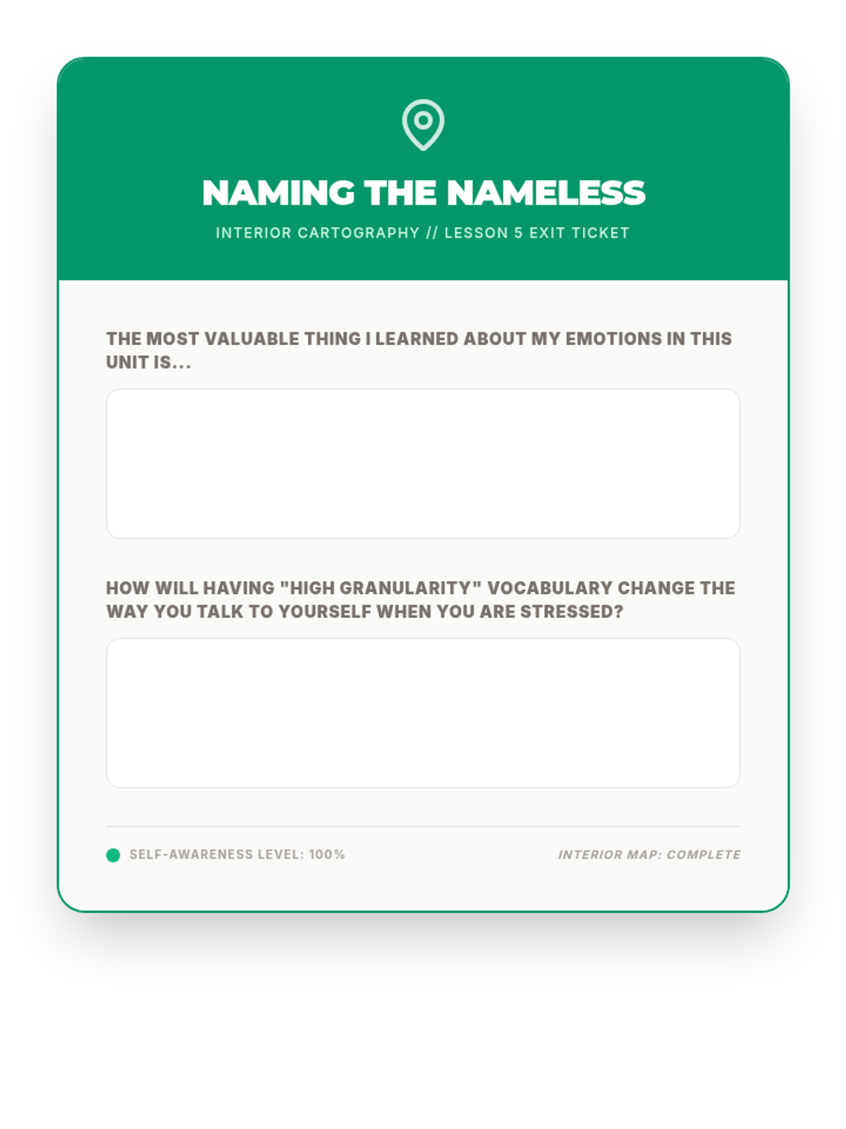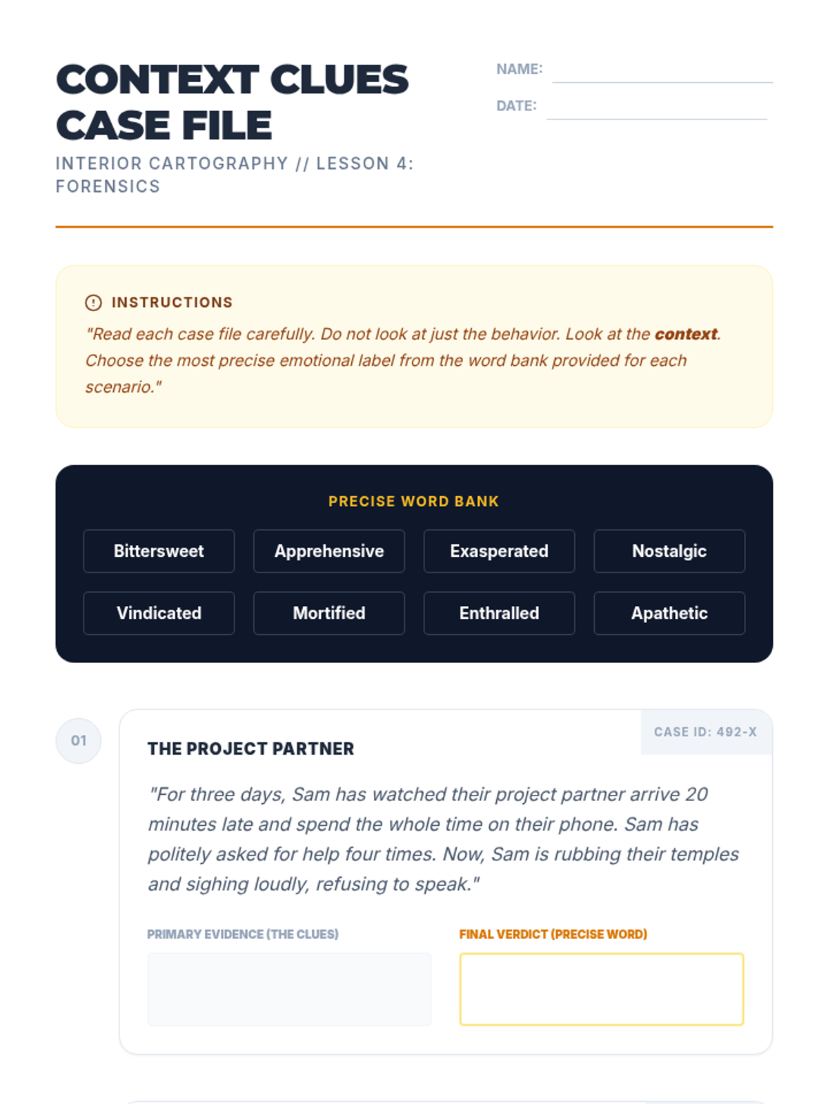 This sequence helps 9th-grade students develop emotional granularity by moving from basic labels to precise, high-resolution emotional vocabulary. Students explore intensity, secondary emotions, and context to build a robust personal lexicon for better self-regulation and communication.