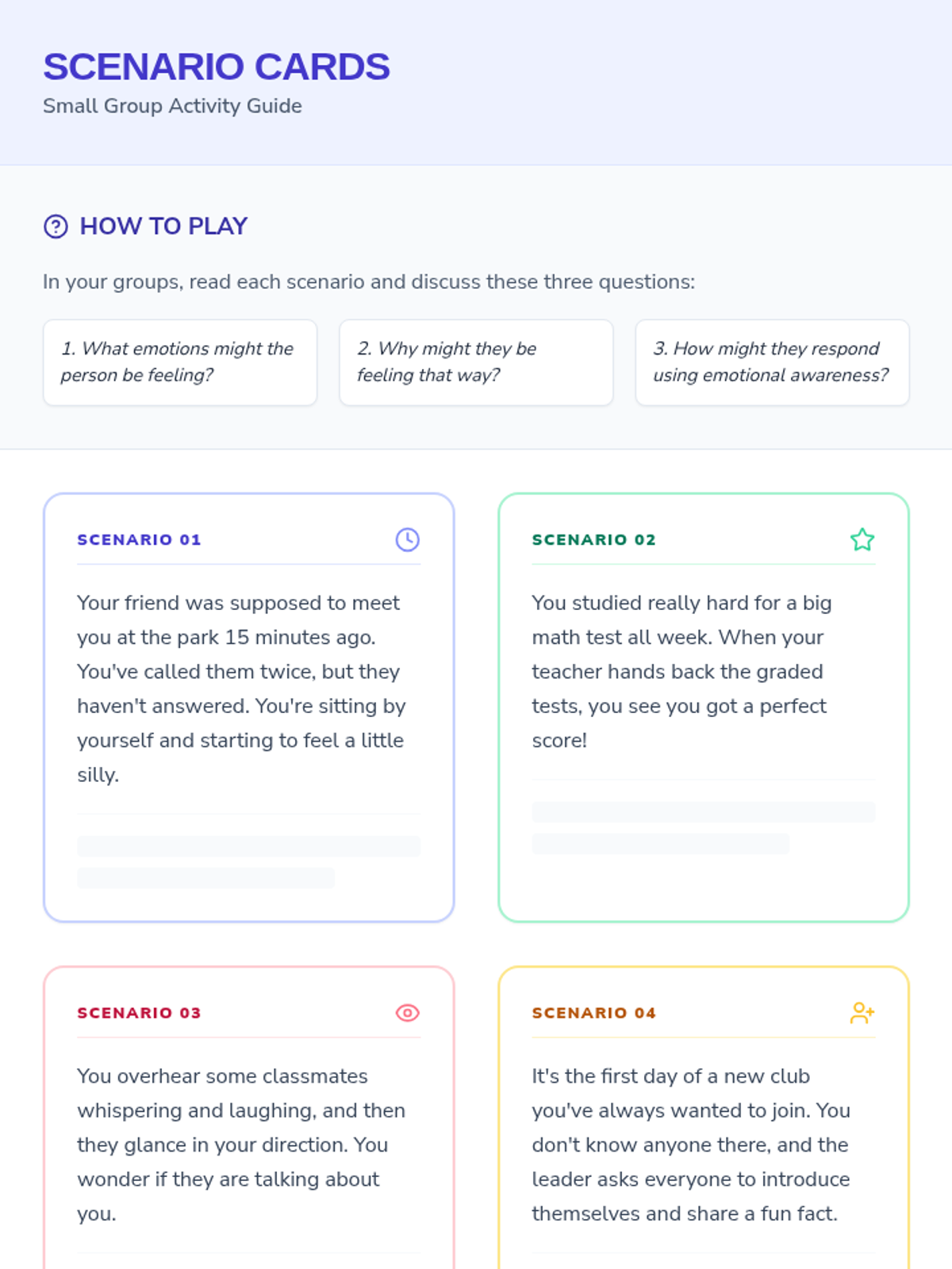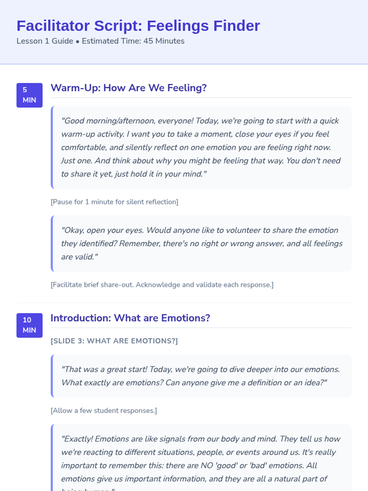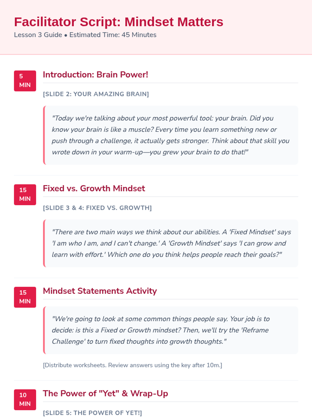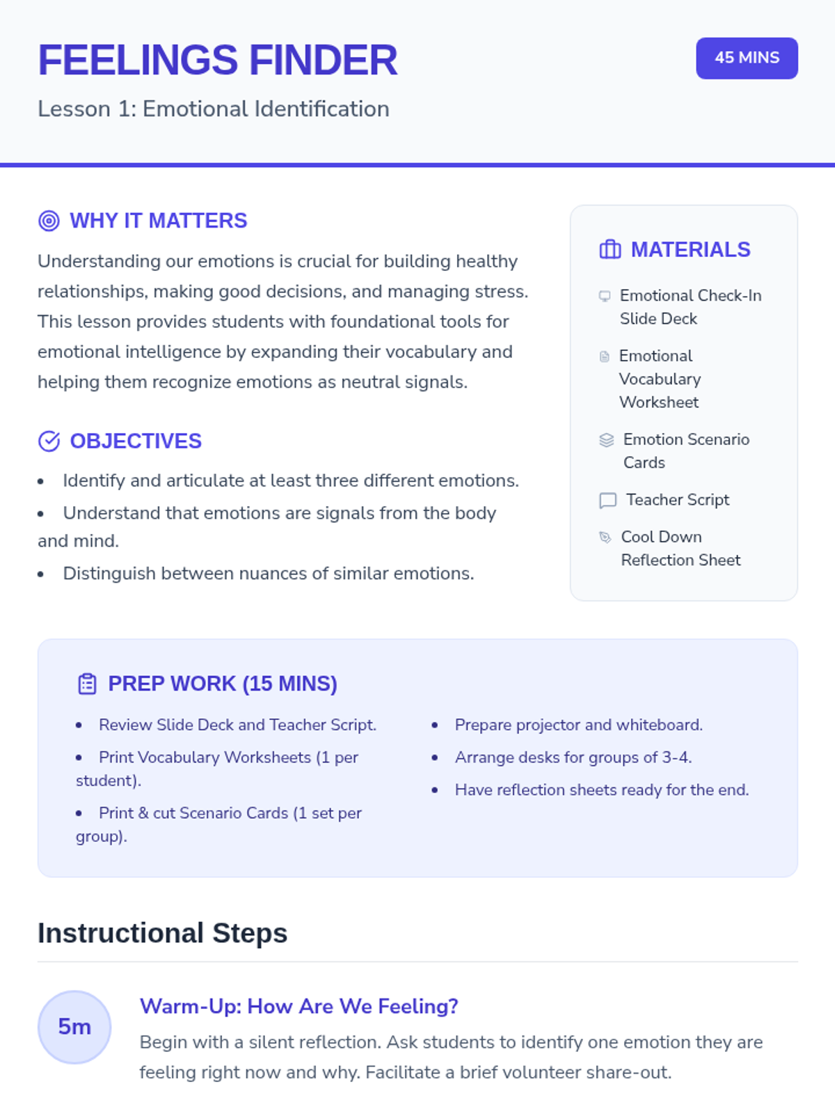 A three-part sequence designed for middle school students to develop foundational social-emotional skills, including emotional identification, stress management, and cultivating a growth mindset.