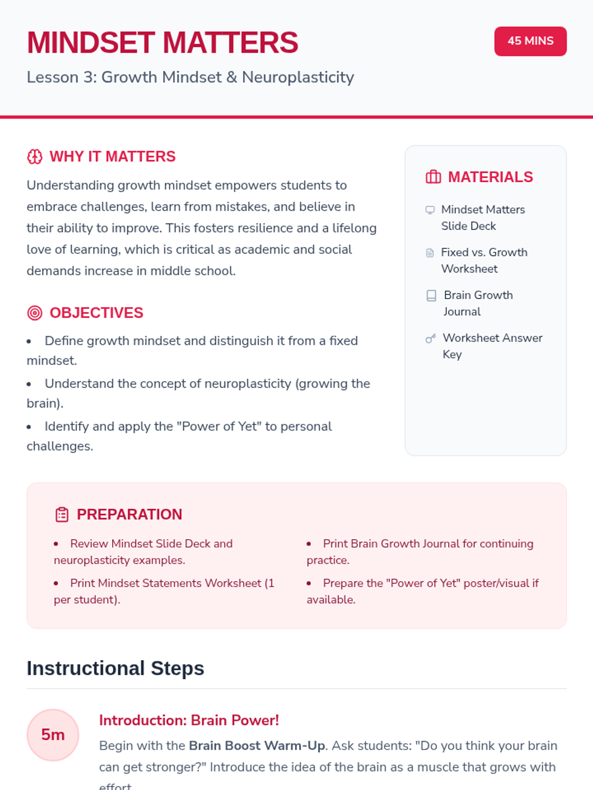 A series of high-impact 15-minute mini-lessons designed to help 6th graders navigate the transition to middle school, focusing on stress management, social boundaries, and professional communication with educators.