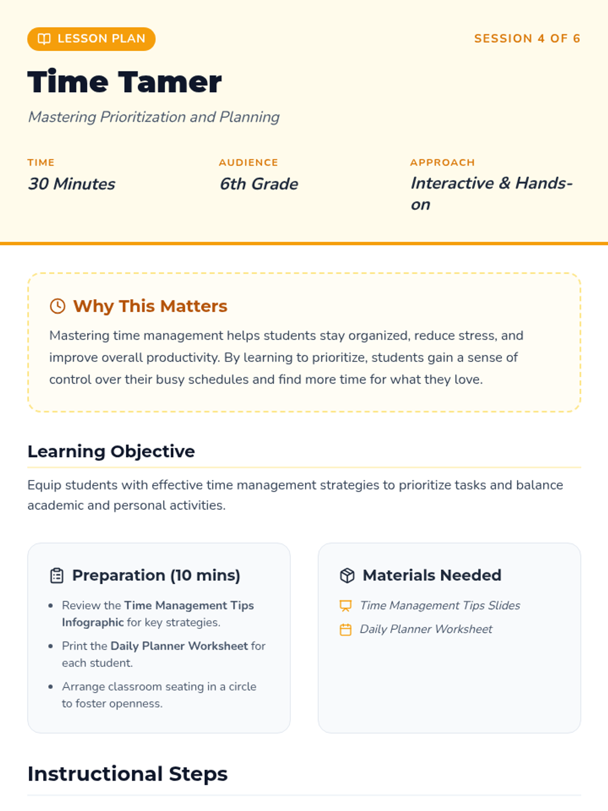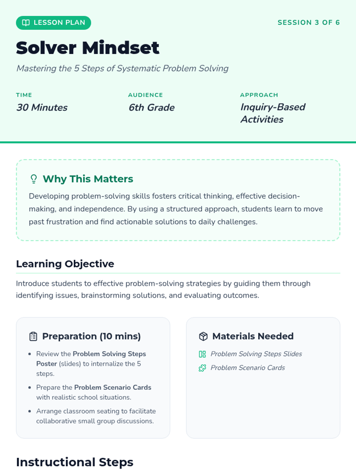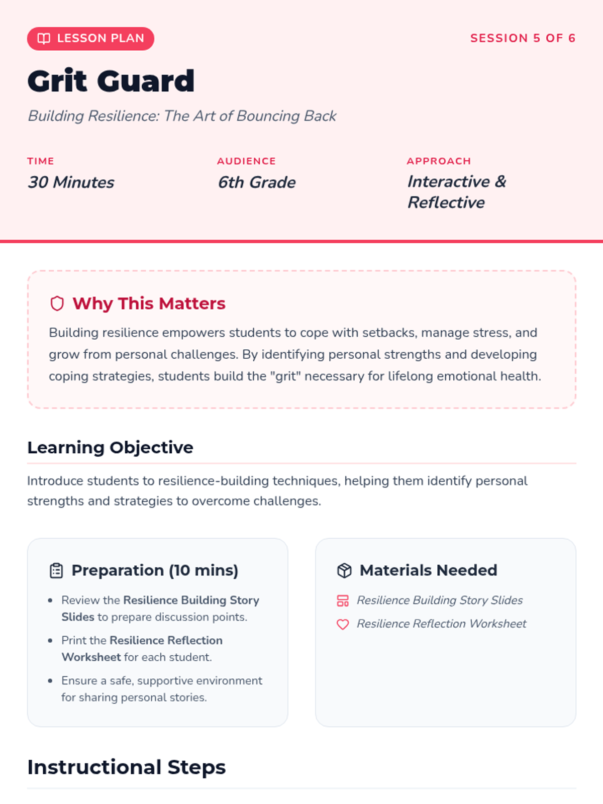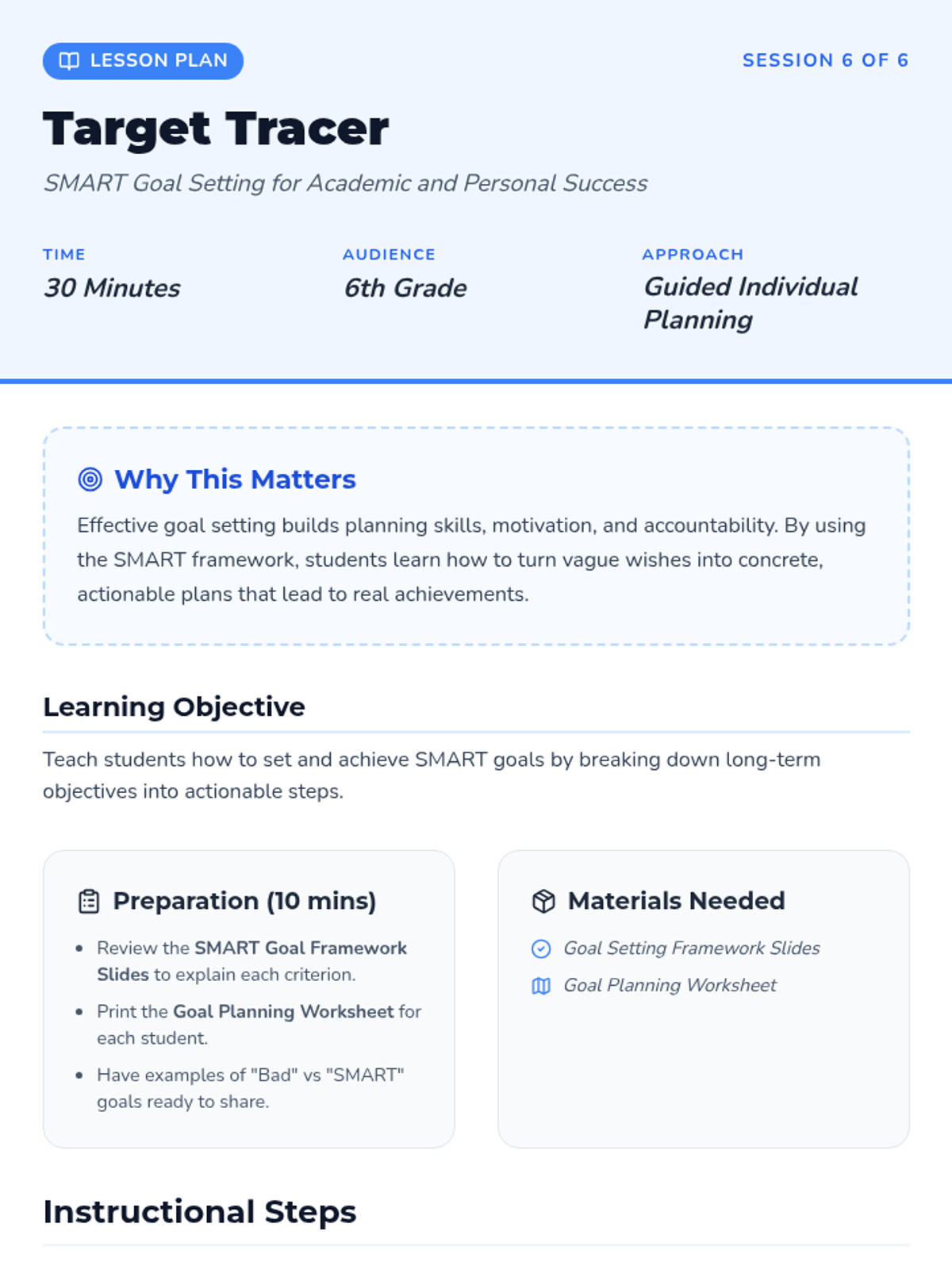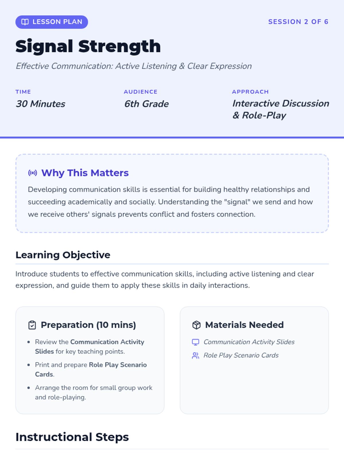 A comprehensive 6-session sequence designed for 6th graders to develop core emotional intelligence skills, including emotional literacy, communication, problem-solving, time management, resilience, and goal setting.