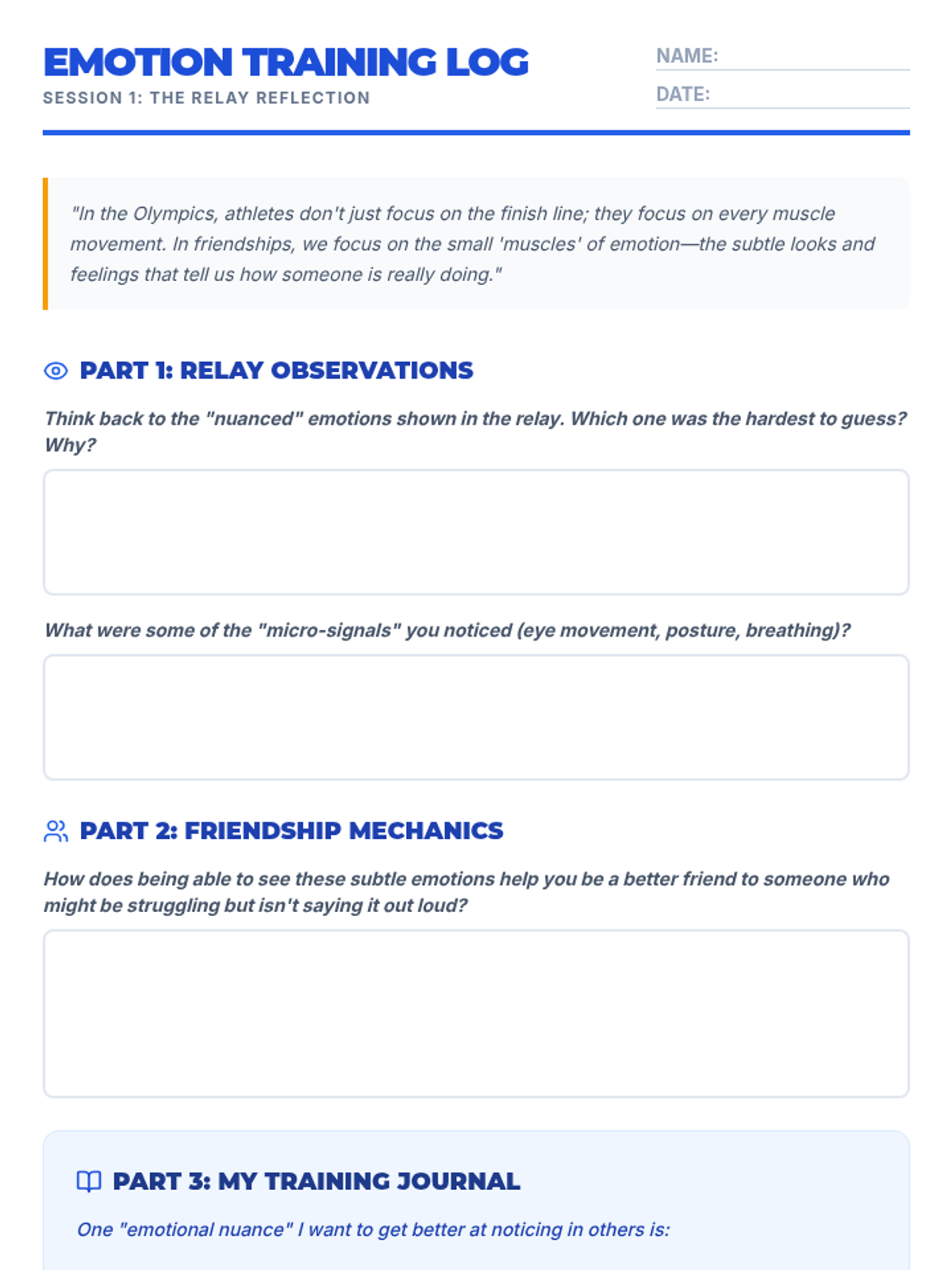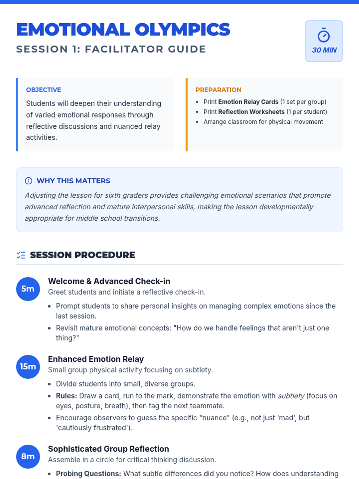 A two-session social-emotional learning sequence for sixth graders that uses an athletic 'Olympic' theme to teach students how to navigate friendships with peers of varying emotional maturity levels through empathy and sophisticated awareness.