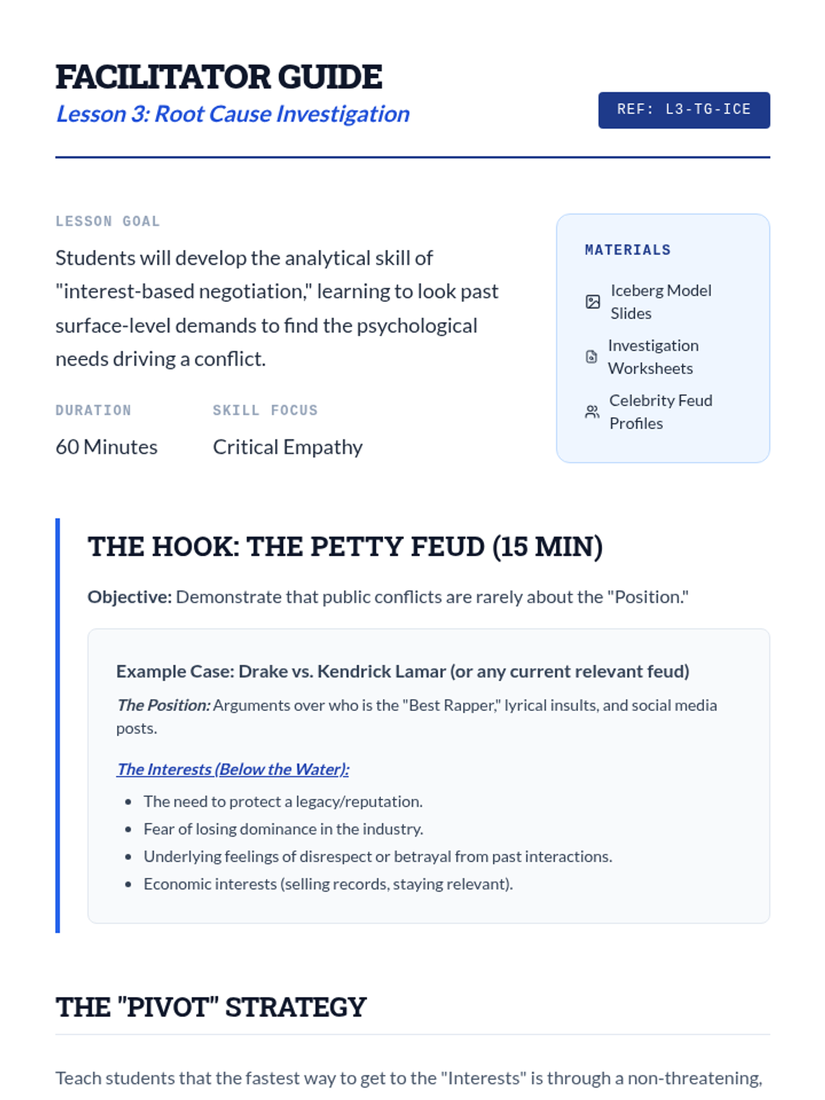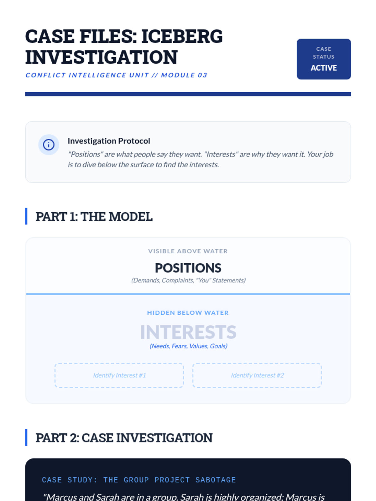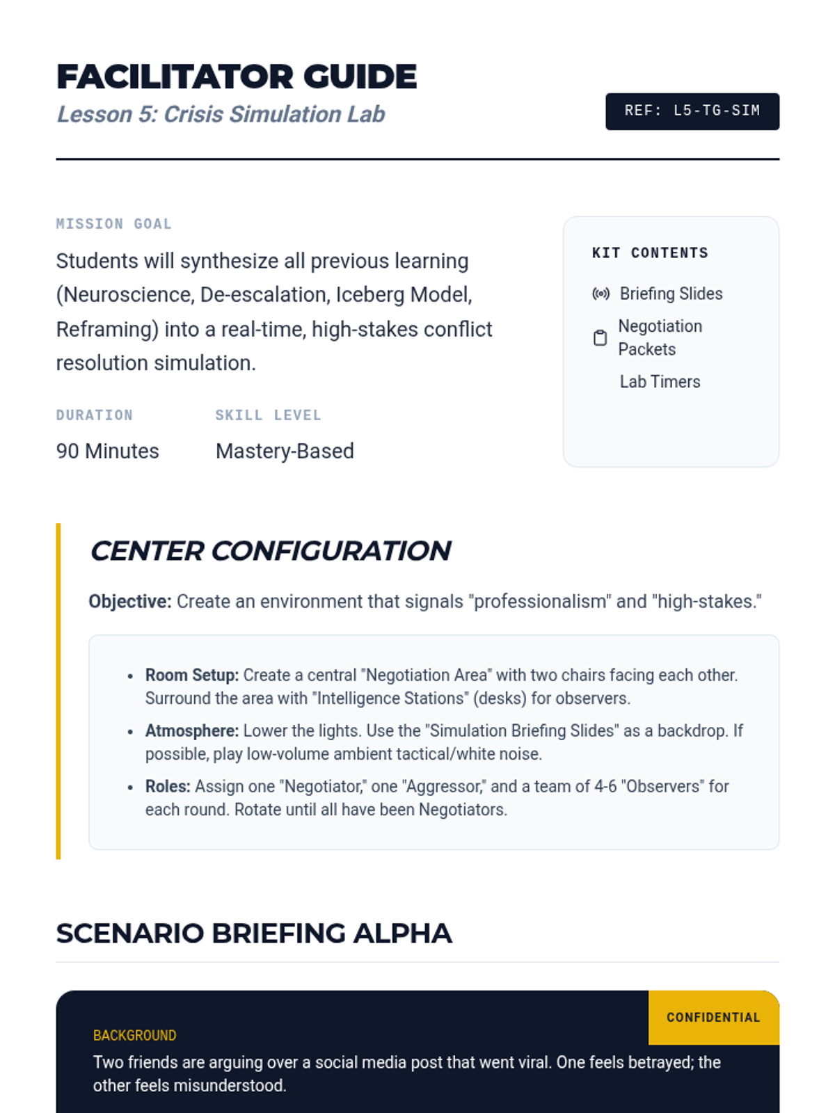 A comprehensive 5-lesson sequence on the psychological and interpersonal mechanics of managing high-conflict situations. Students explore the neuroscience of anger, practice verbal and non-verbal de-escalation, use the Iceberg Model to find root causes, and master assertive communication through simulations.