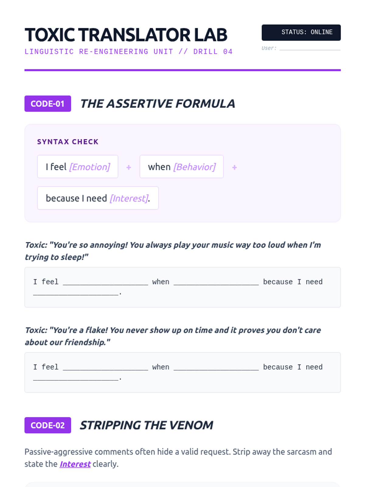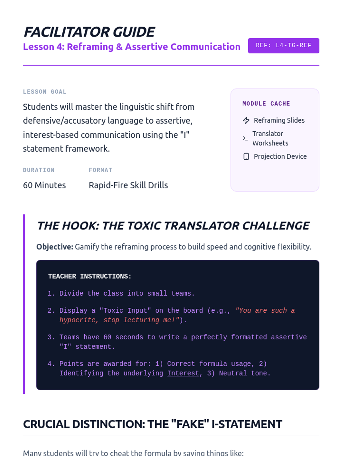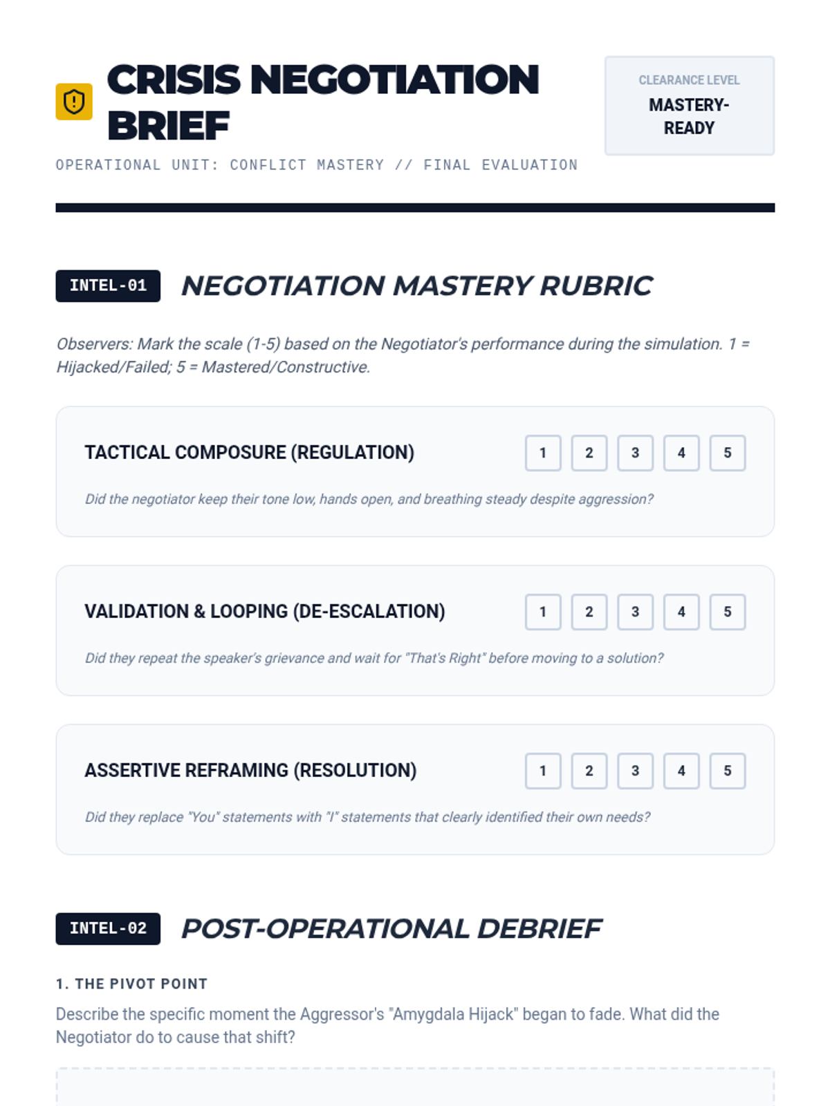 A comprehensive 5-lesson sequence on the psychological and interpersonal mechanics of managing high-conflict situations. Students explore the neuroscience of anger, practice verbal and non-verbal de-escalation, use the Iceberg Model to find root causes, and master assertive communication through simulations.