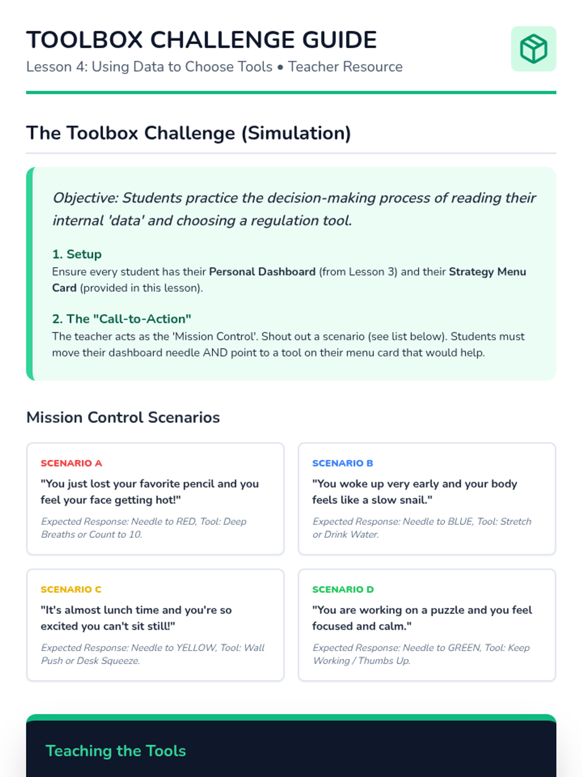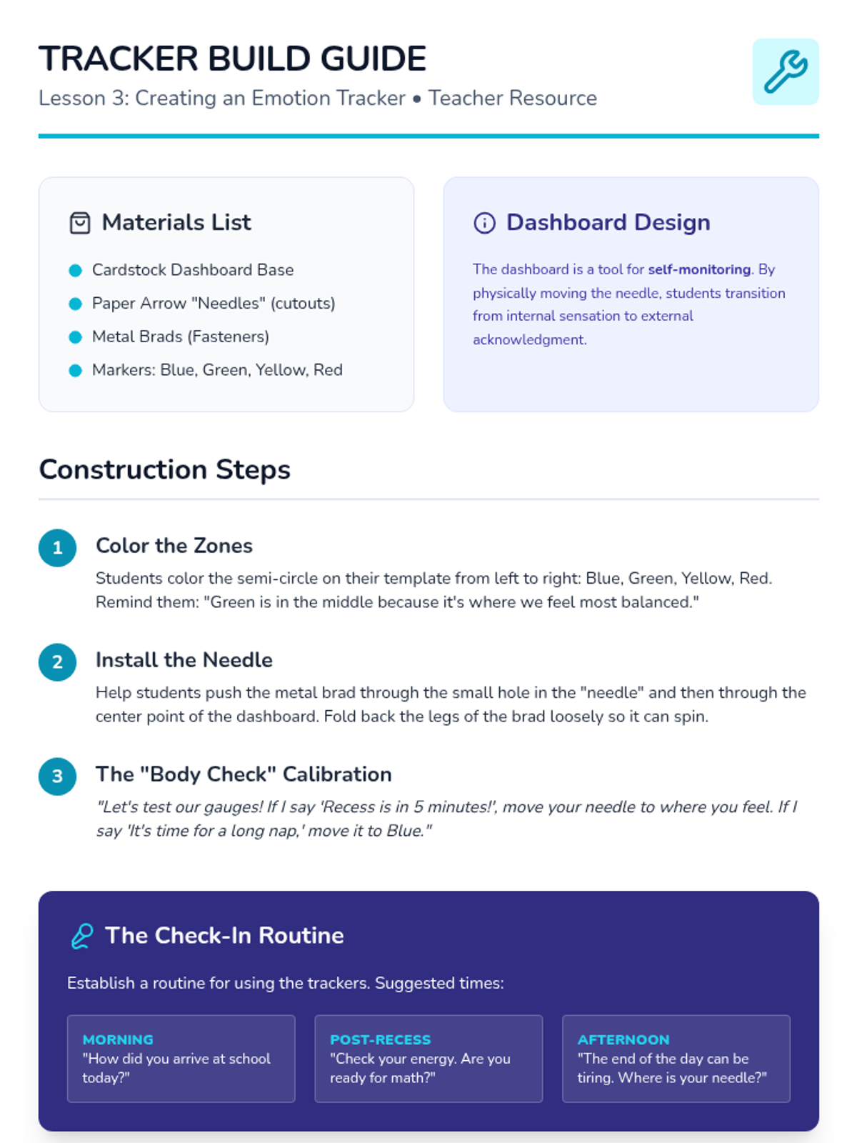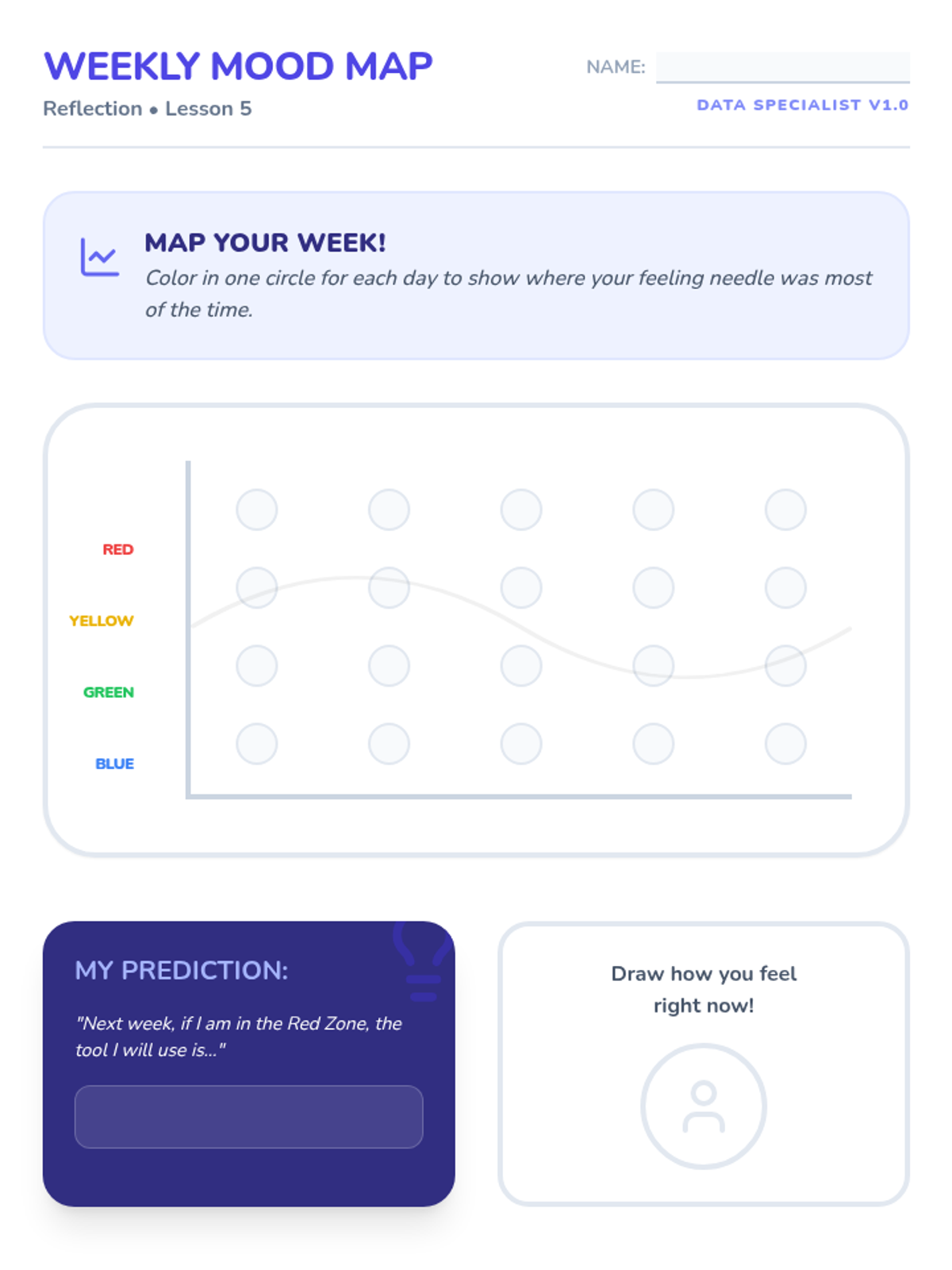 A 1st Grade sequence connecting behavioral tracking to emotional literacy. Students explore color-coded regulation zones, create personal tracking tools, and learn to select coping strategies based on their internal 'data'.
