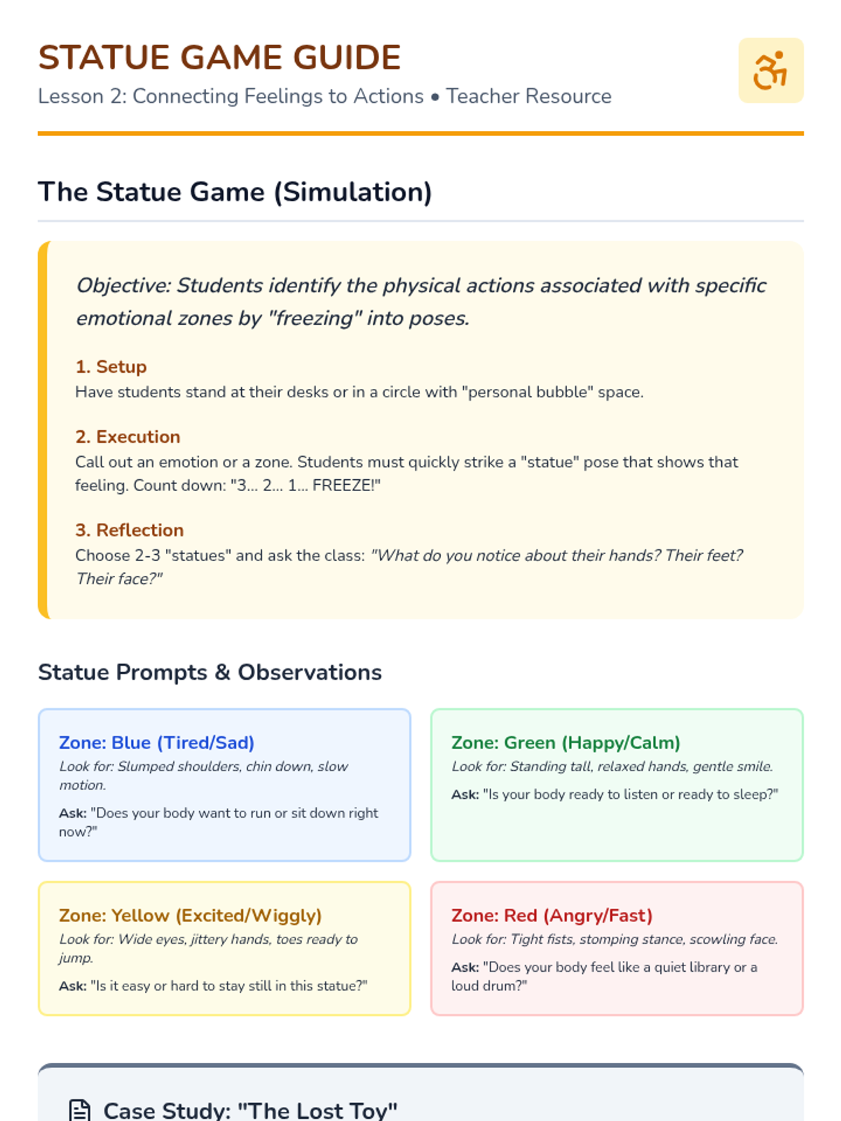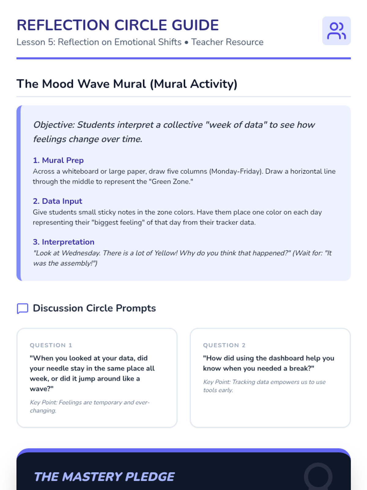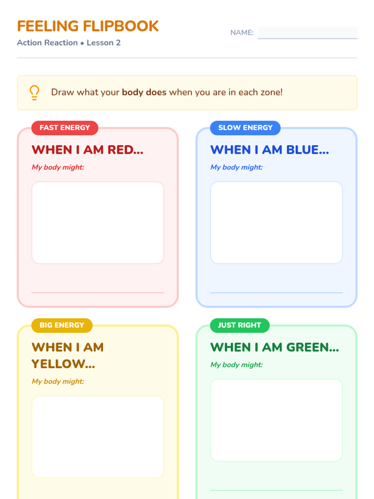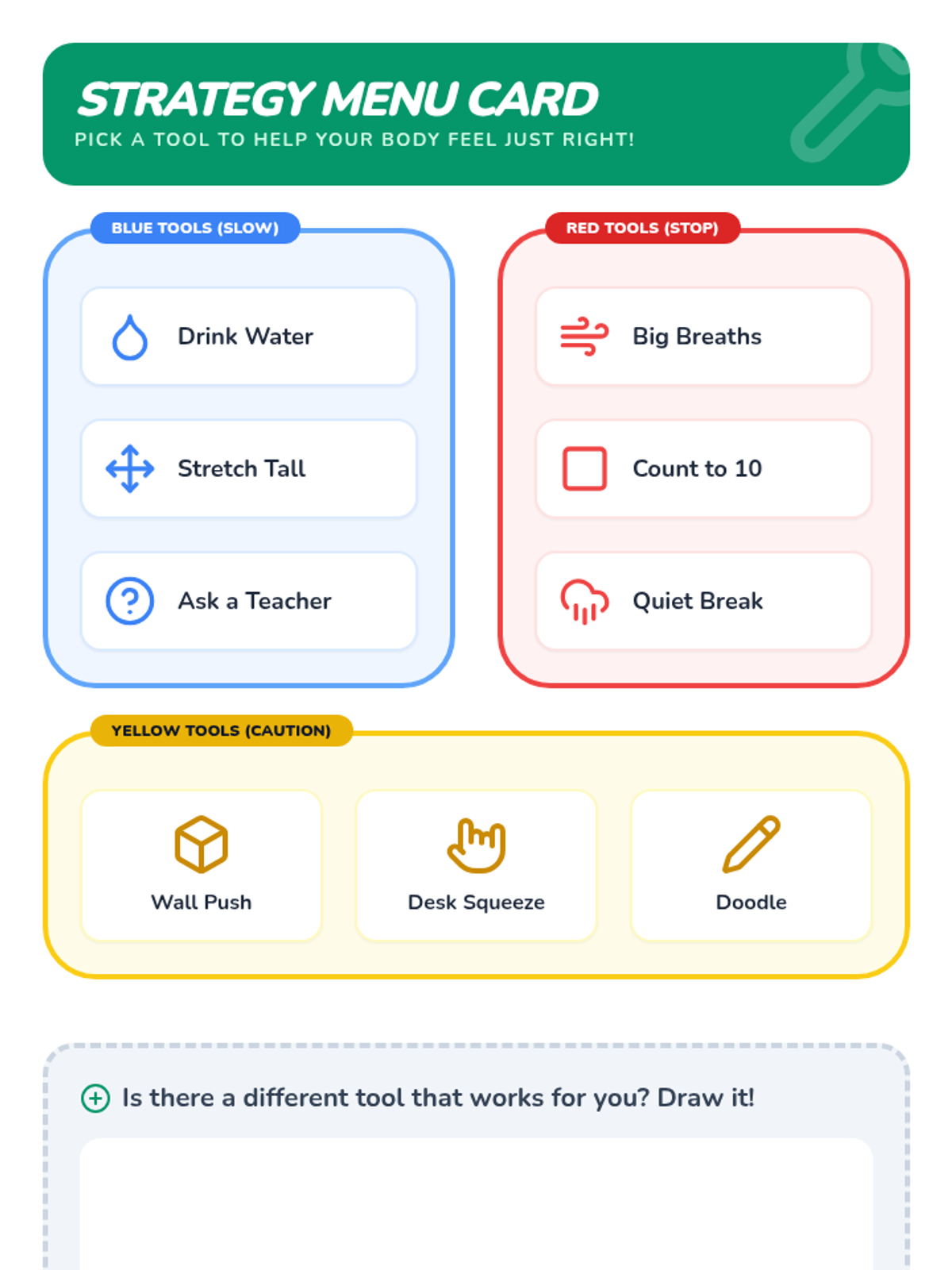 A 1st Grade sequence connecting behavioral tracking to emotional literacy. Students explore color-coded regulation zones, create personal tracking tools, and learn to select coping strategies based on their internal 'data'.