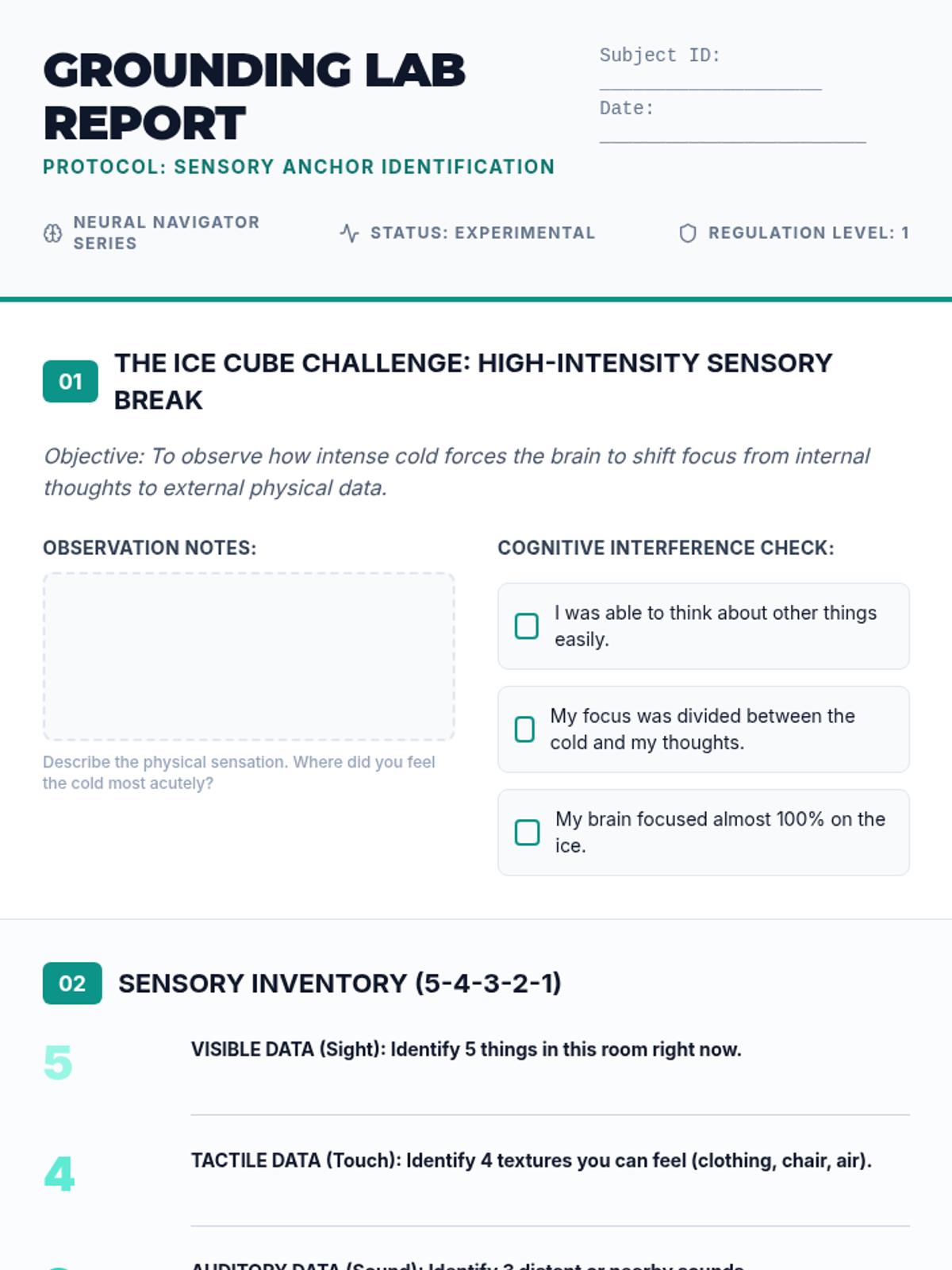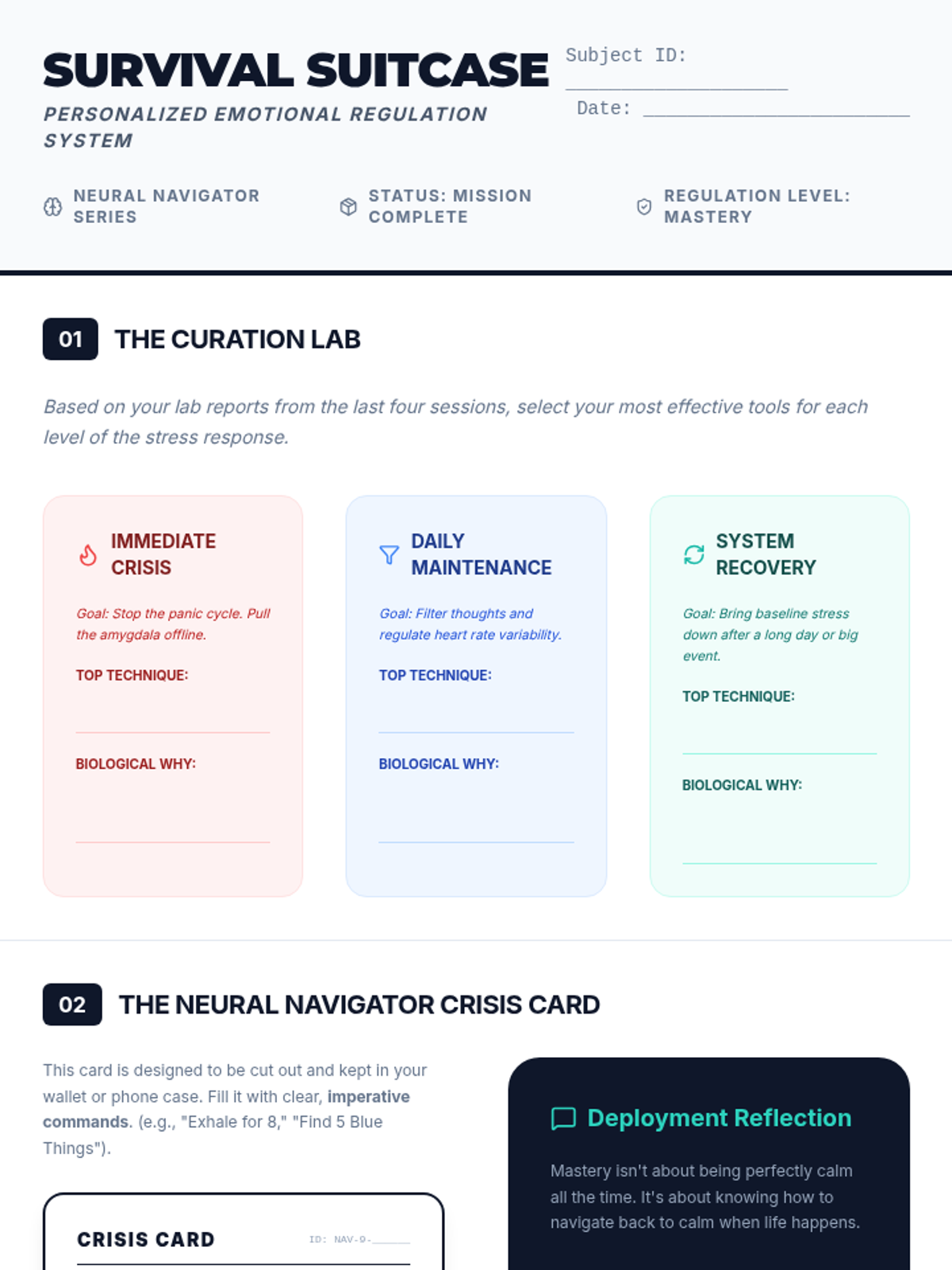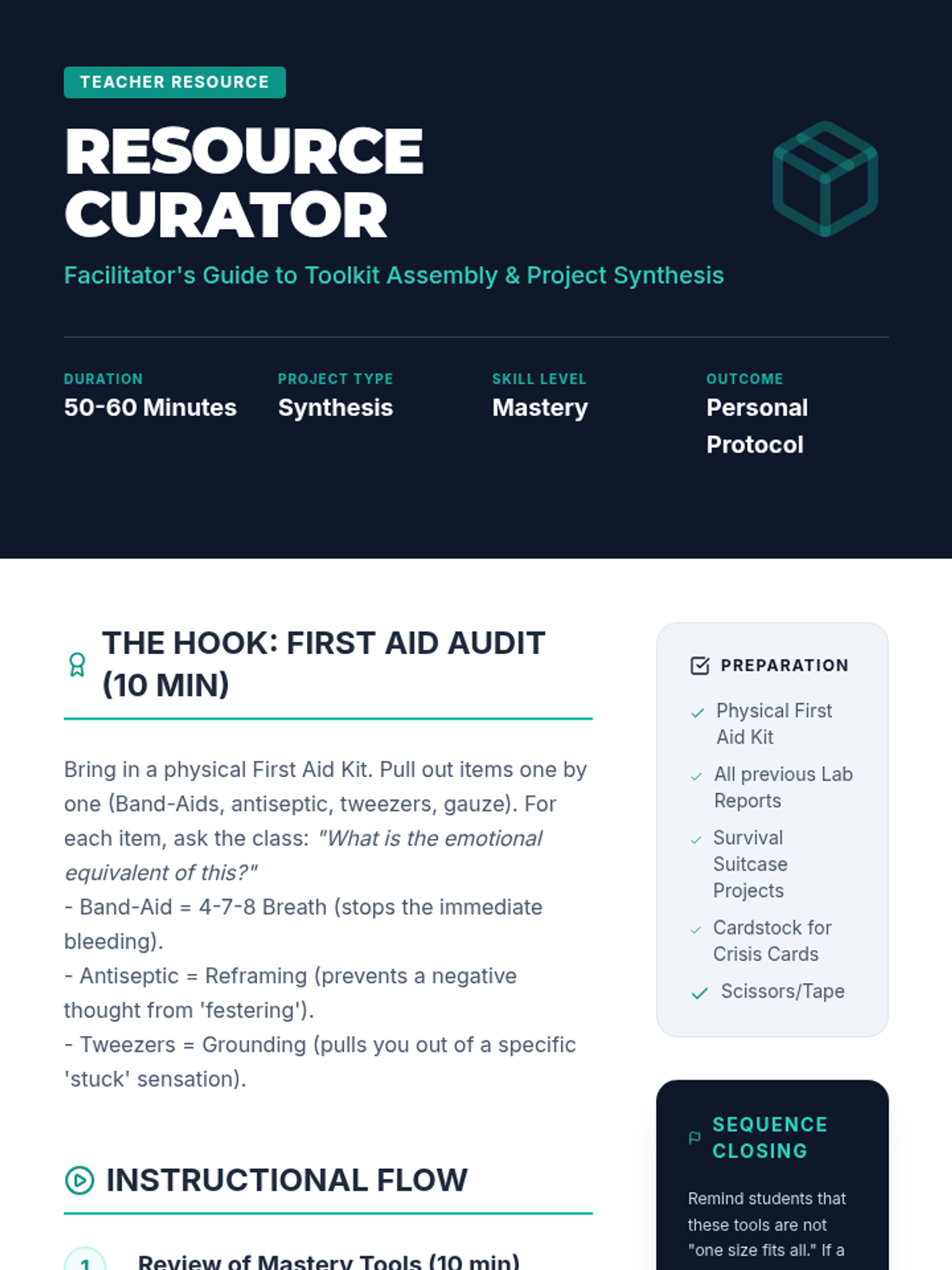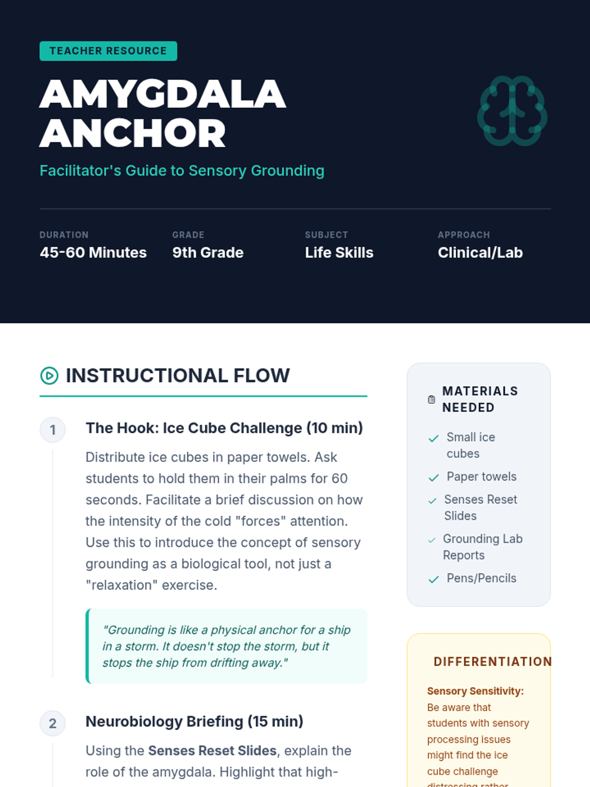 This sequence introduces 9th-grade students to clinical-style emotional regulation and stabilization techniques. Students move from physiological 'bottom-up' approaches (grounding, breathing, movement) to cognitive 'top-down' strategies (reframing), culminating in the creation of a personalized coping toolkit.