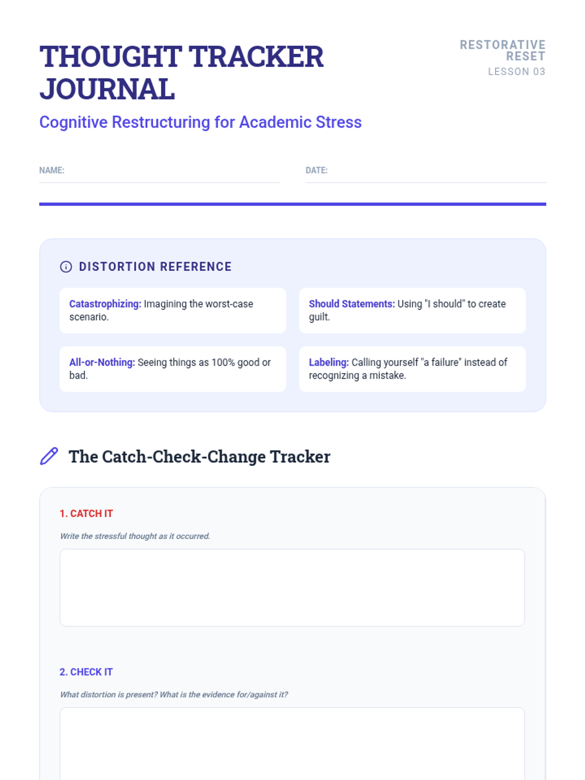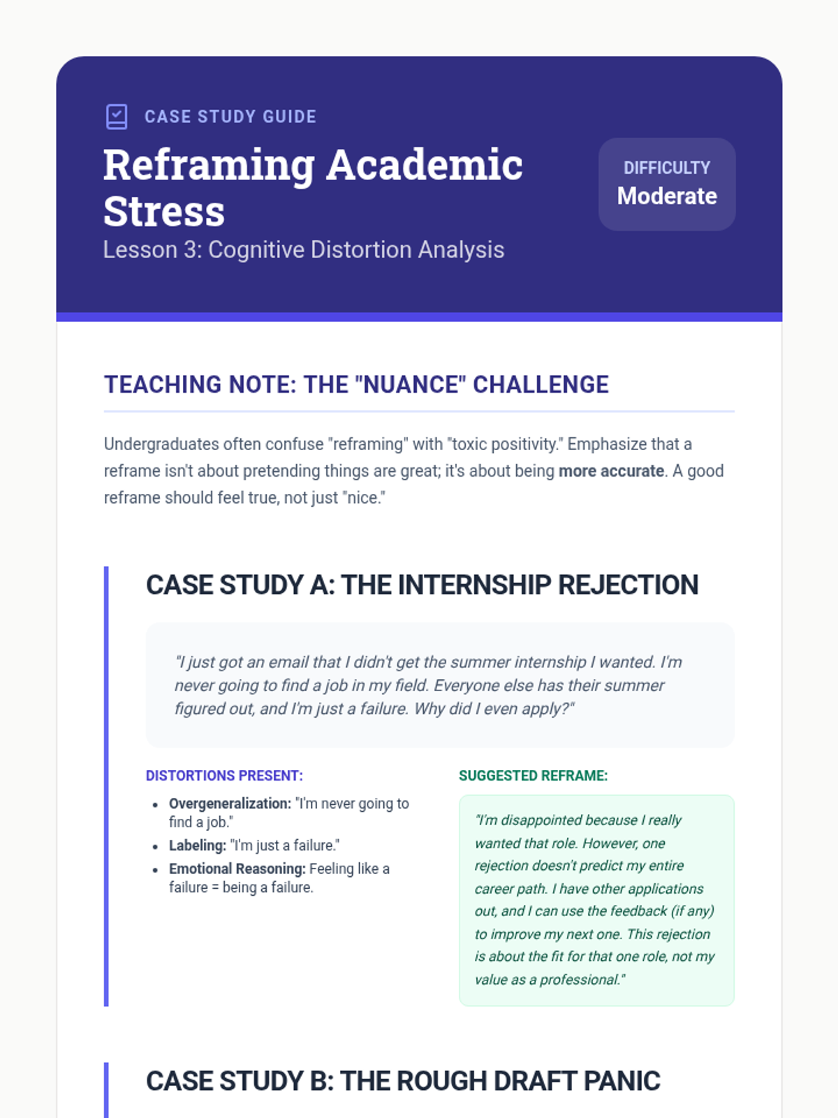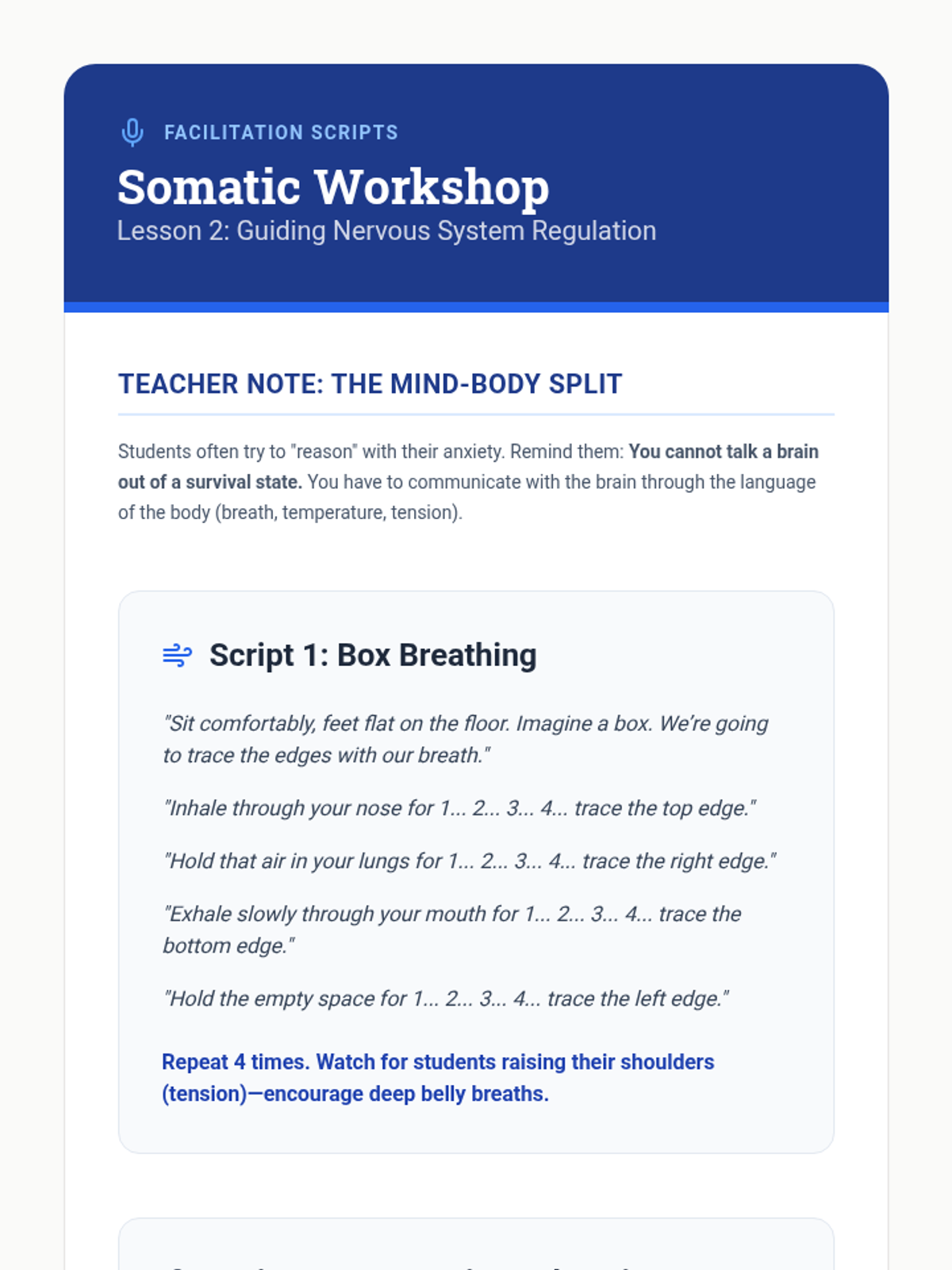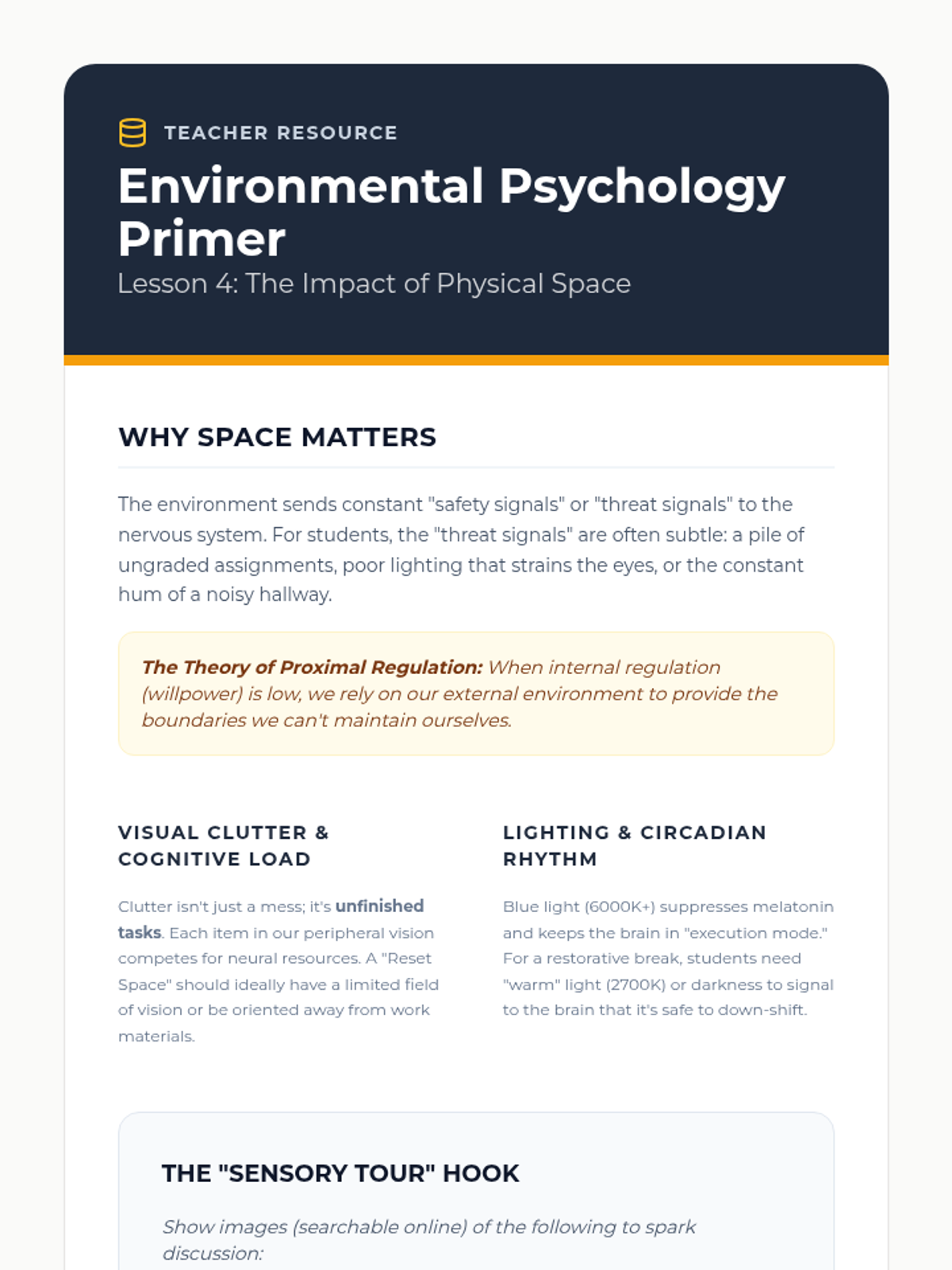 A 5-lesson sequence for undergraduate students focused on transforming requested breaks from avoidant behaviors into restorative regulation. Students explore somatic, cognitive, and environmental strategies to manage stress and transition back to academic work effectively.