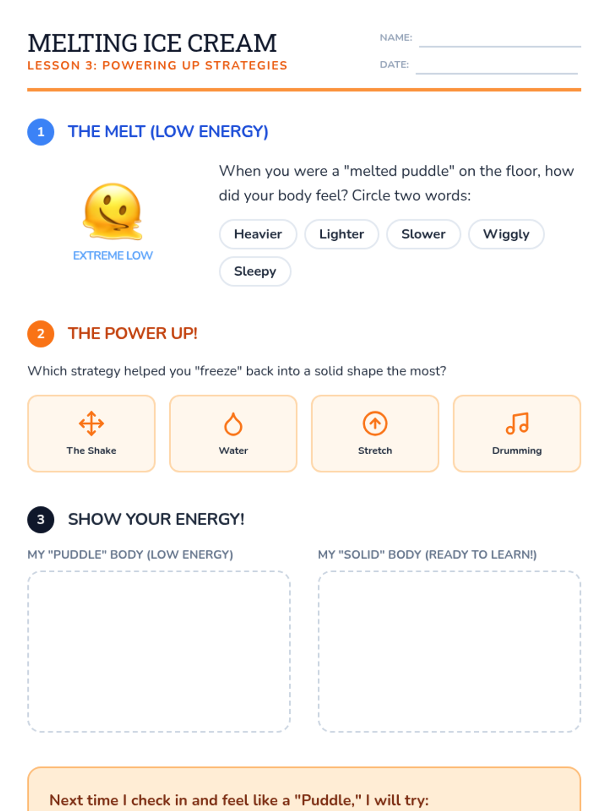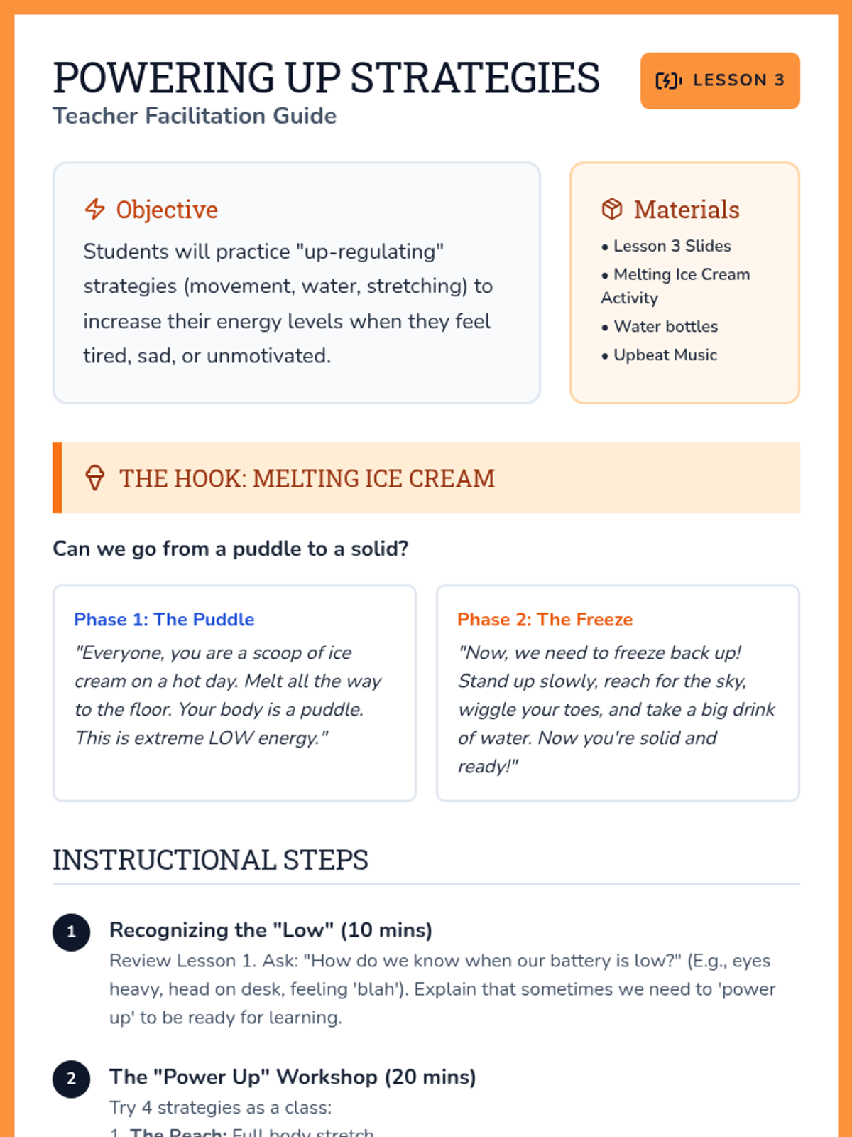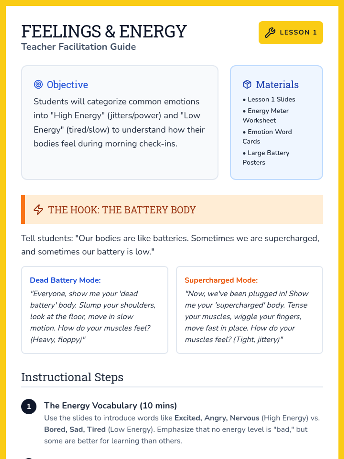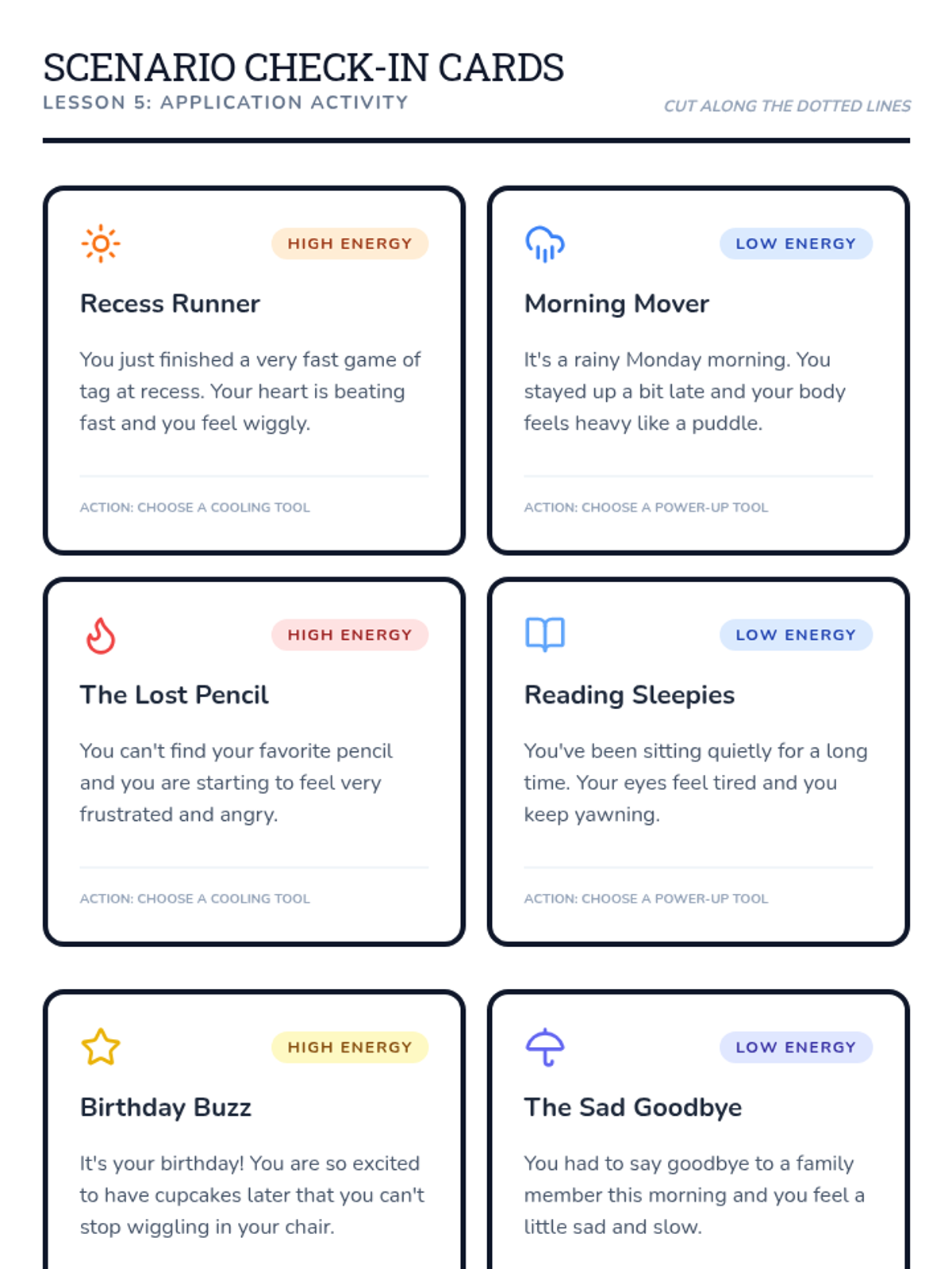 A 5-lesson sequence for 2nd graders that teaches how to identify emotional energy levels and select appropriate self-regulation strategies during daily check-ins. Students move from 'naming' their energy state to 'taming' or 'powering it up' using a personalized toolkit of physical and mental techniques.