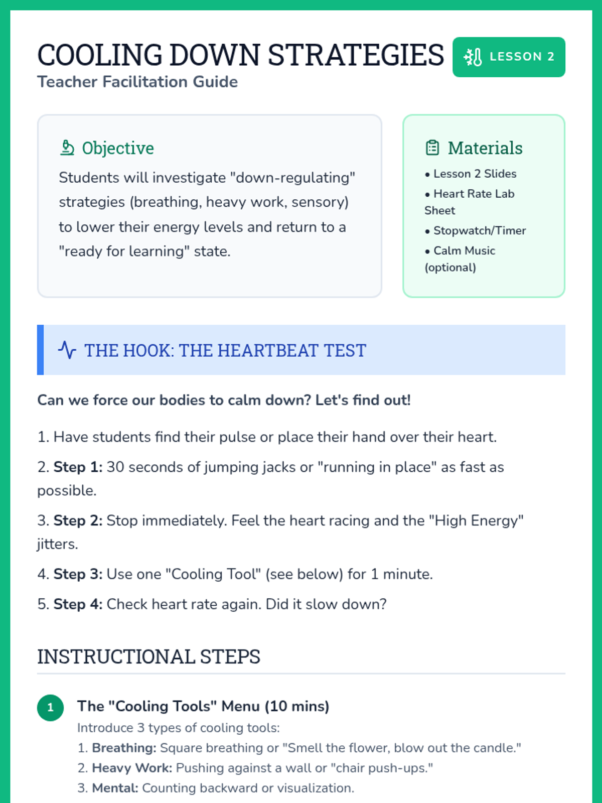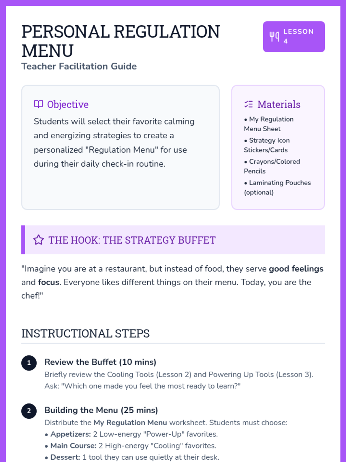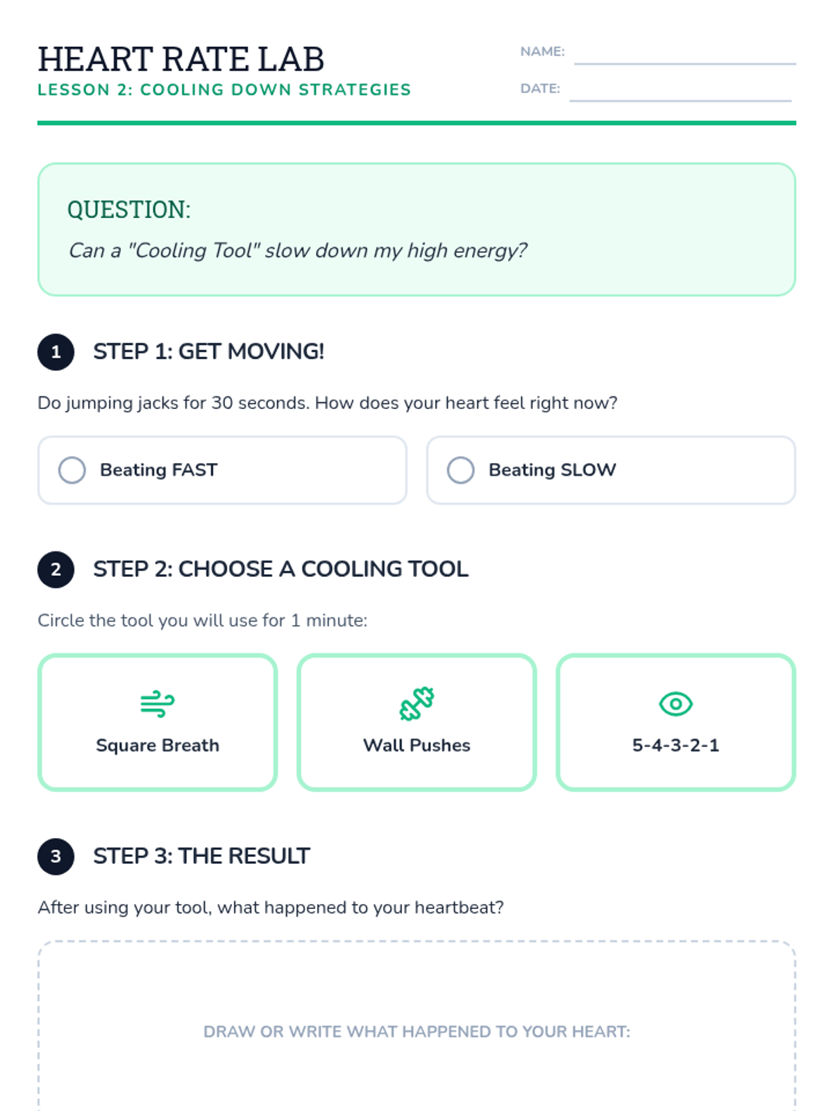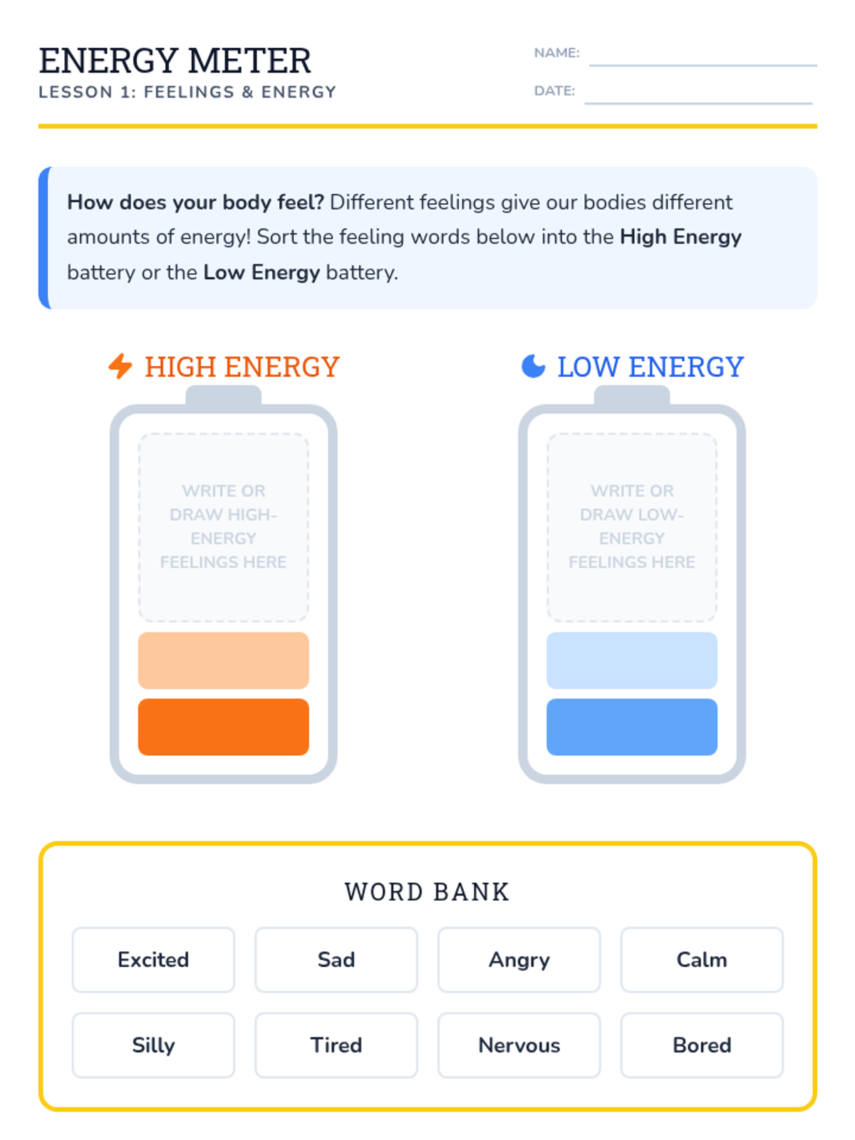 A 5-lesson sequence for 2nd graders that teaches how to identify emotional energy levels and select appropriate self-regulation strategies during daily check-ins. Students move from 'naming' their energy state to 'taming' or 'powering it up' using a personalized toolkit of physical and mental techniques.