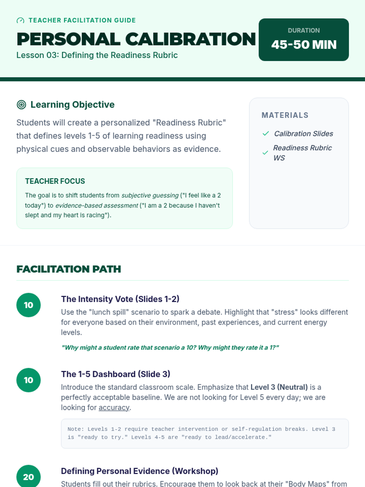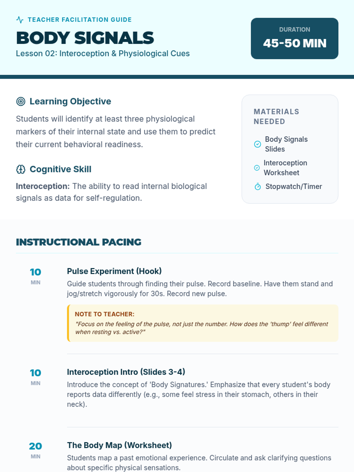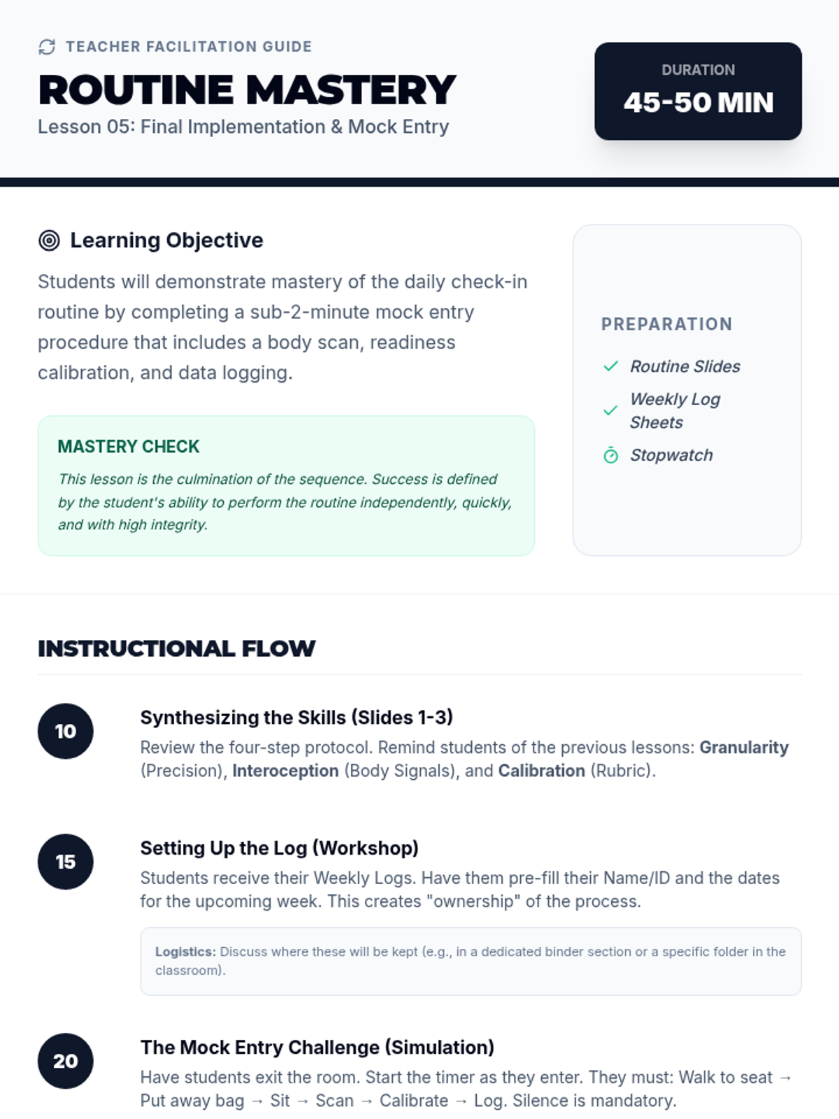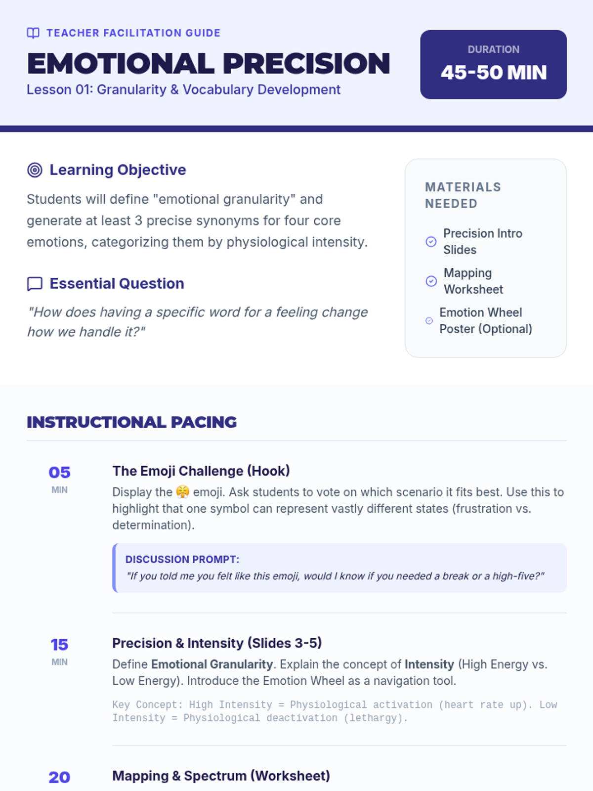 A 5-lesson sequence designed to help 9th-grade students develop emotional granularity, recognize physiological stress cues, and establish a reliable daily check-in routine for behavioral and academic success.