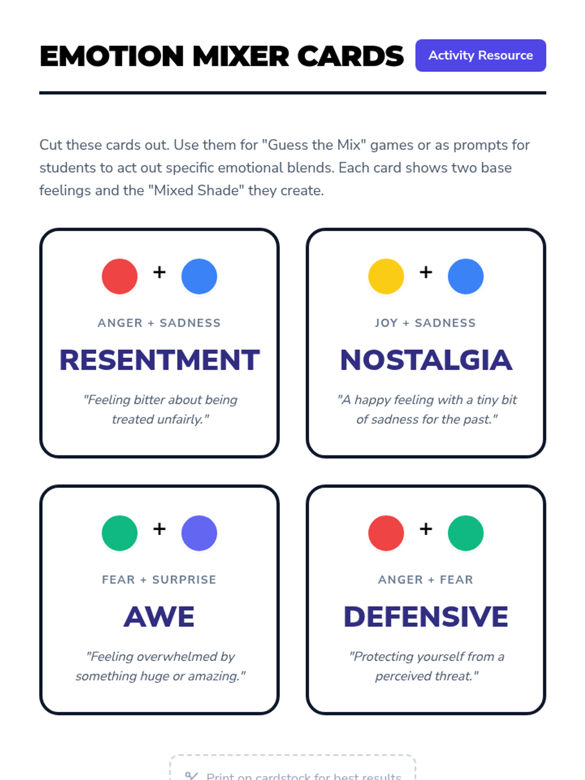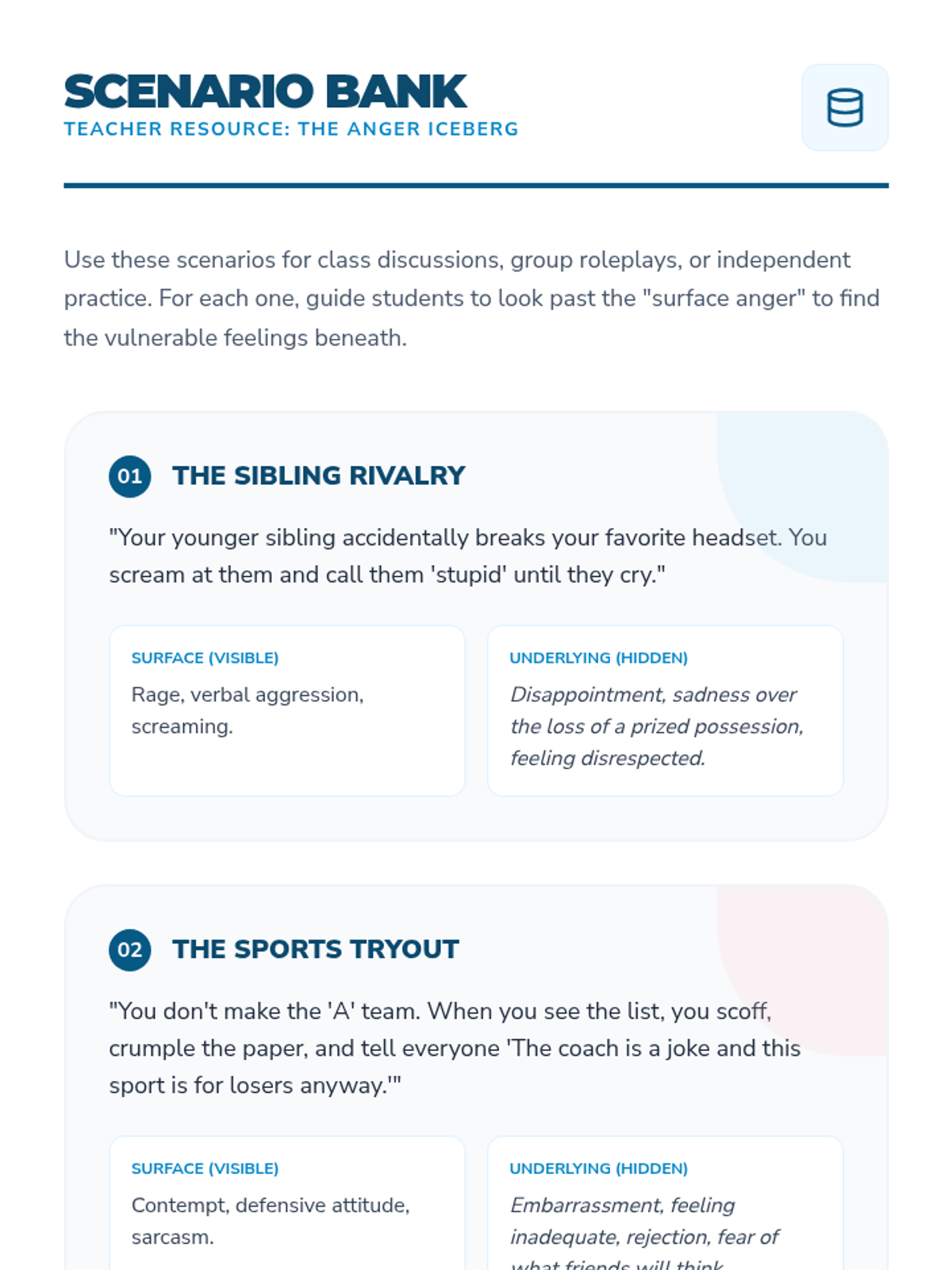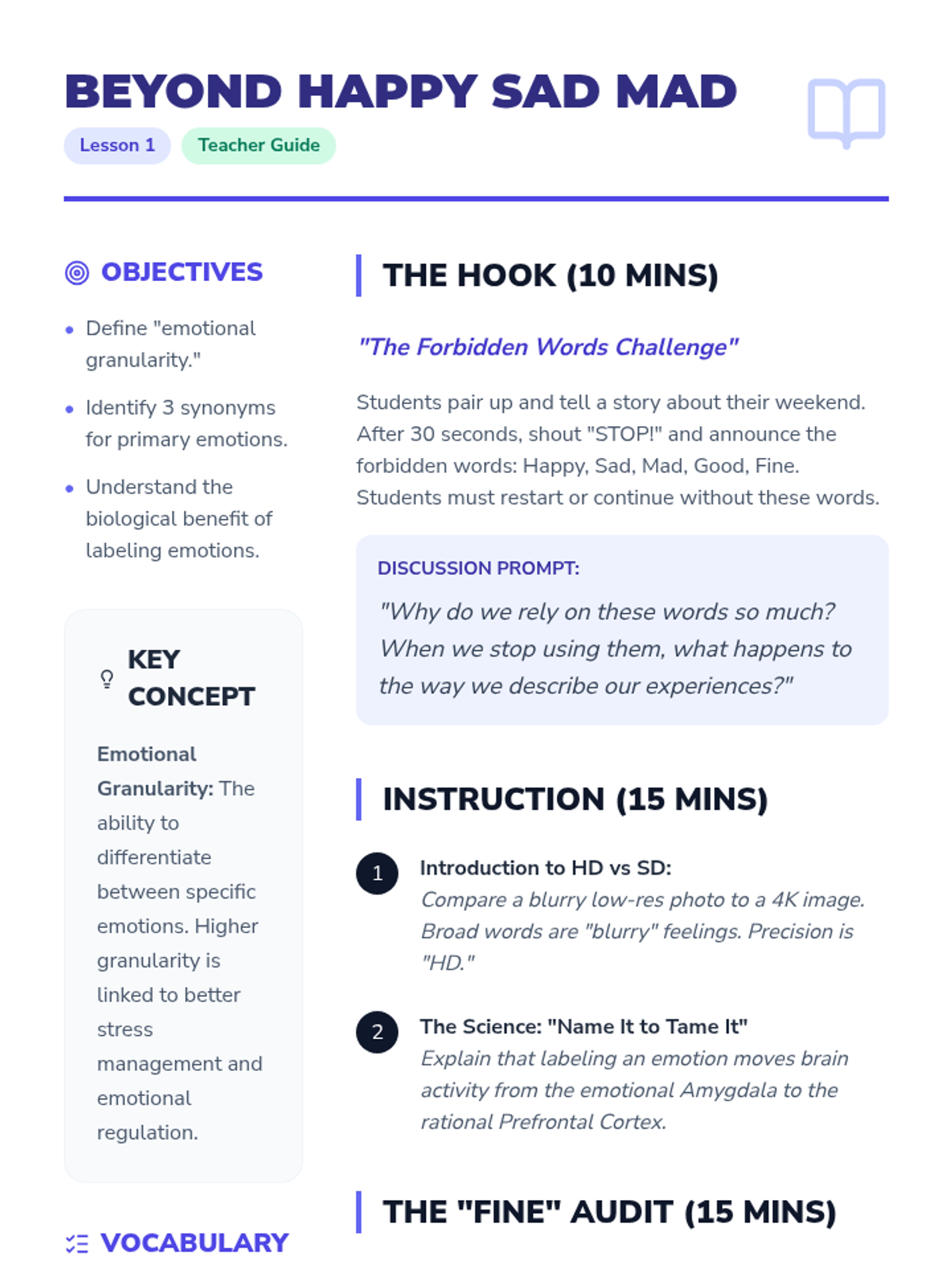 This sequence helps 6th-grade students transition from basic emotional labels (happy, sad, mad) to a more nuanced 'high-definition' vocabulary. Through game-based learning and interactive workshops, students explore emotional granularity, the 'Anger Iceberg' concept, and the impact of precise labeling on communication and self-advocacy.