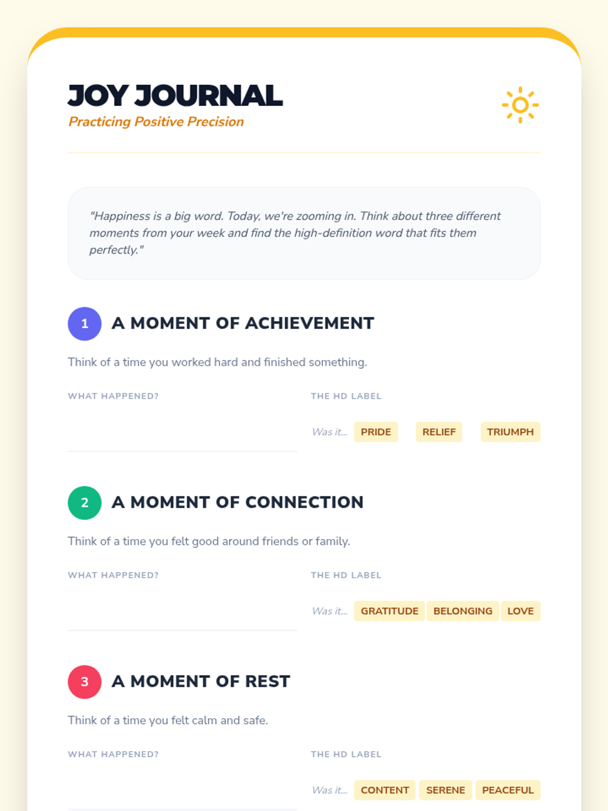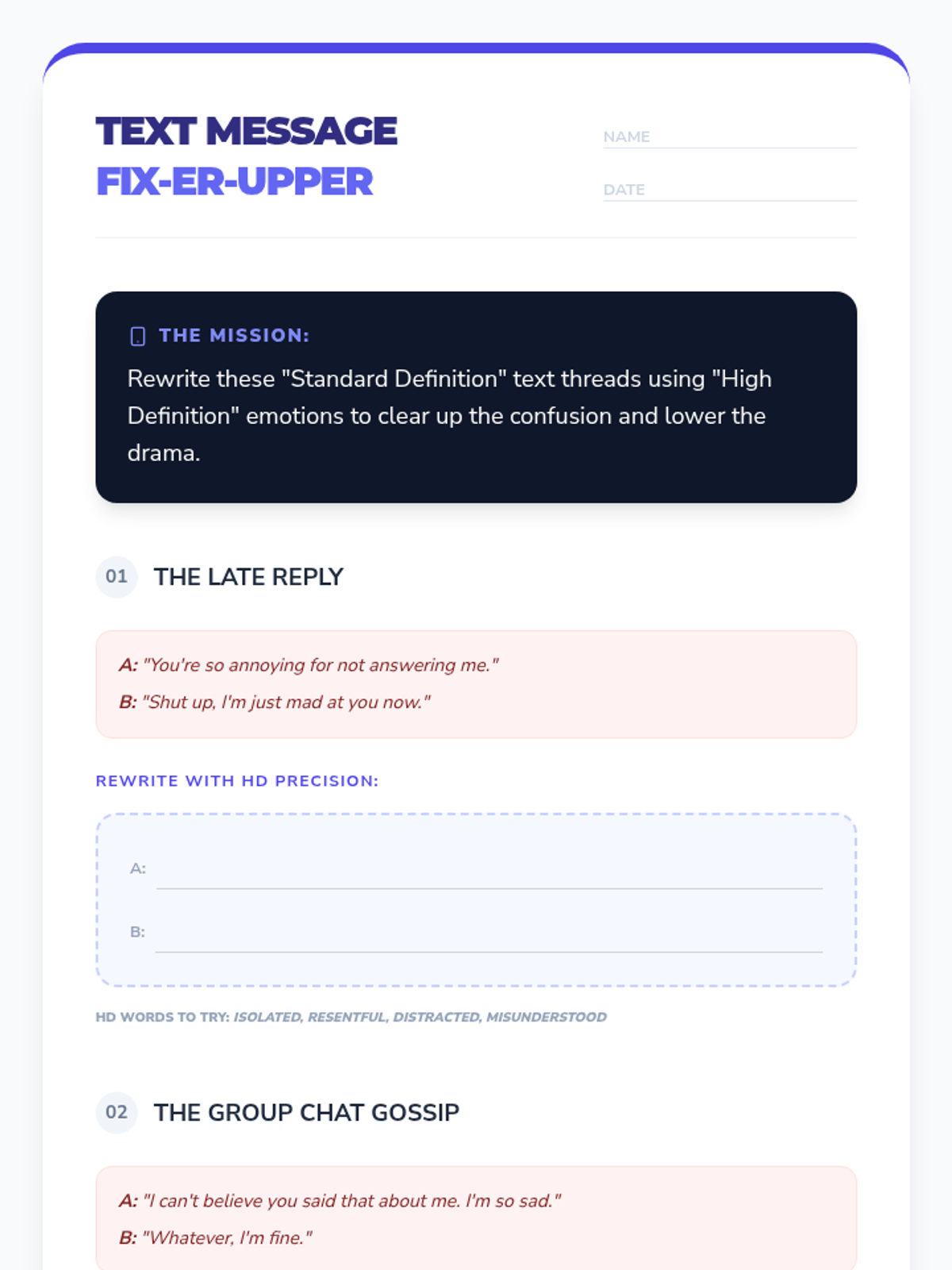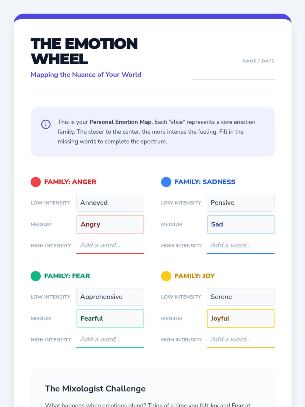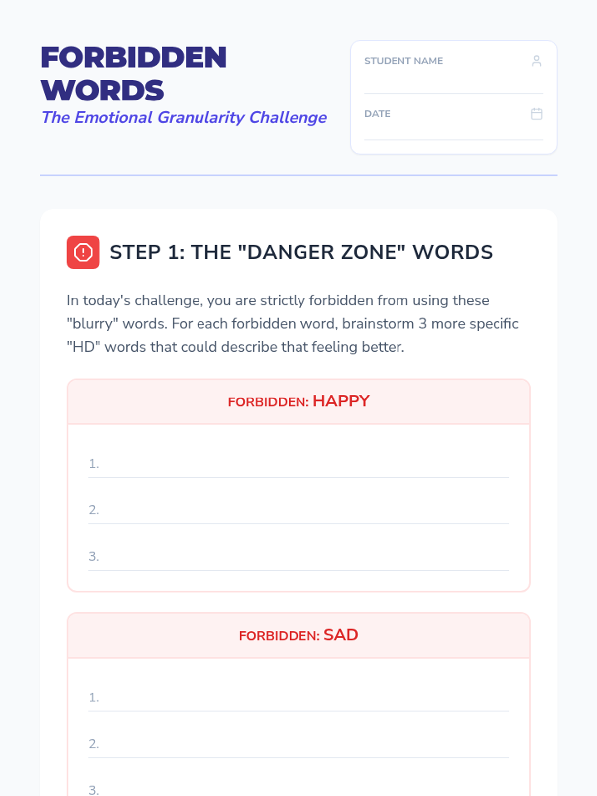 This sequence helps 6th-grade students transition from basic emotional labels (happy, sad, mad) to a more nuanced 'high-definition' vocabulary. Through game-based learning and interactive workshops, students explore emotional granularity, the 'Anger Iceberg' concept, and the impact of precise labeling on communication and self-advocacy.