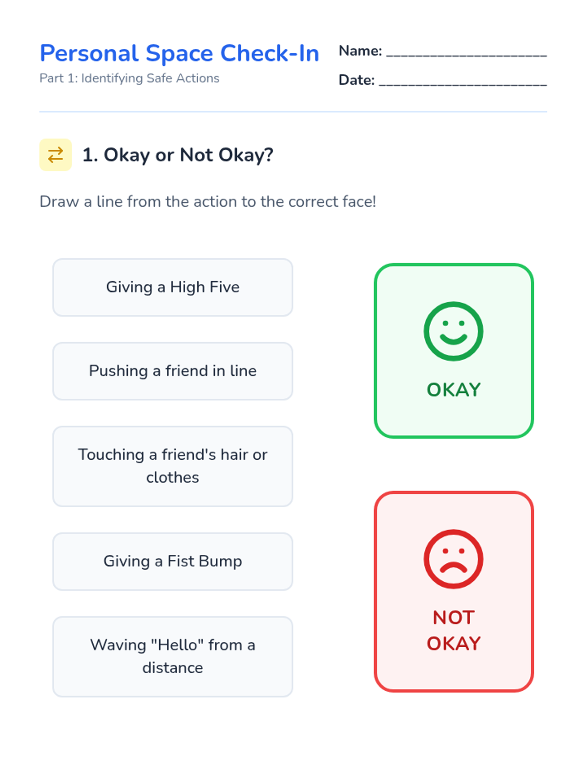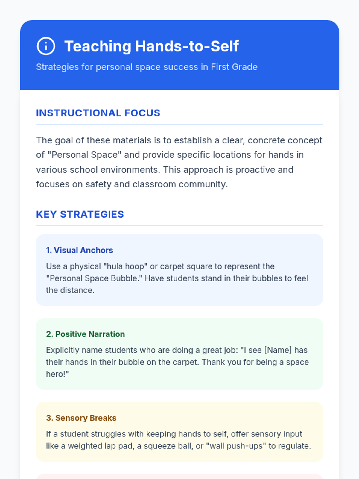 A sequence of lessons focused on essential social and behavioral skills for first-grade students, including physical boundaries and verbal impulse control.