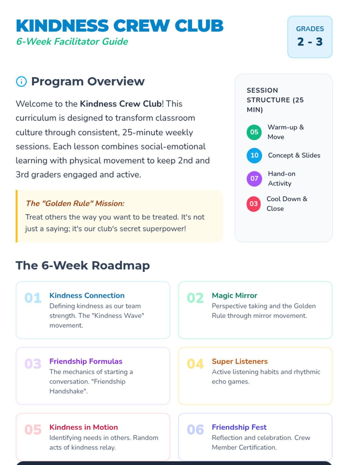 A comprehensive 6-week social-emotional learning curriculum for 2nd and 3rd graders focused on kindness, the Golden Rule, and building healthy friendships through movement and active engagement.