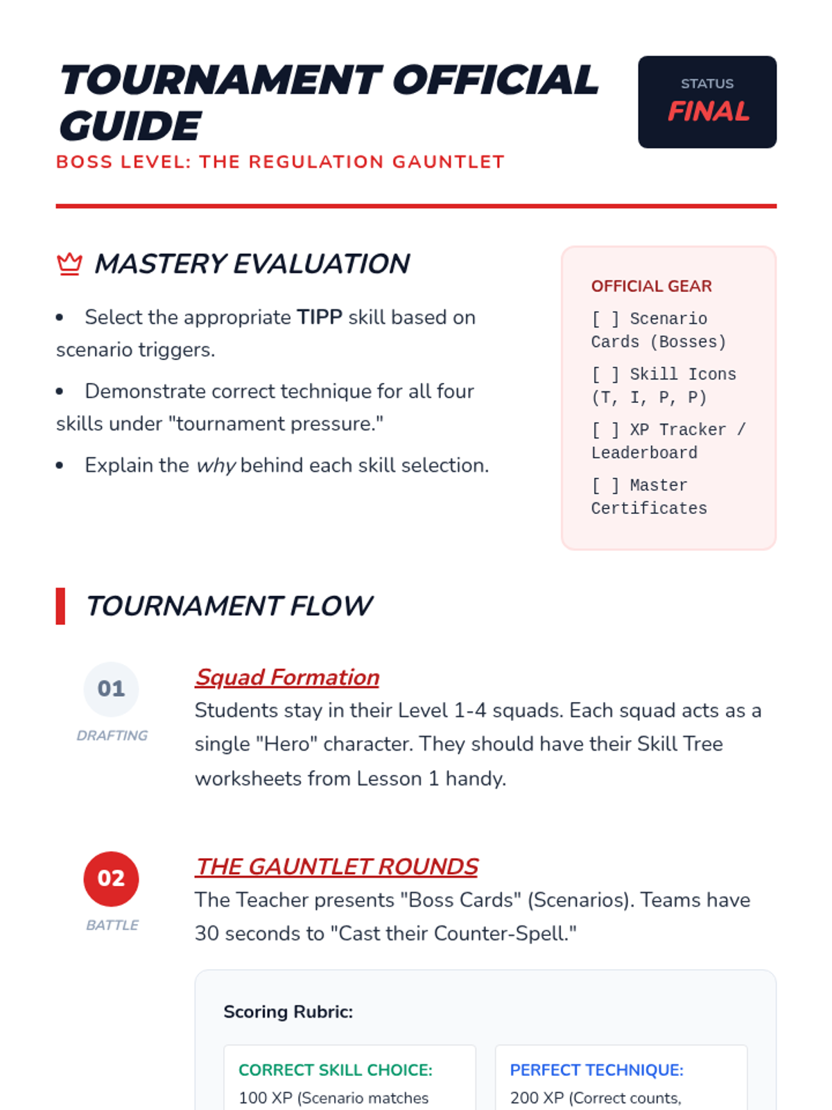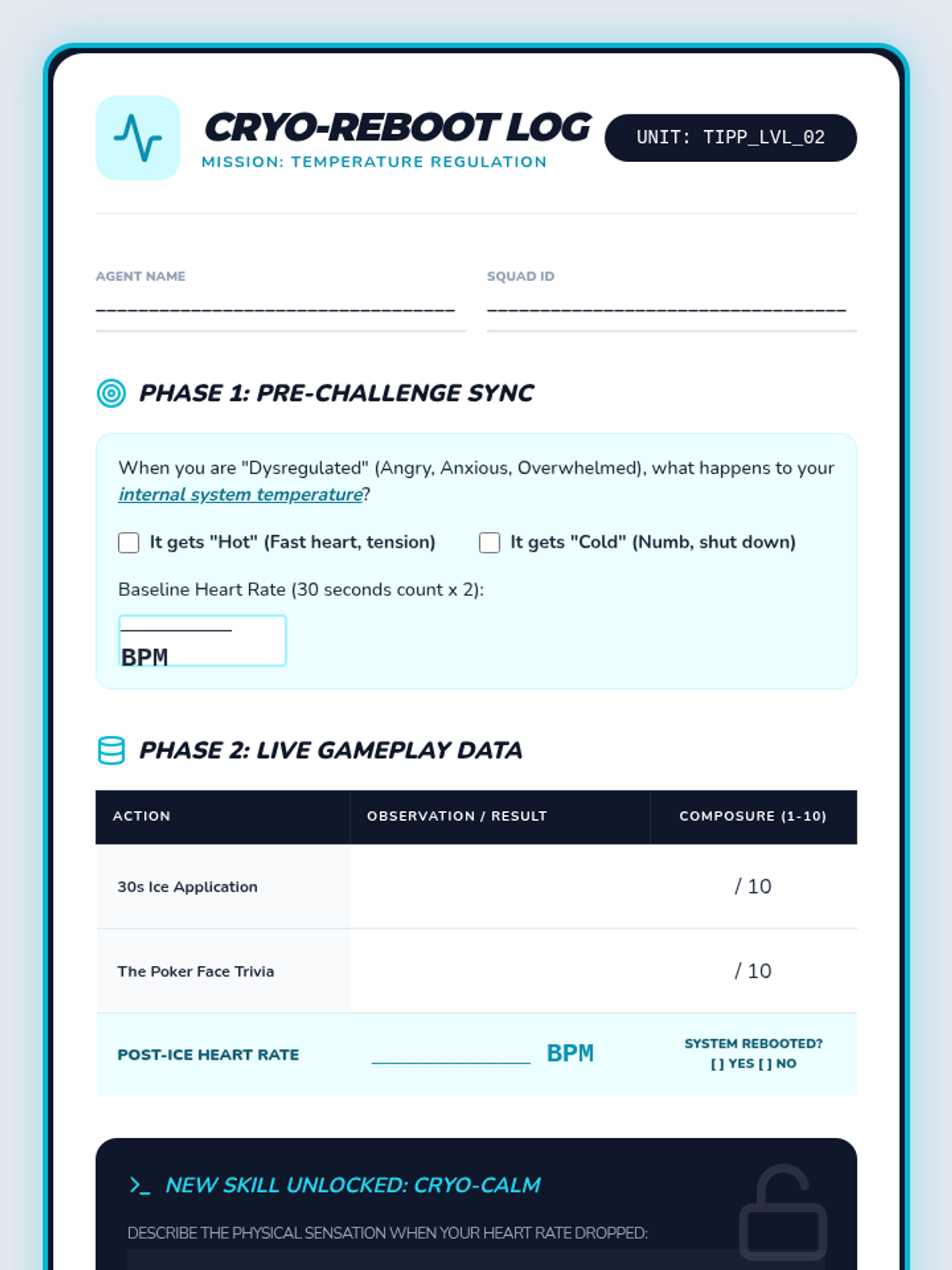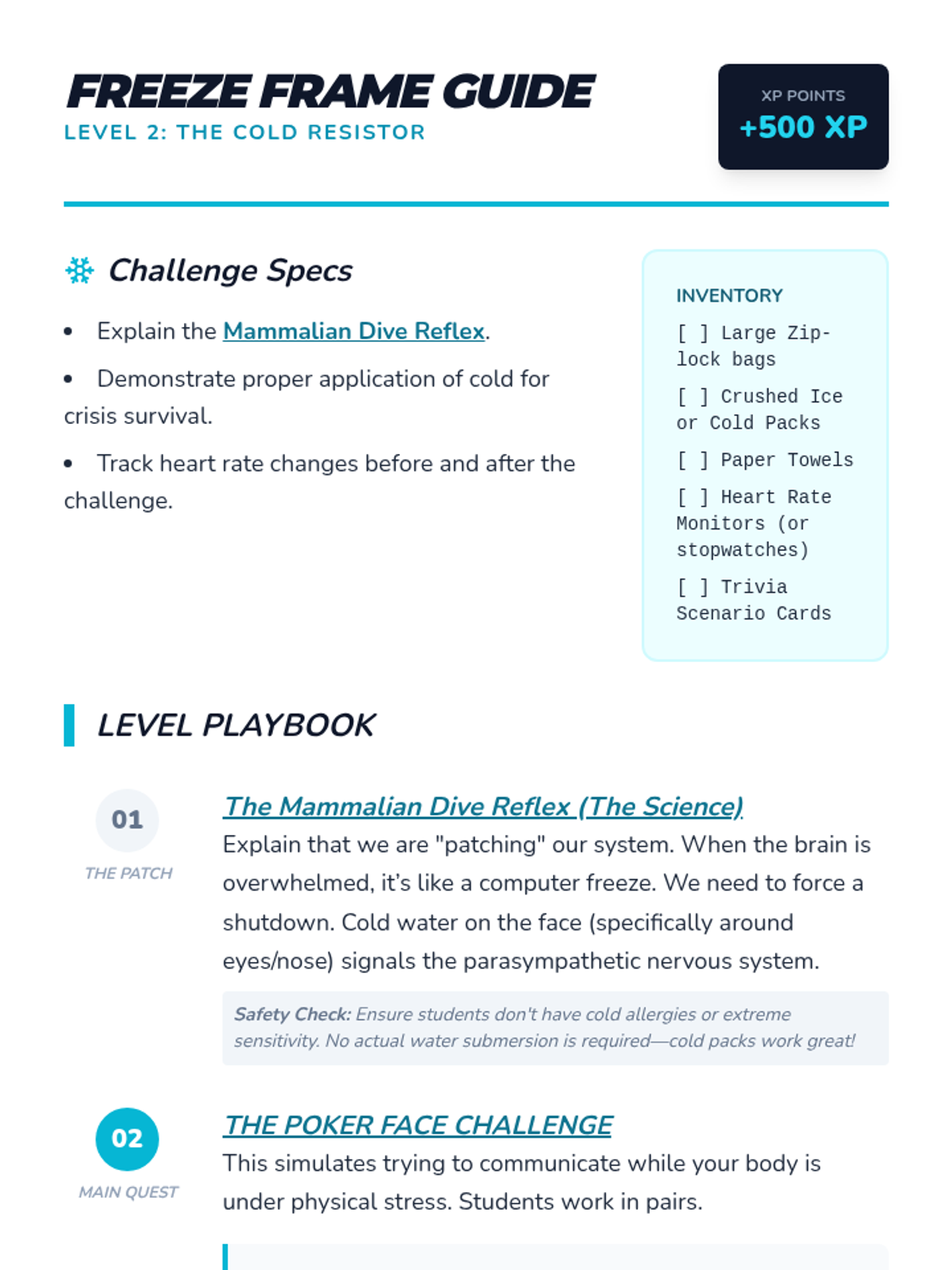 A 5-lesson sequence for 7th graders that gamifies the TIPP (Temperature, Intense Exercise, Paced Breathing, Paired Muscle Relaxation) crisis survival skills. Students 'level up' their emotional regulation through challenges, simulations, and a final mastery tournament.
