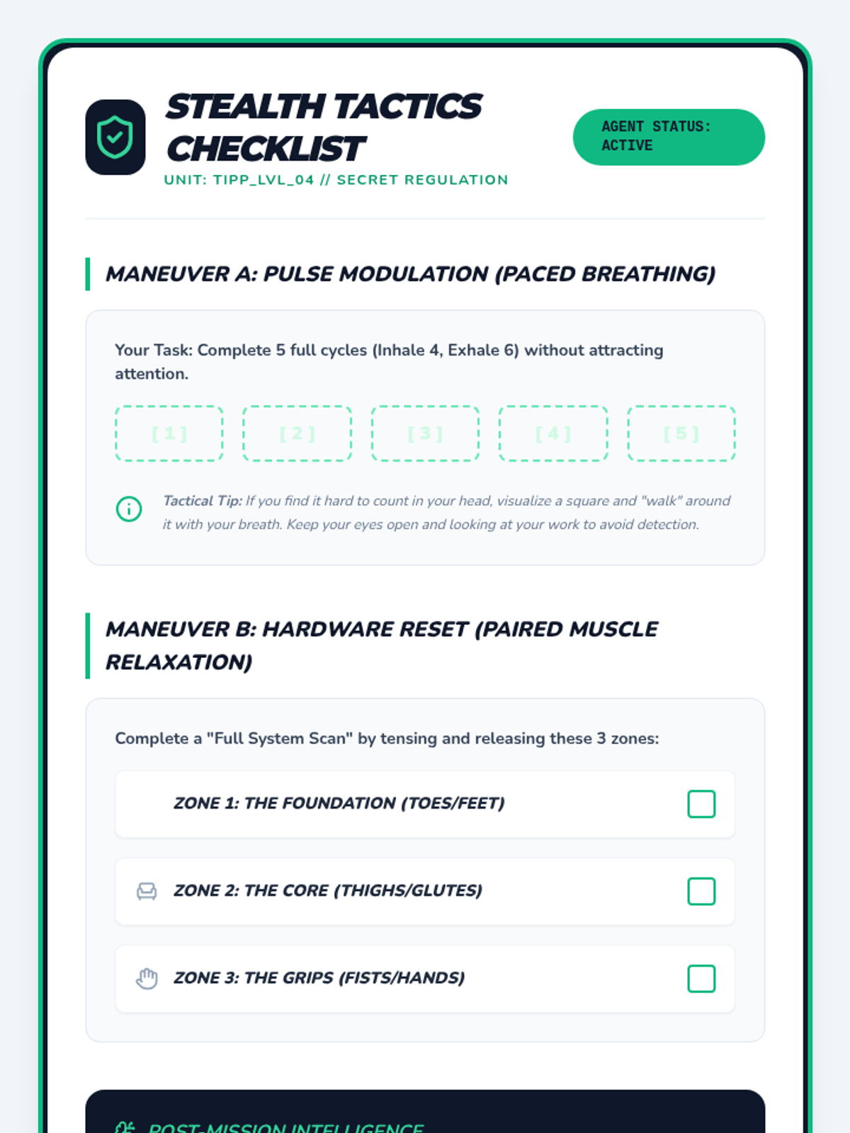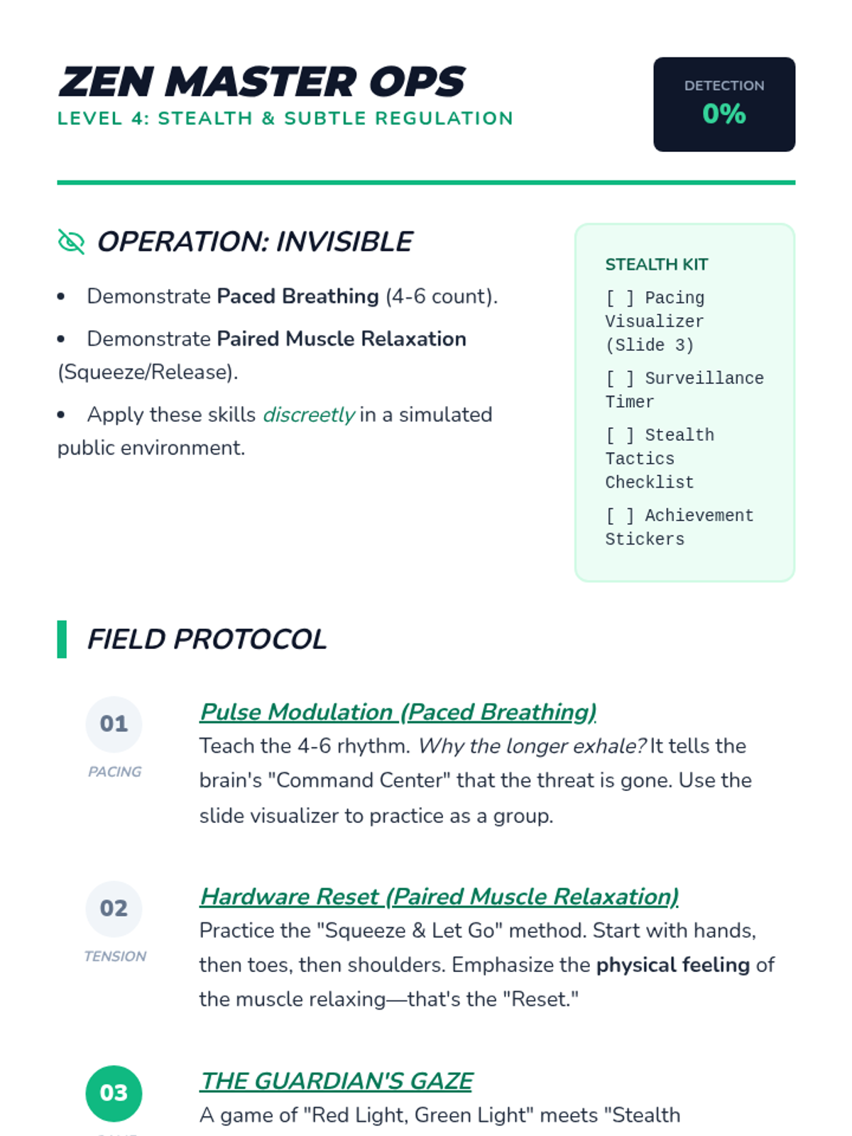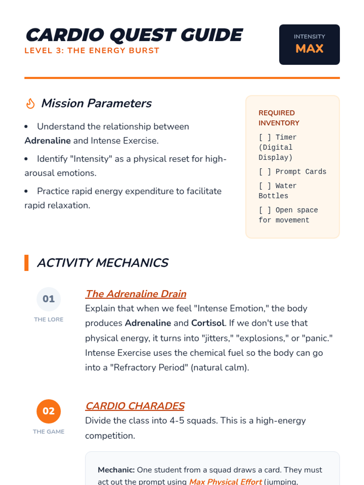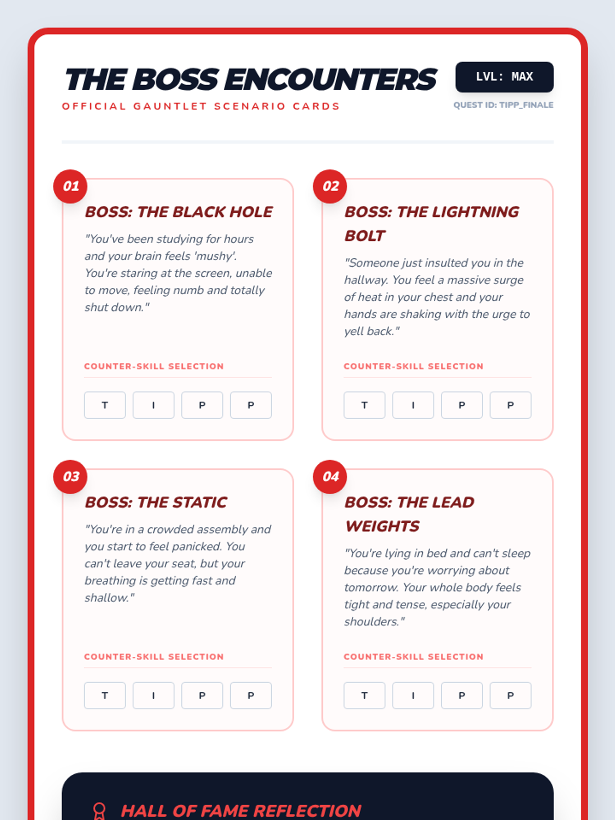 A 5-lesson sequence for 7th graders that gamifies the TIPP (Temperature, Intense Exercise, Paced Breathing, Paired Muscle Relaxation) crisis survival skills. Students 'level up' their emotional regulation through challenges, simulations, and a final mastery tournament.