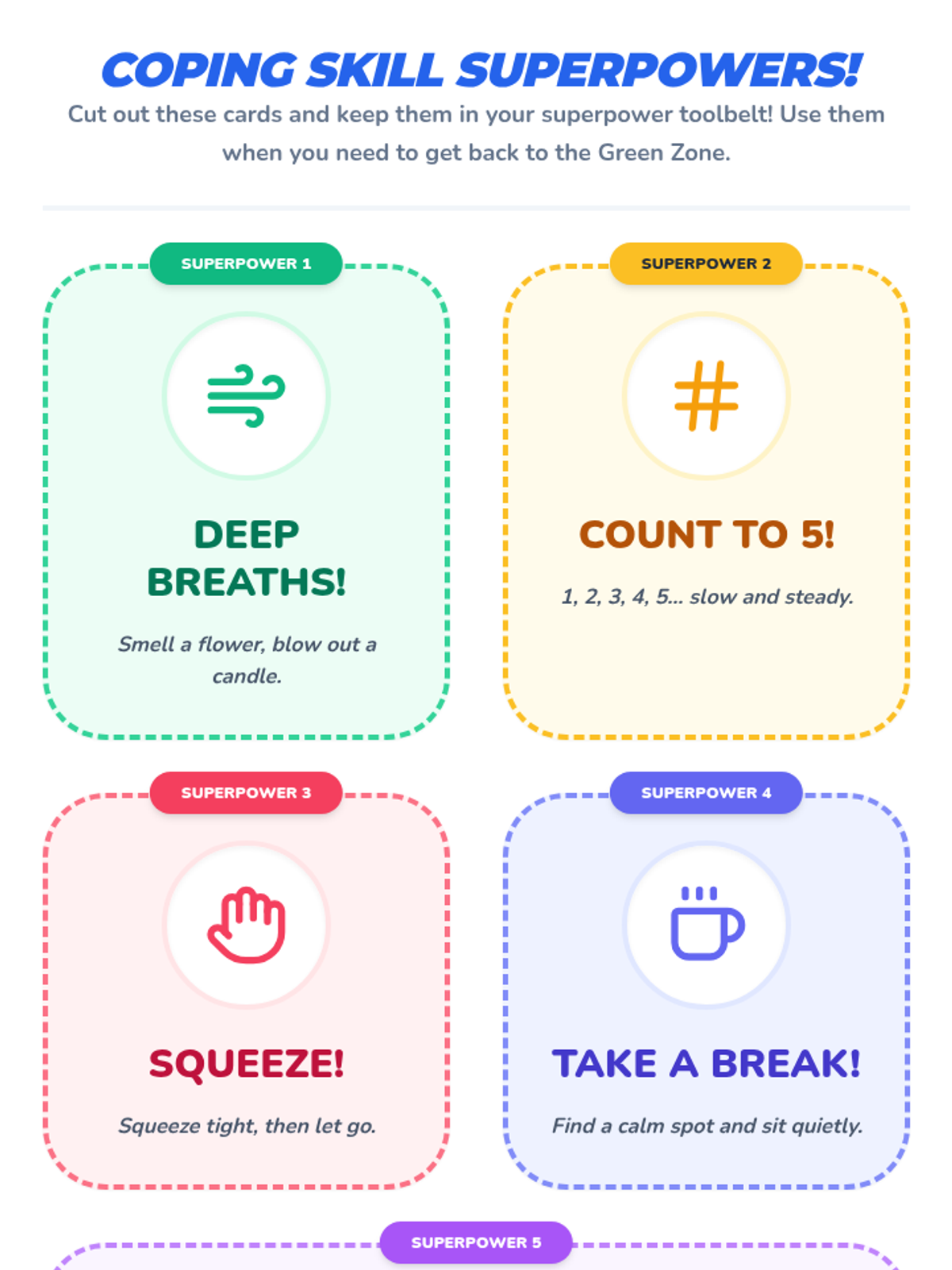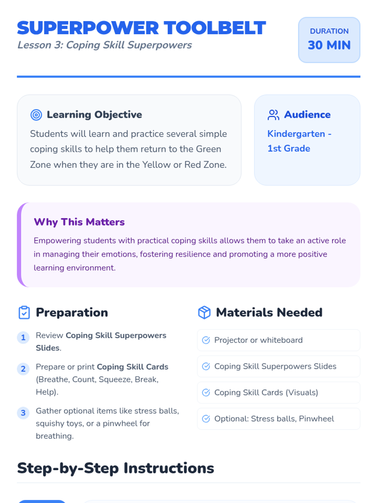 A three-part scaffolded lesson series for Kindergarten and 1st-grade students introducing emotional zones, physical body clues, and coping strategies for self-regulation.