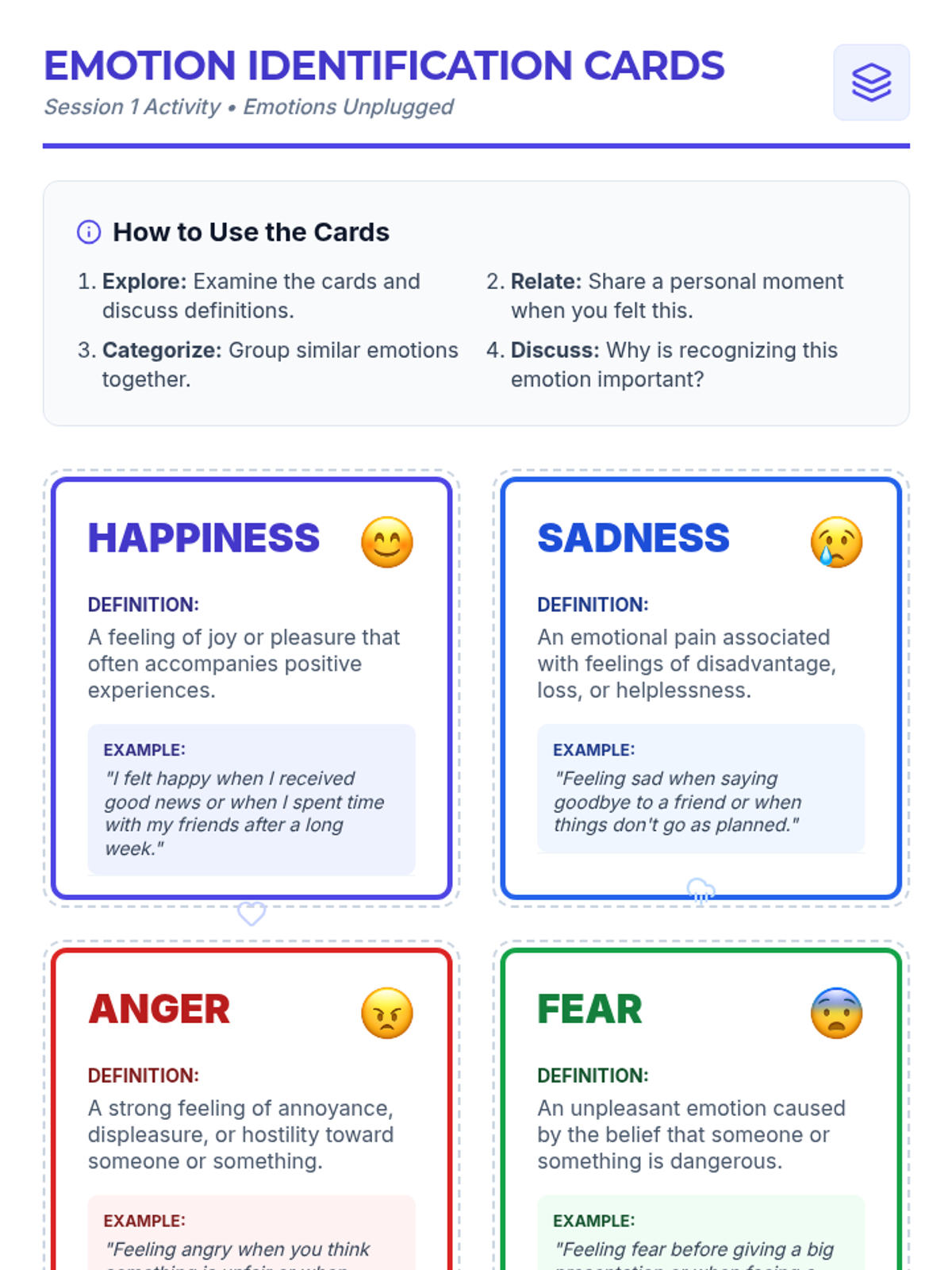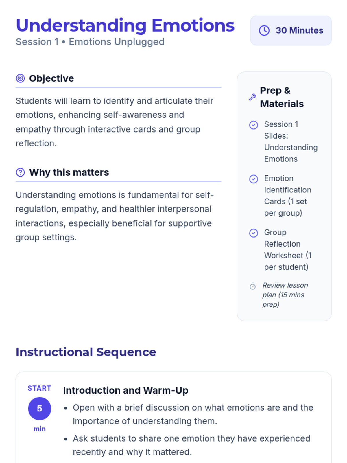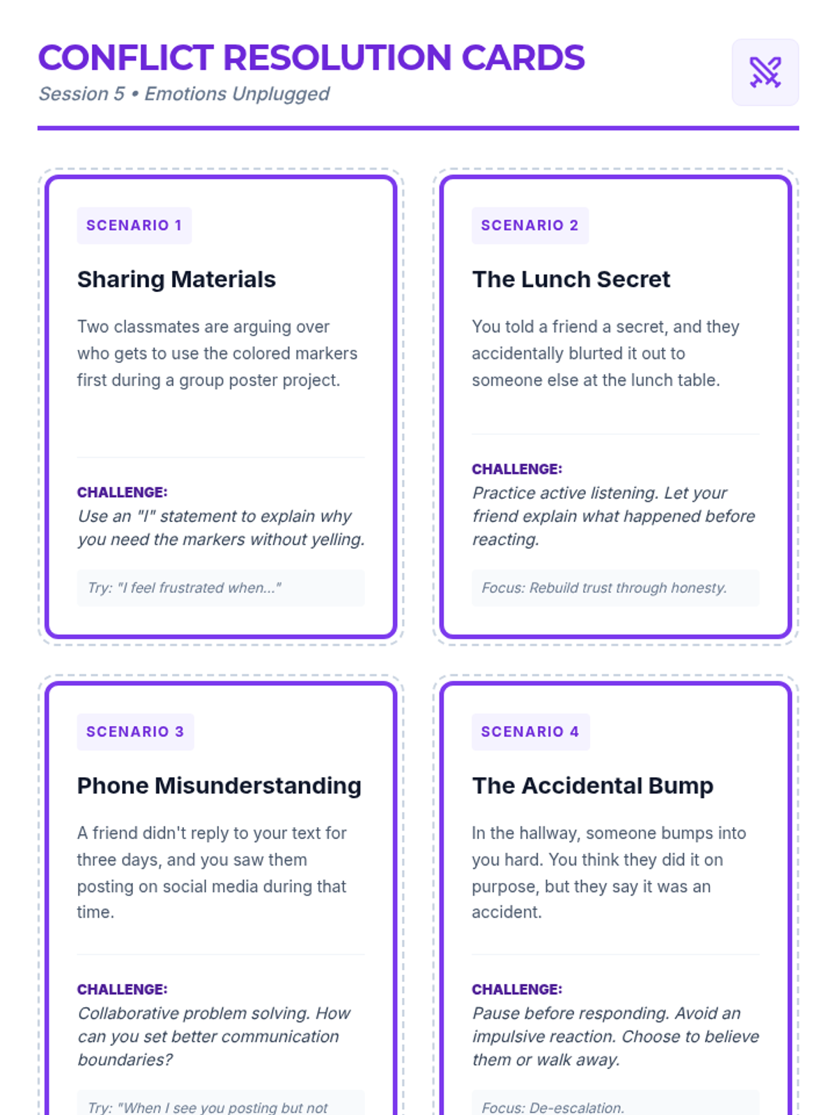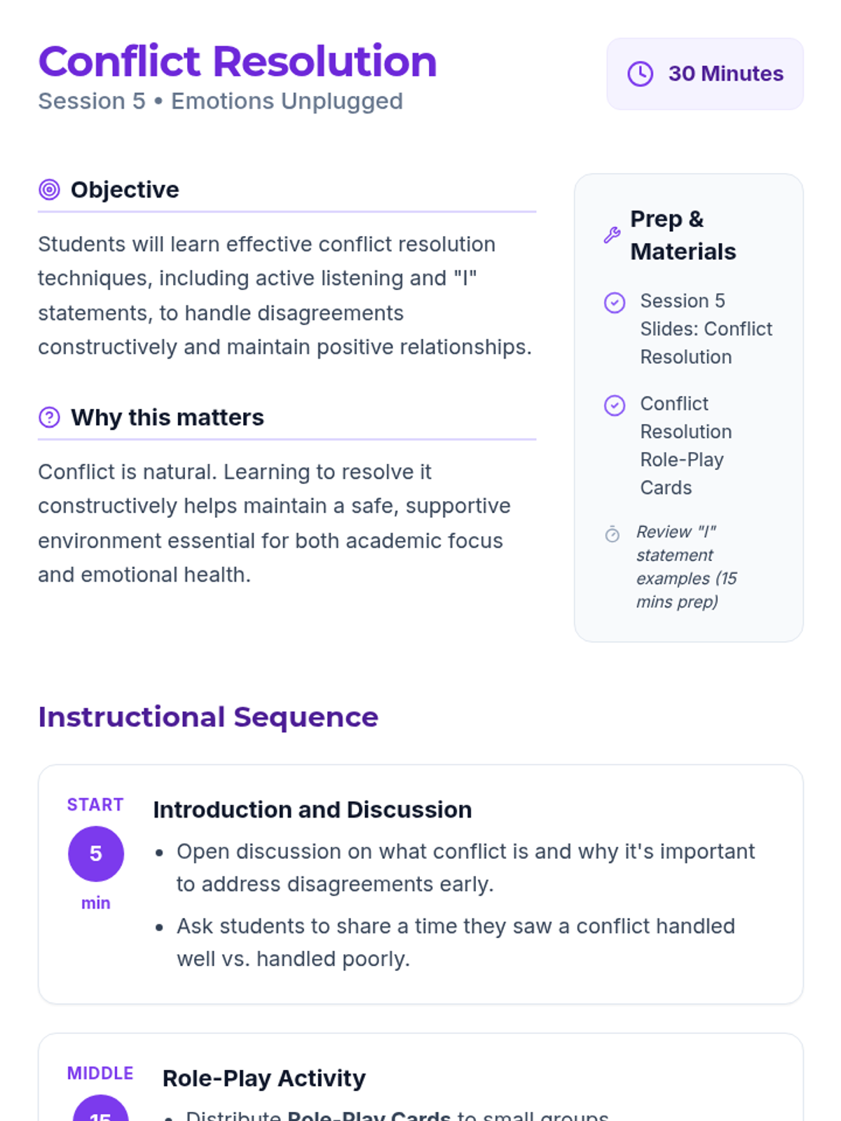 A 5-session social-emotional learning sequence for 7th grade small groups, focusing on identifying emotions, practicing empathy, managing feelings, building healthy relationships, and resolving conflicts.