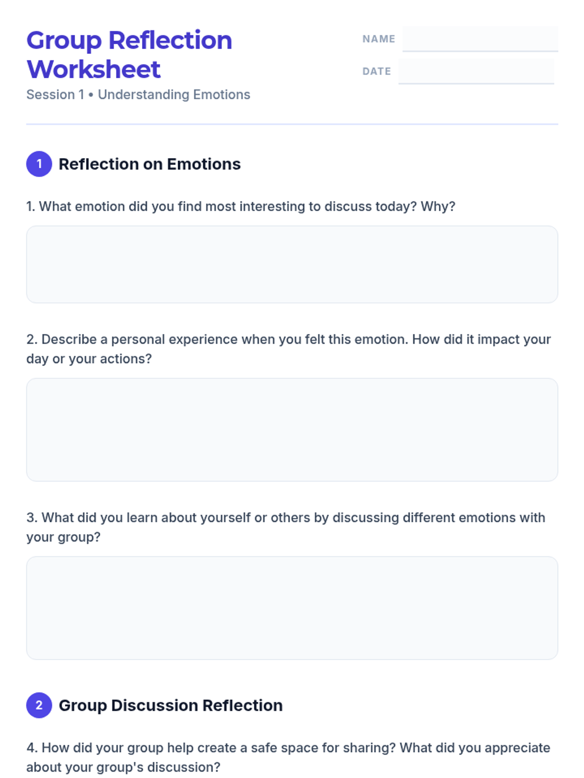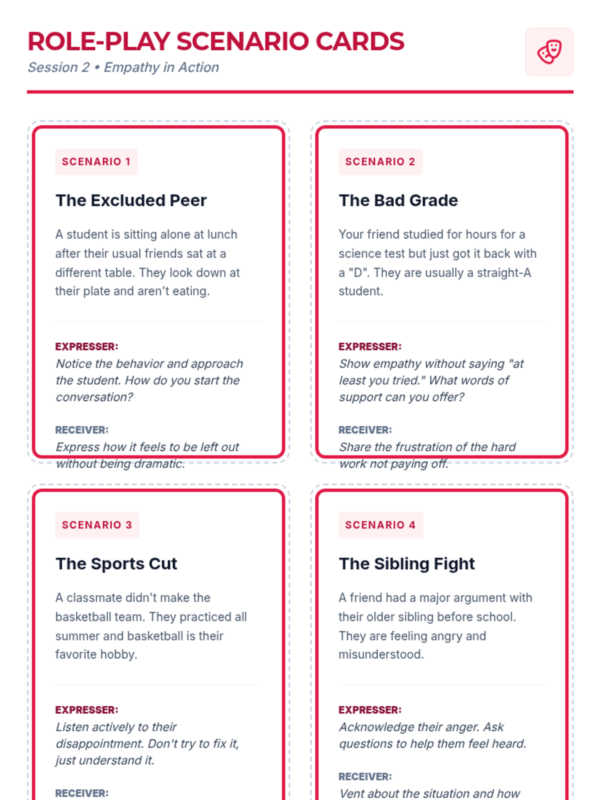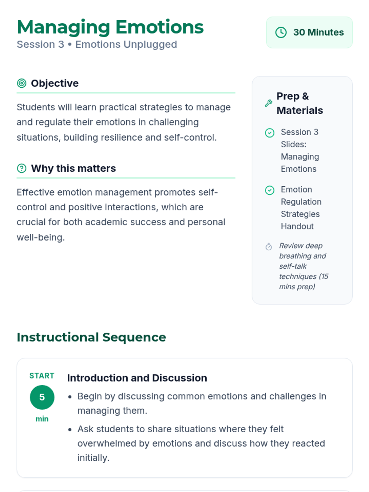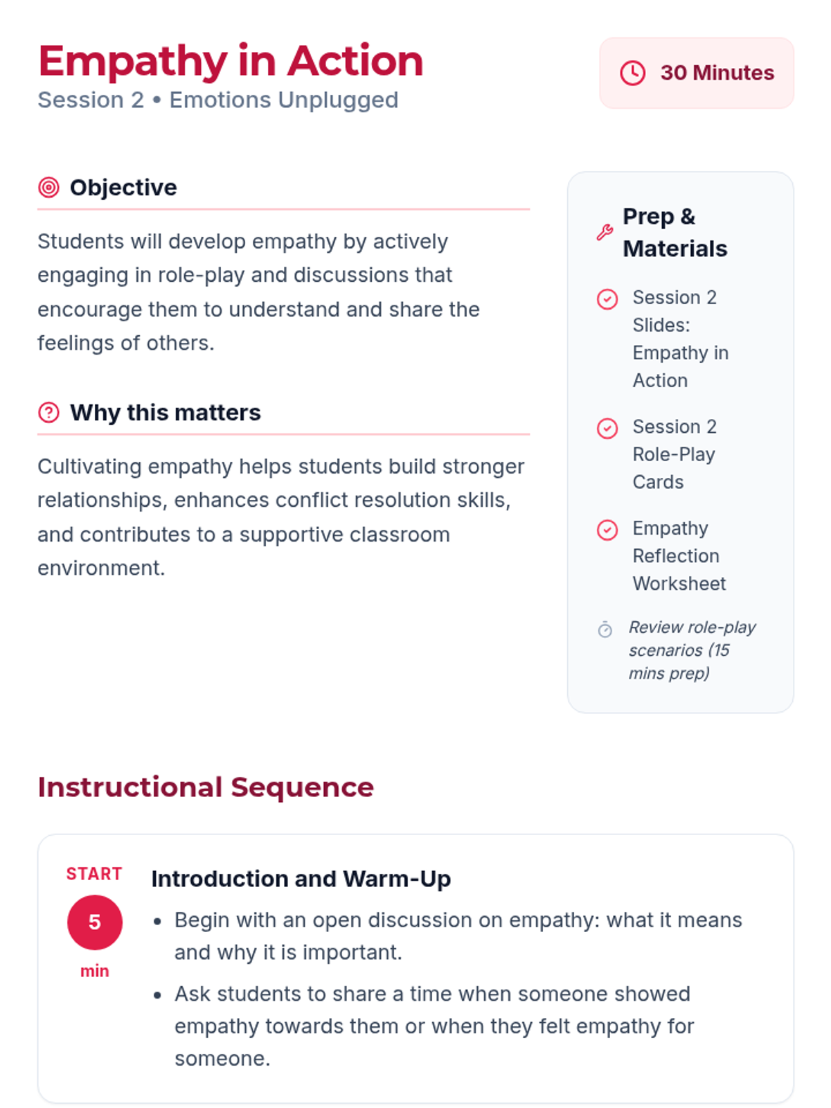 A 5-session social-emotional learning sequence for 7th grade small groups, focusing on identifying emotions, practicing empathy, managing feelings, building healthy relationships, and resolving conflicts.