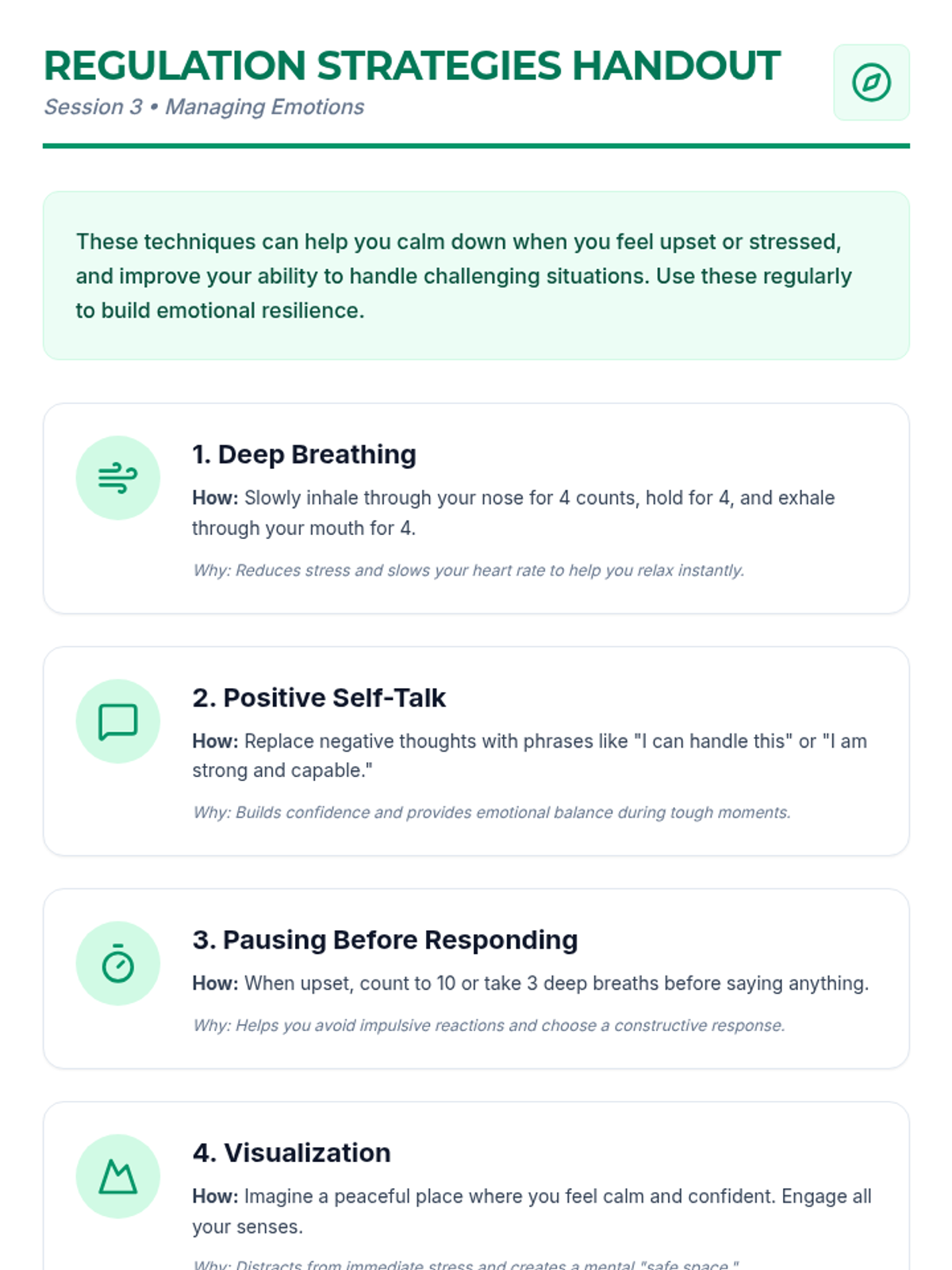 A comprehensive 8-session program designed for youth ages 9-18, focusing on essential life skills including self-esteem, resilience, time management, and conflict resolution through interactive role-plays and guided instruction.