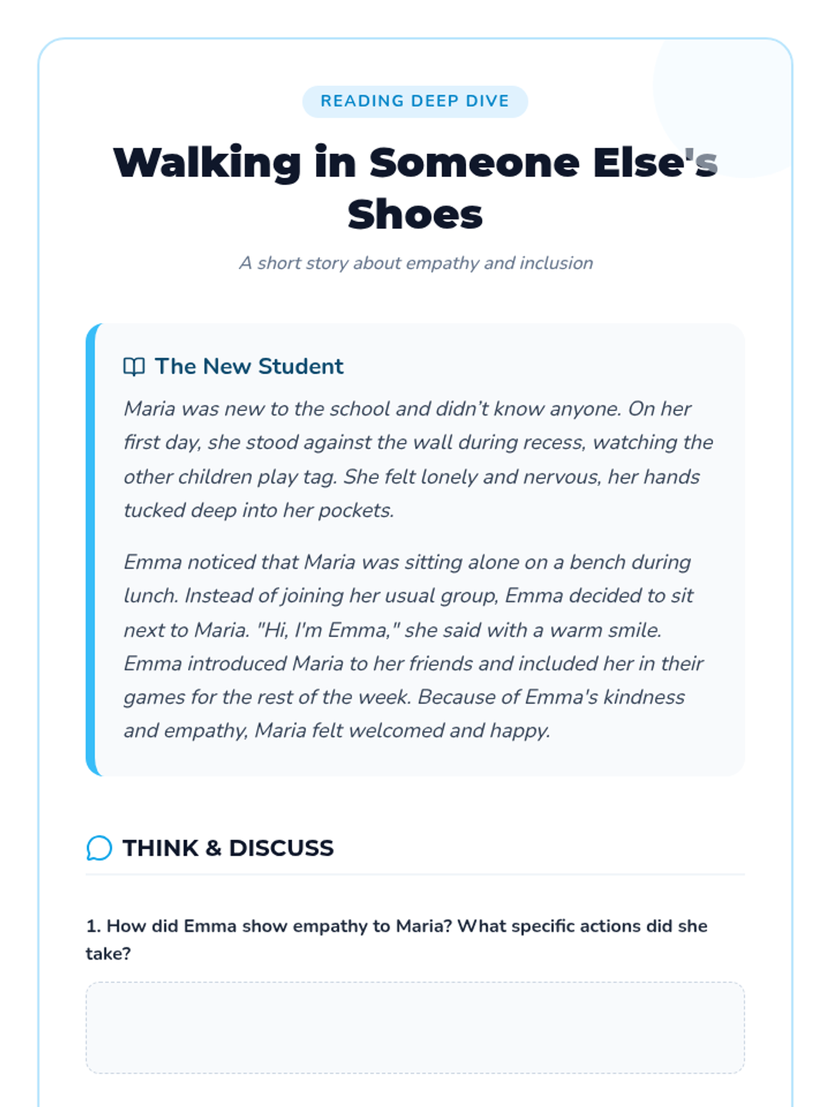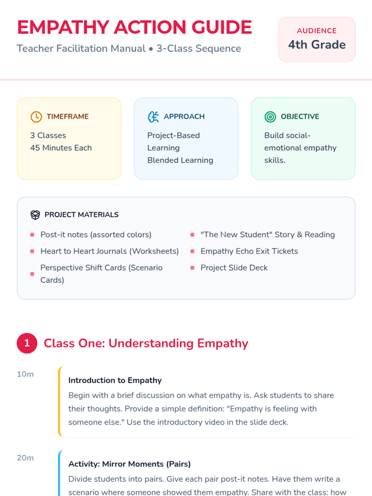 A three-part project for 4th graders designed to foster social-emotional intelligence through project-based learning. Students explore the definition of empathy, practice perspective-taking through scenarios, and reflect on their personal experiences.